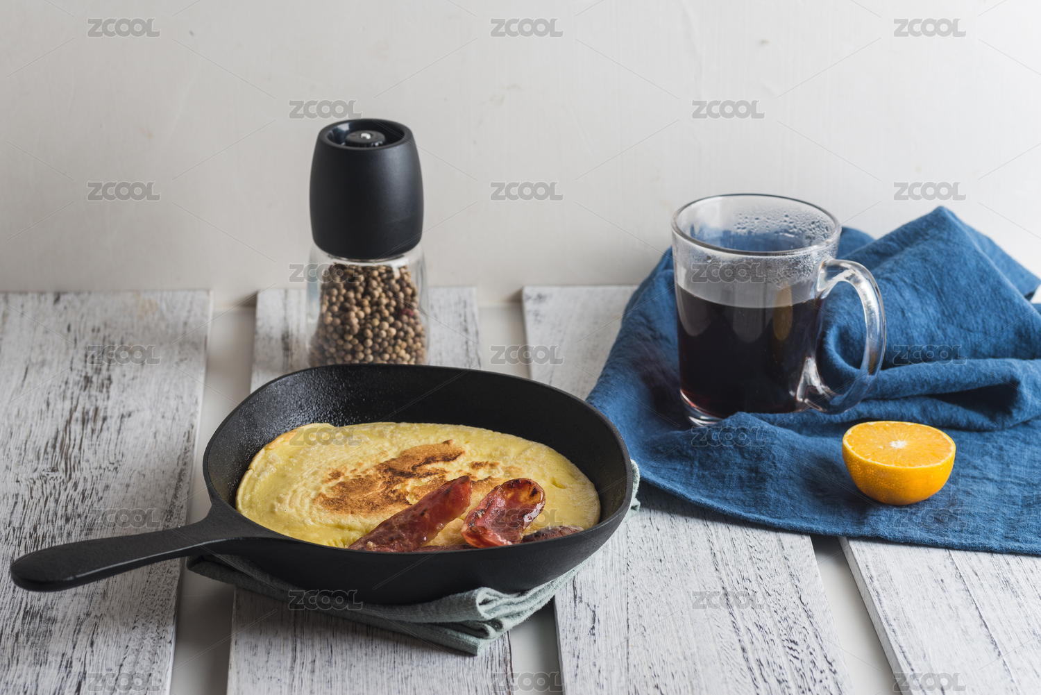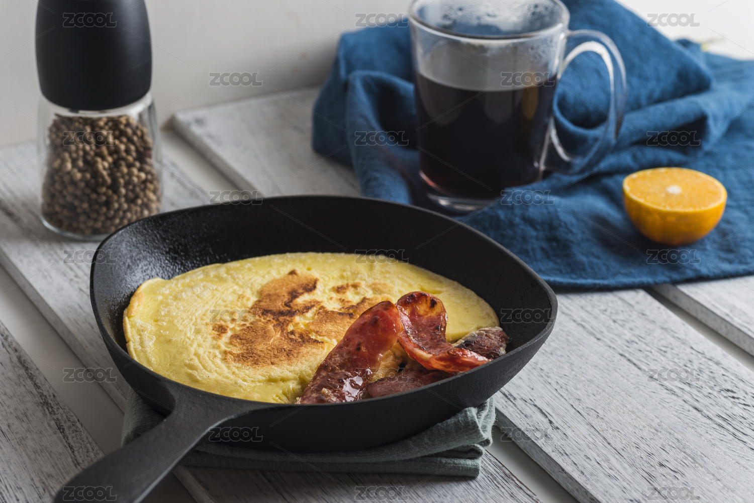 搭配美式咖啡的香肠片和鸡蛋饼早餐