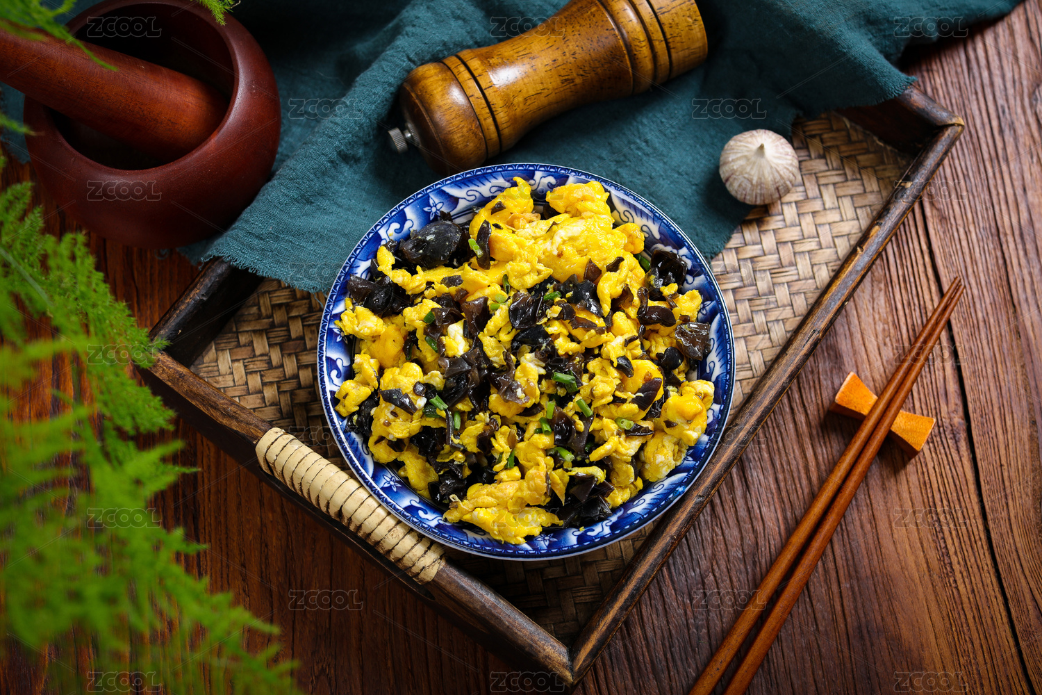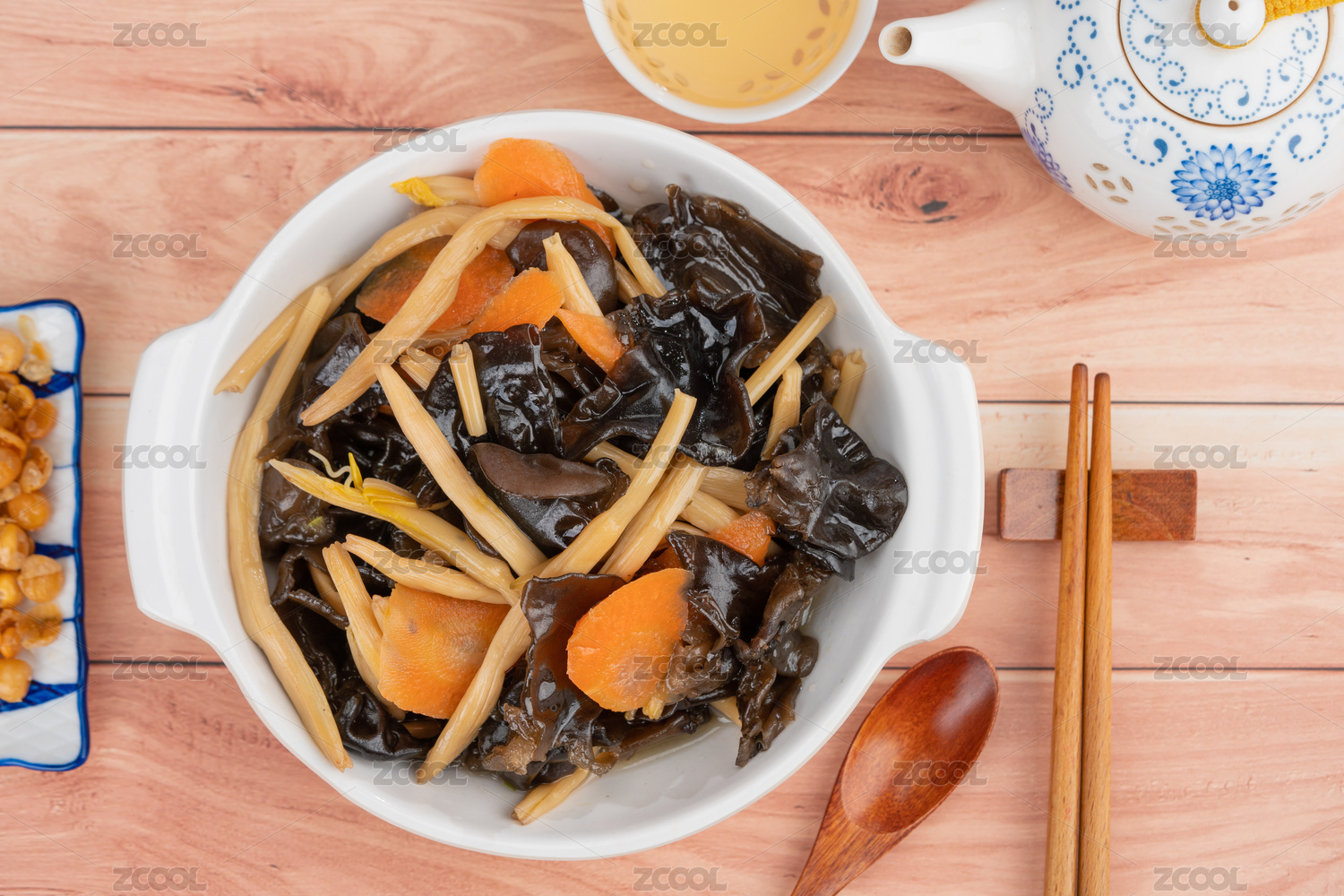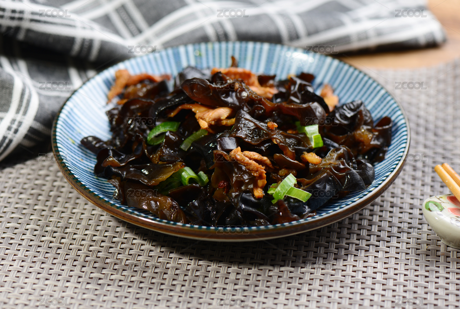 灰色方格布纹背景下的炒木耳配饭