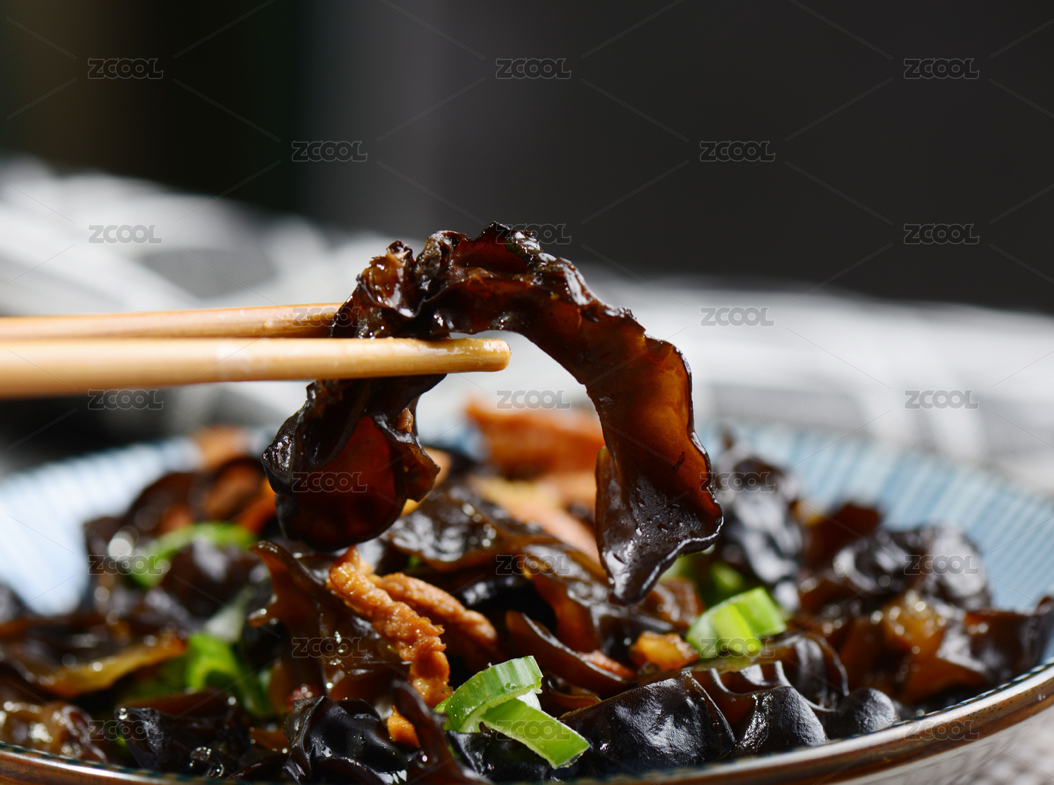 深色背景筷子夹的山间野味炒木耳