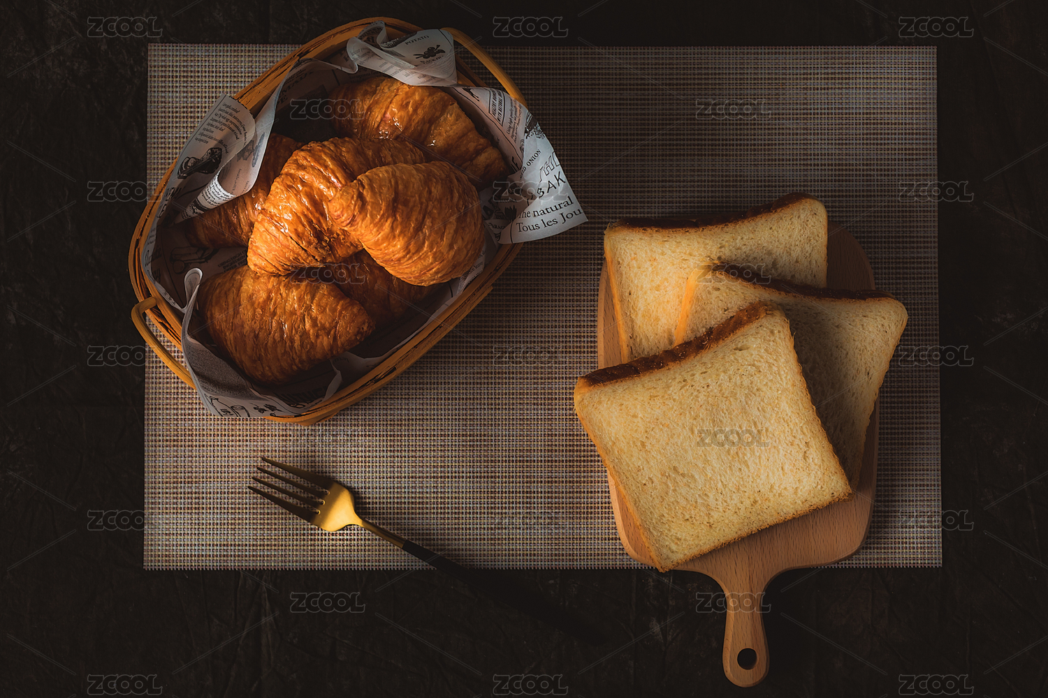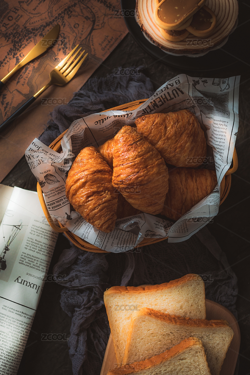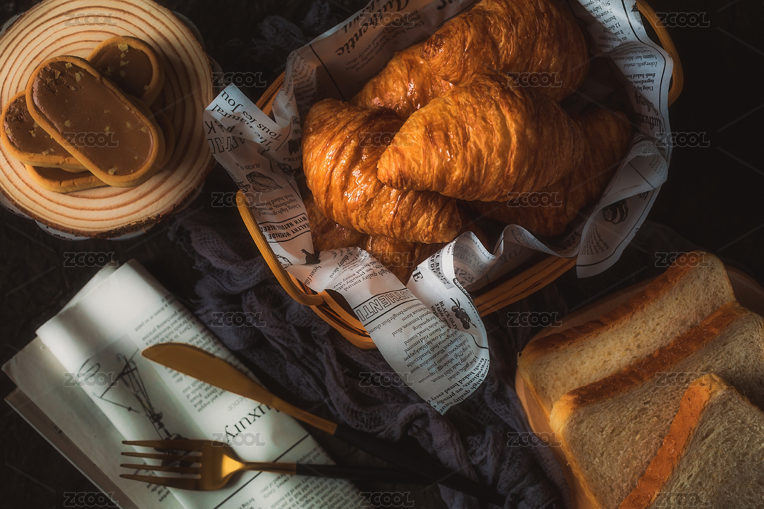 餐具里摆放的面包可颂牛角包