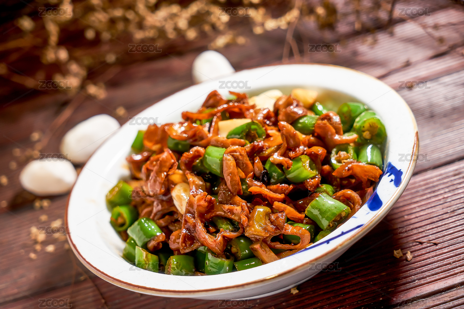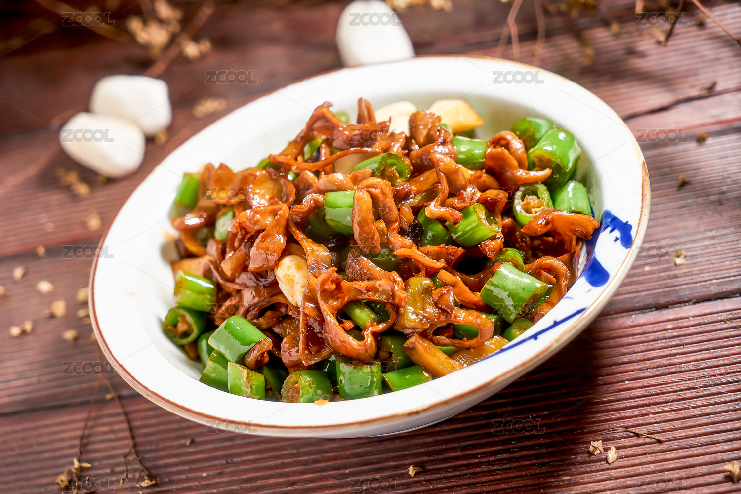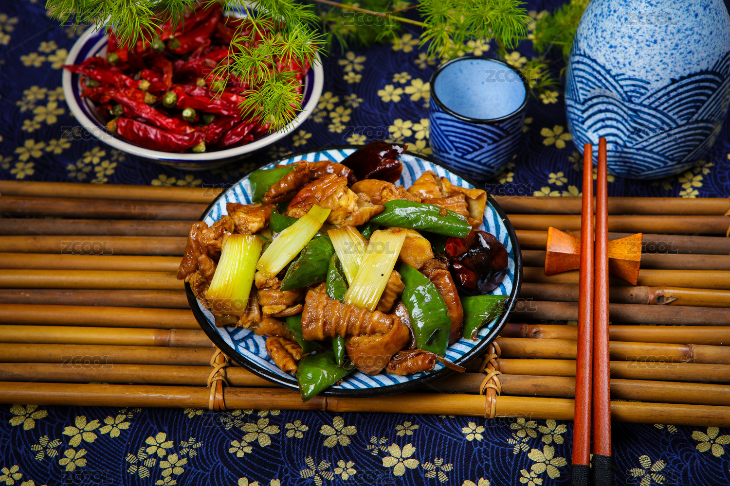 中国传统农家菜辣椒炒肥肠盛放在白瓷盘内
