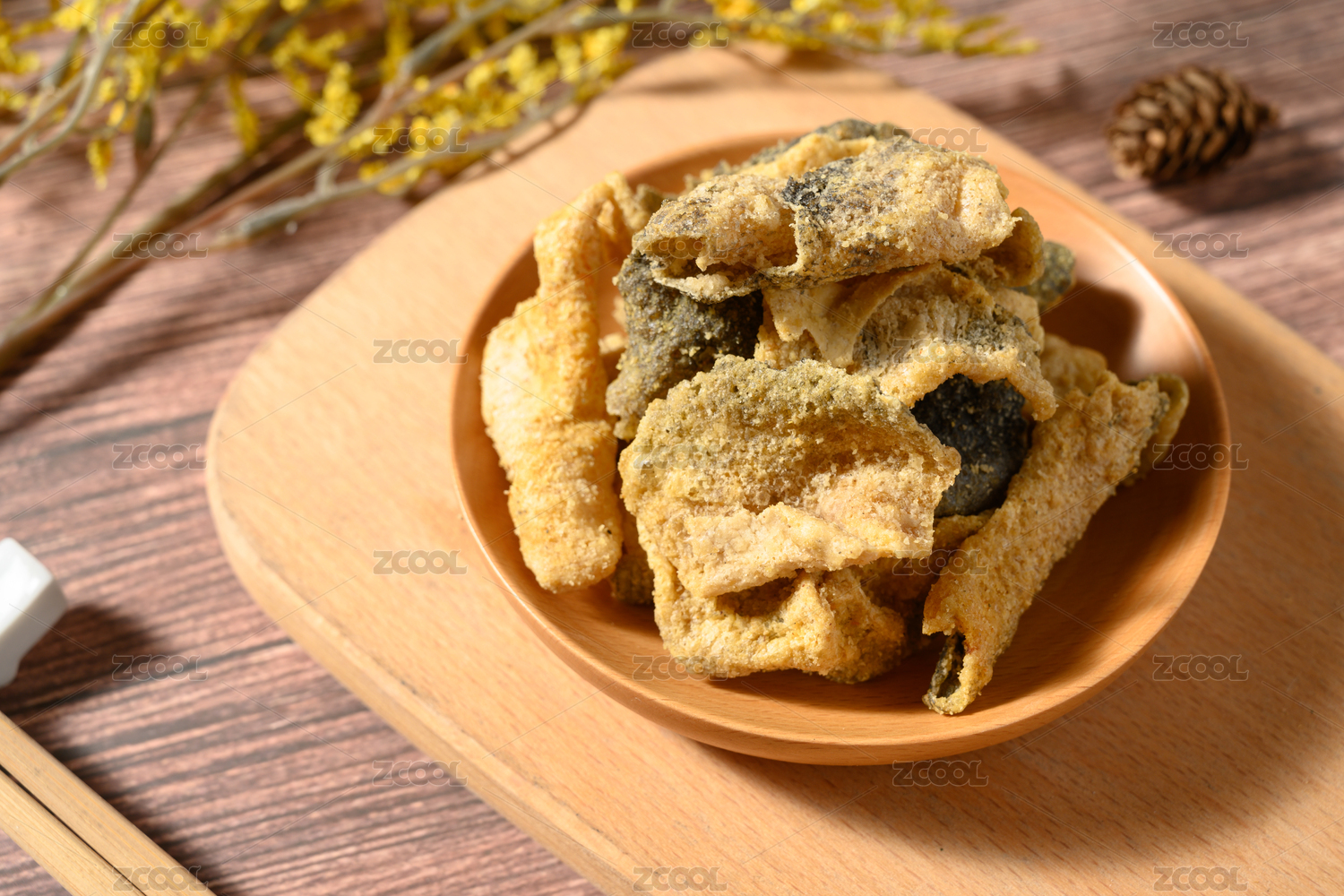 桌面上的木纹盘子里的美味可口的炸鱼皮