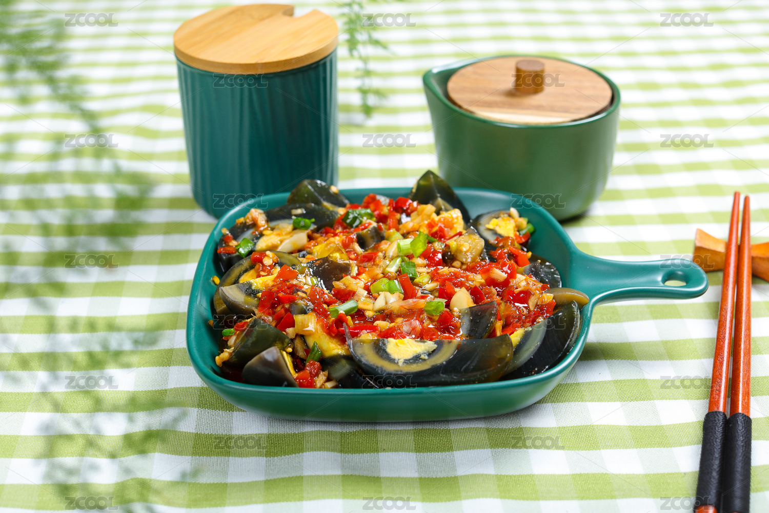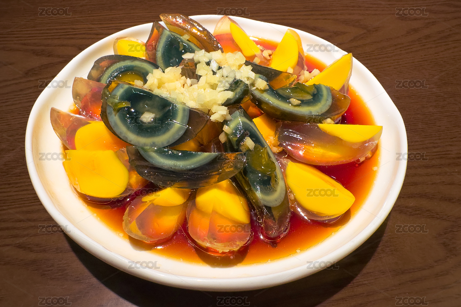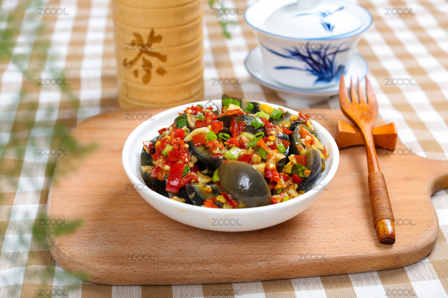 木桌背景一盘凉拌皮蛋