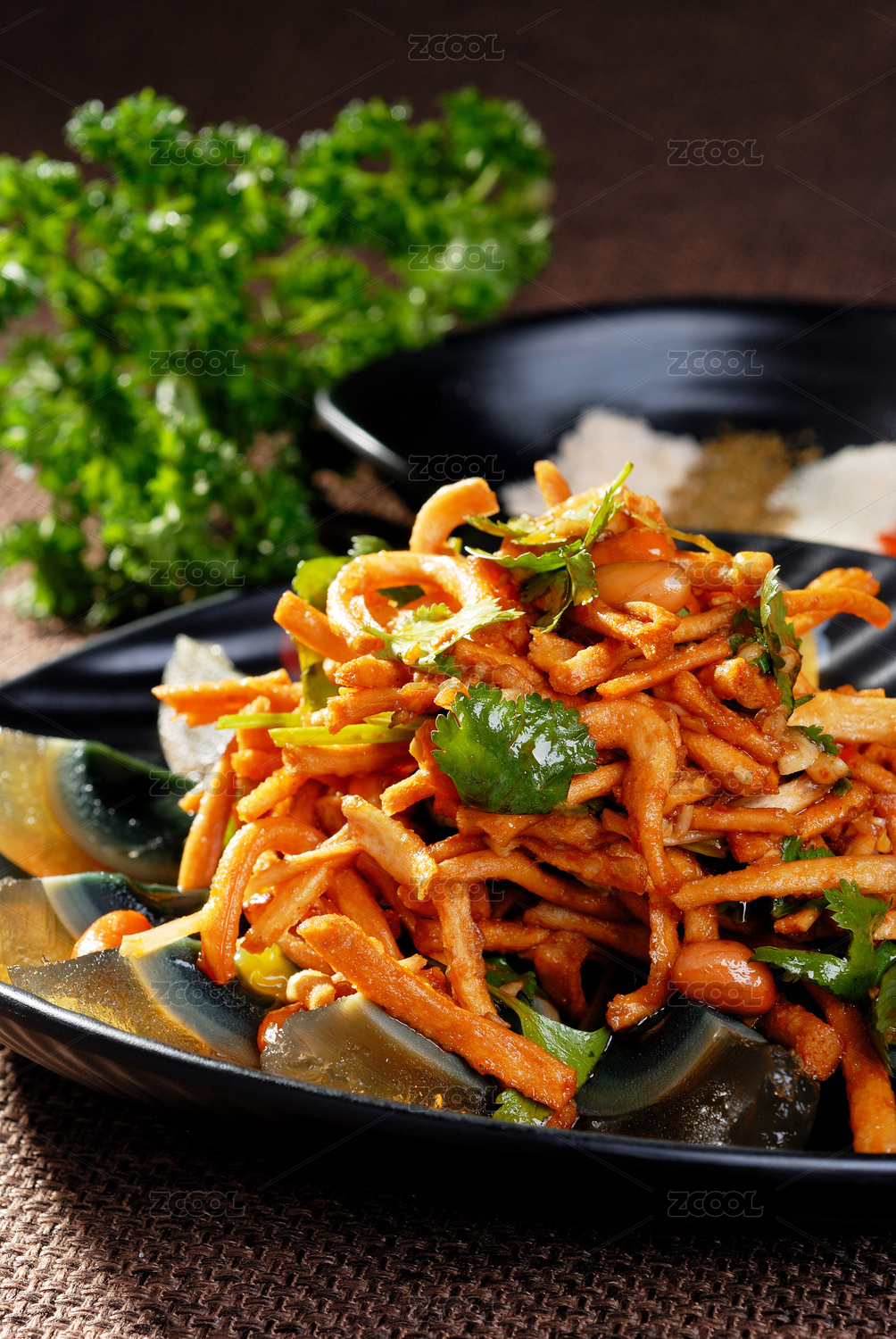 黑色背景一盘凉拌皮蛋特写