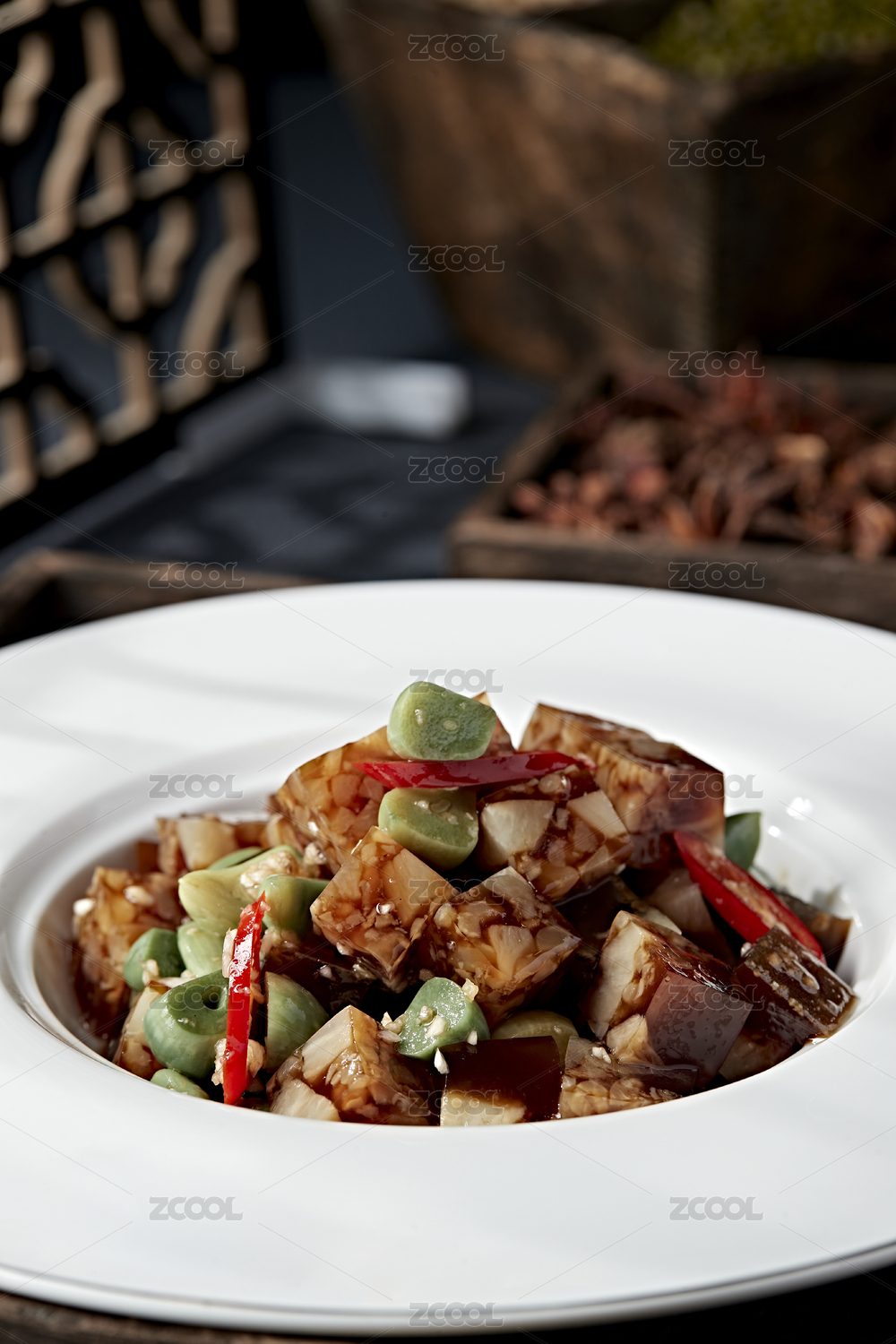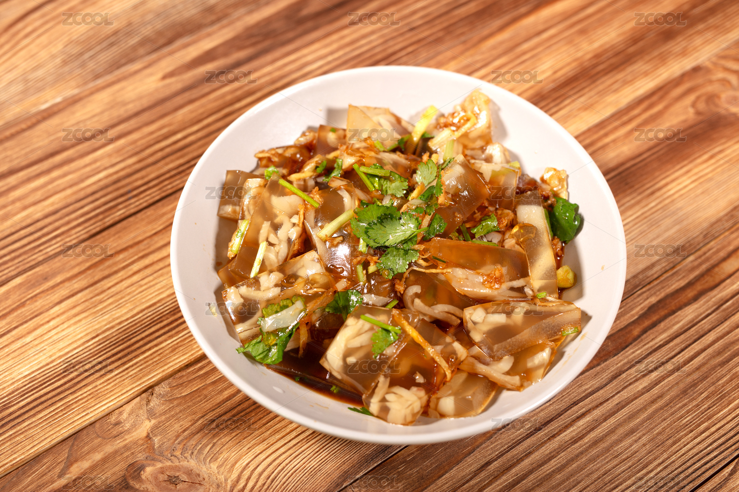 木纹桌上面有一盘凉拌猪皮