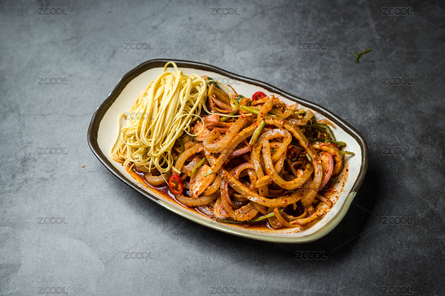 暗色水泥纹桌上放着一盘凉拌猪皮