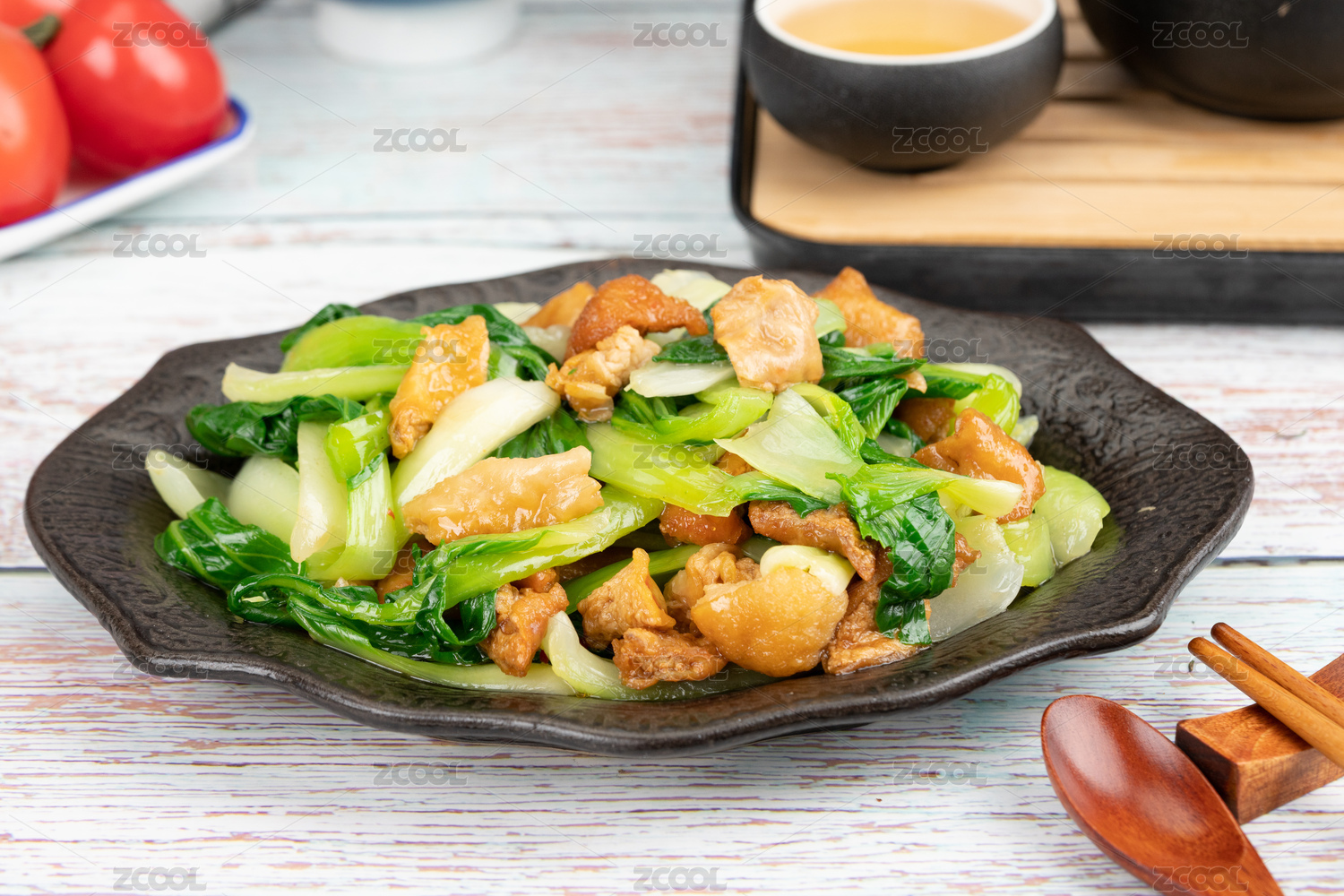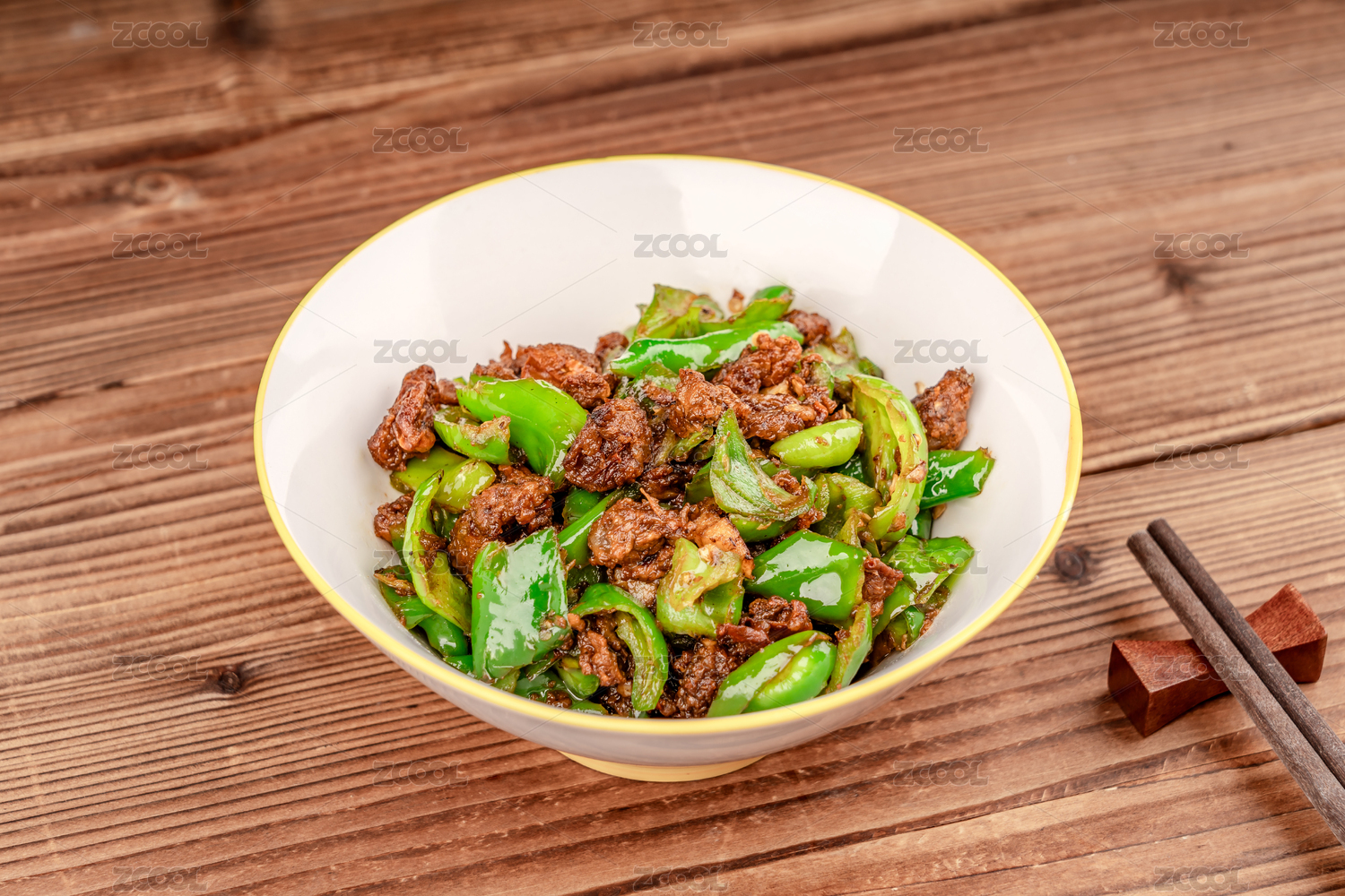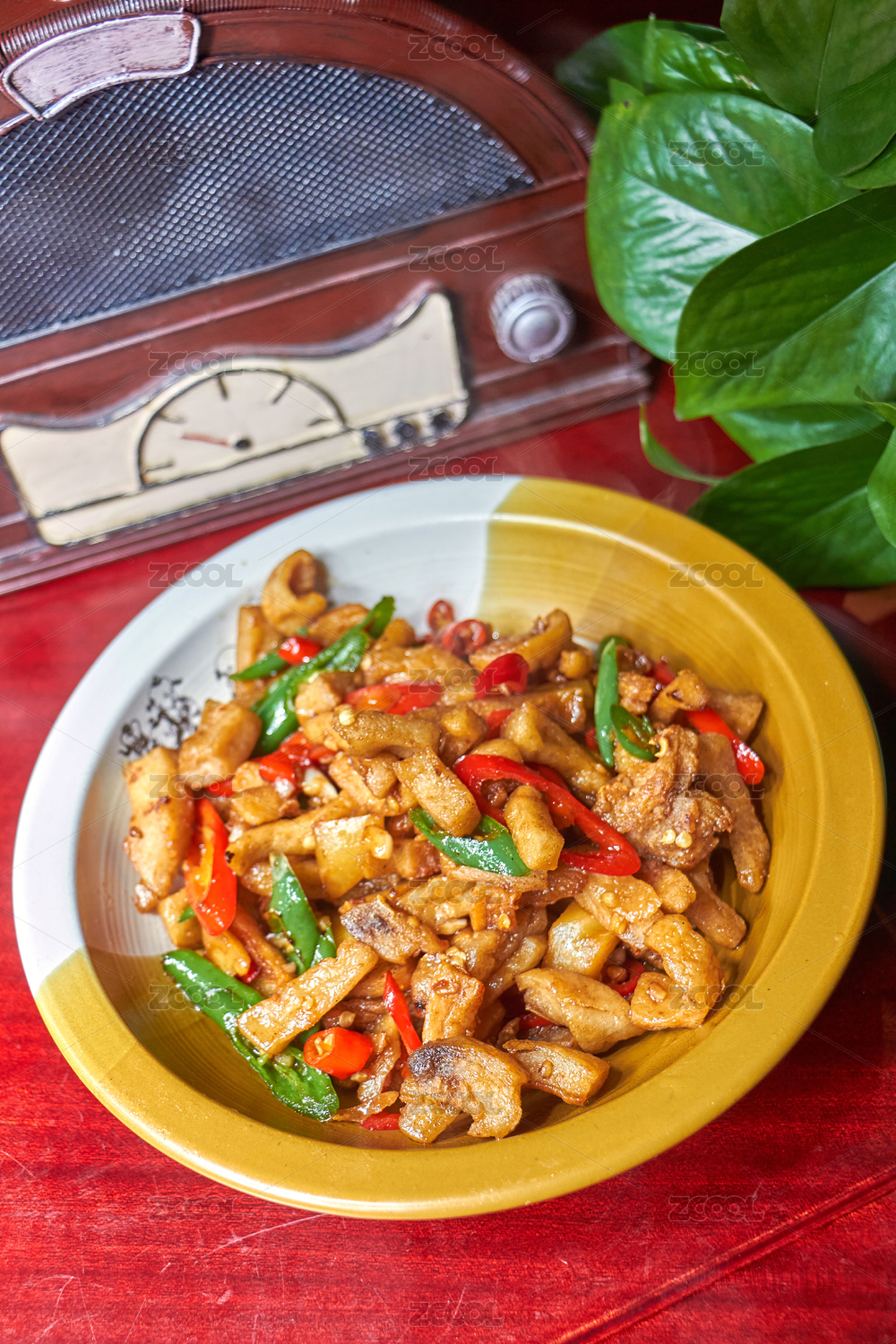家常美食萝卜干炒油渣装在造型独特的瓷盘里