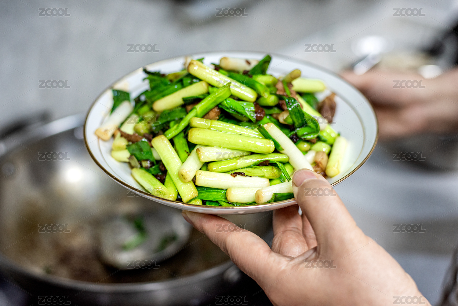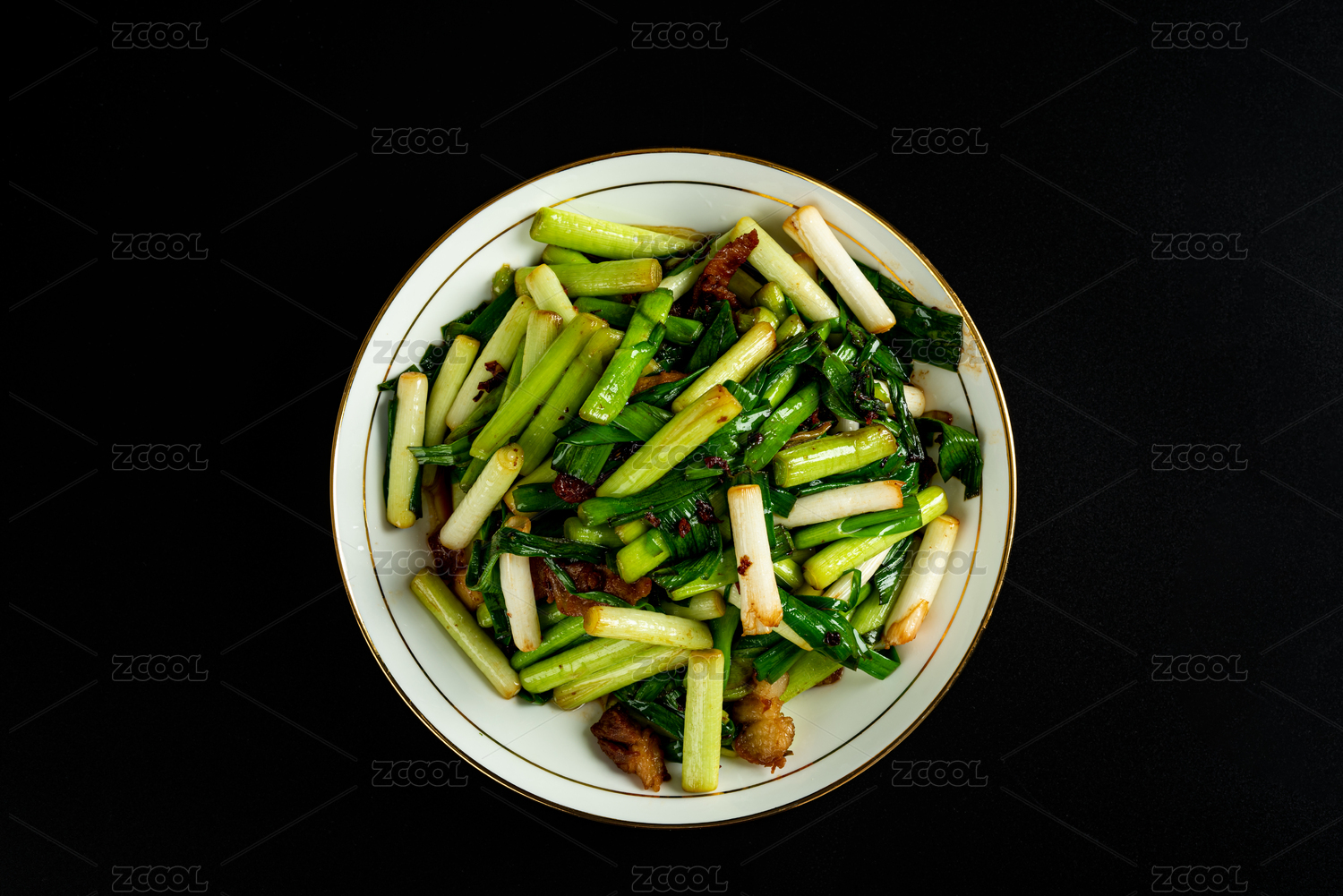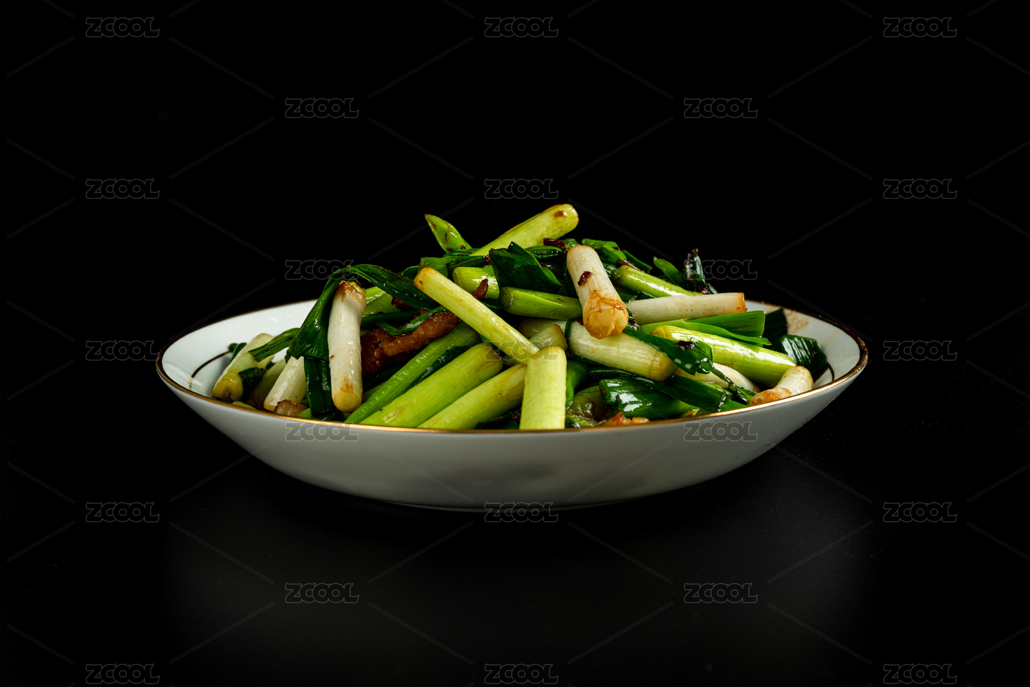 黑底上的浅绿色盘子盛装的蒜苗炒肉