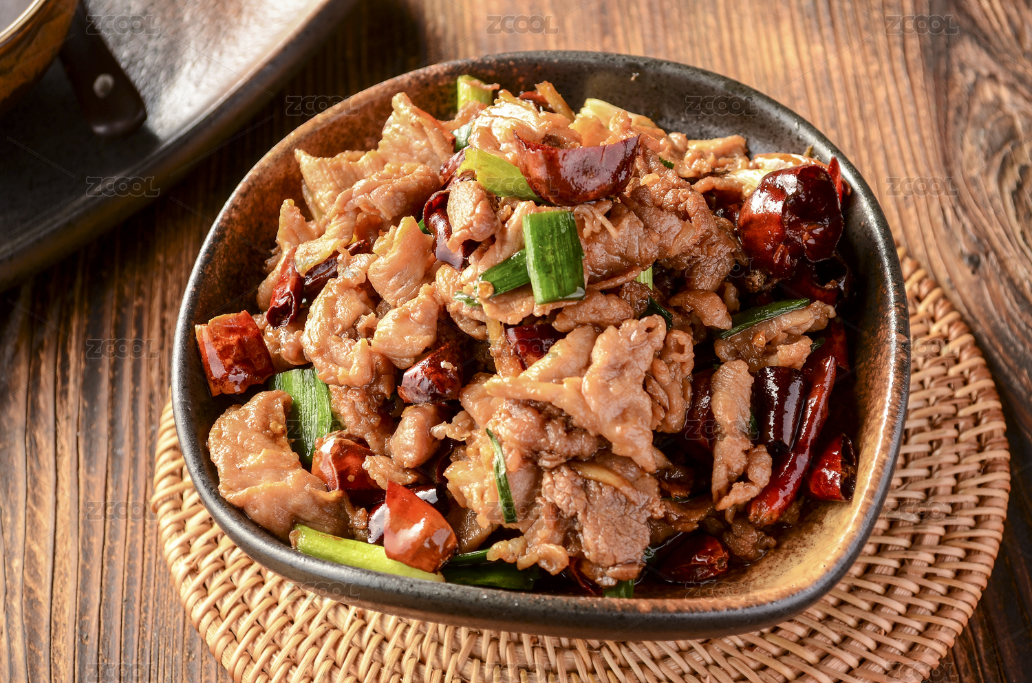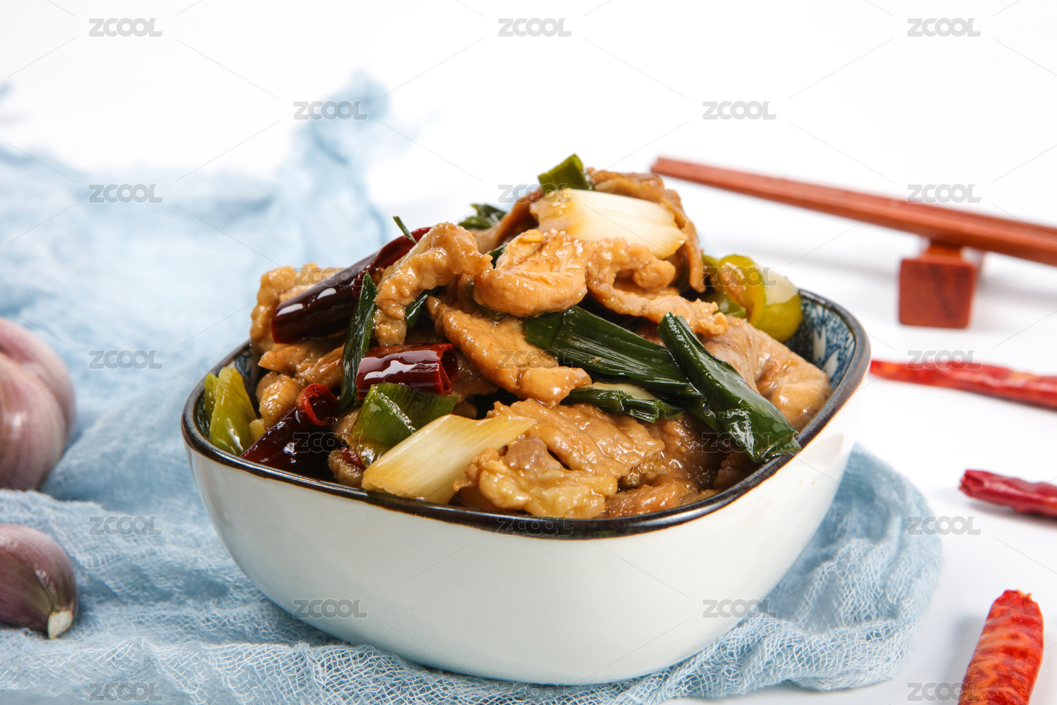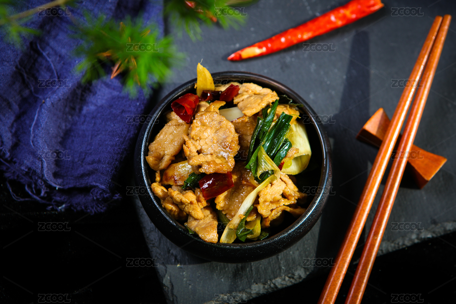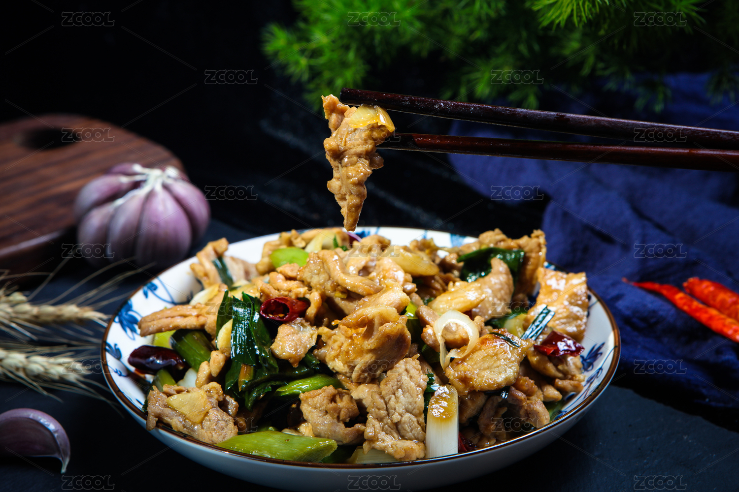 黑底上的浅绿色盘子盛装的蒜苗炒肉