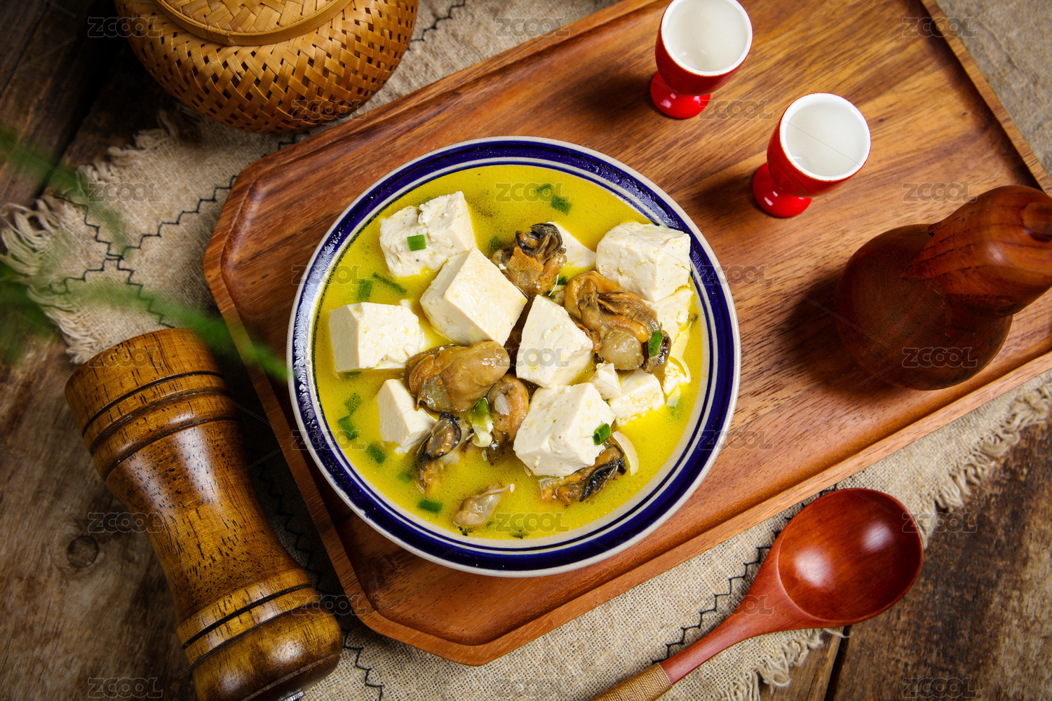 深色木板上摆放的炖豆腐