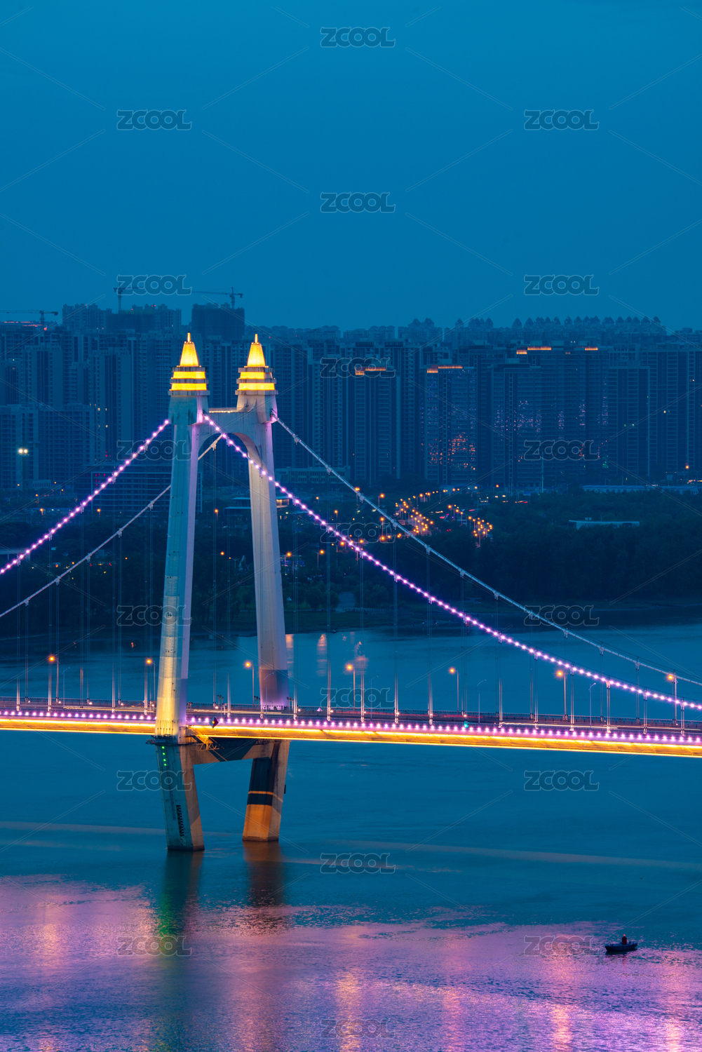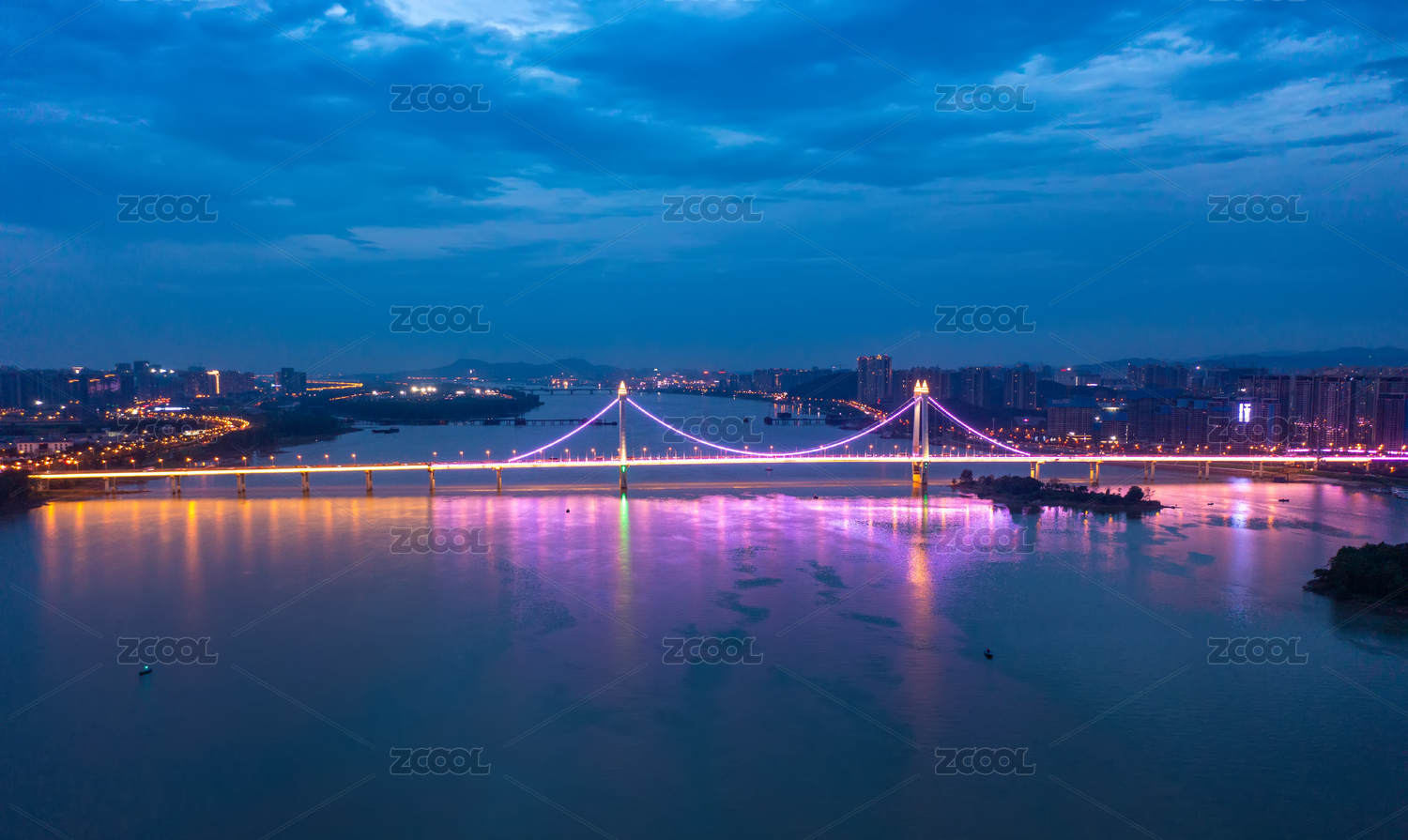 长沙湘江三汊矶大桥与东岸天际线鸟瞰夜景观