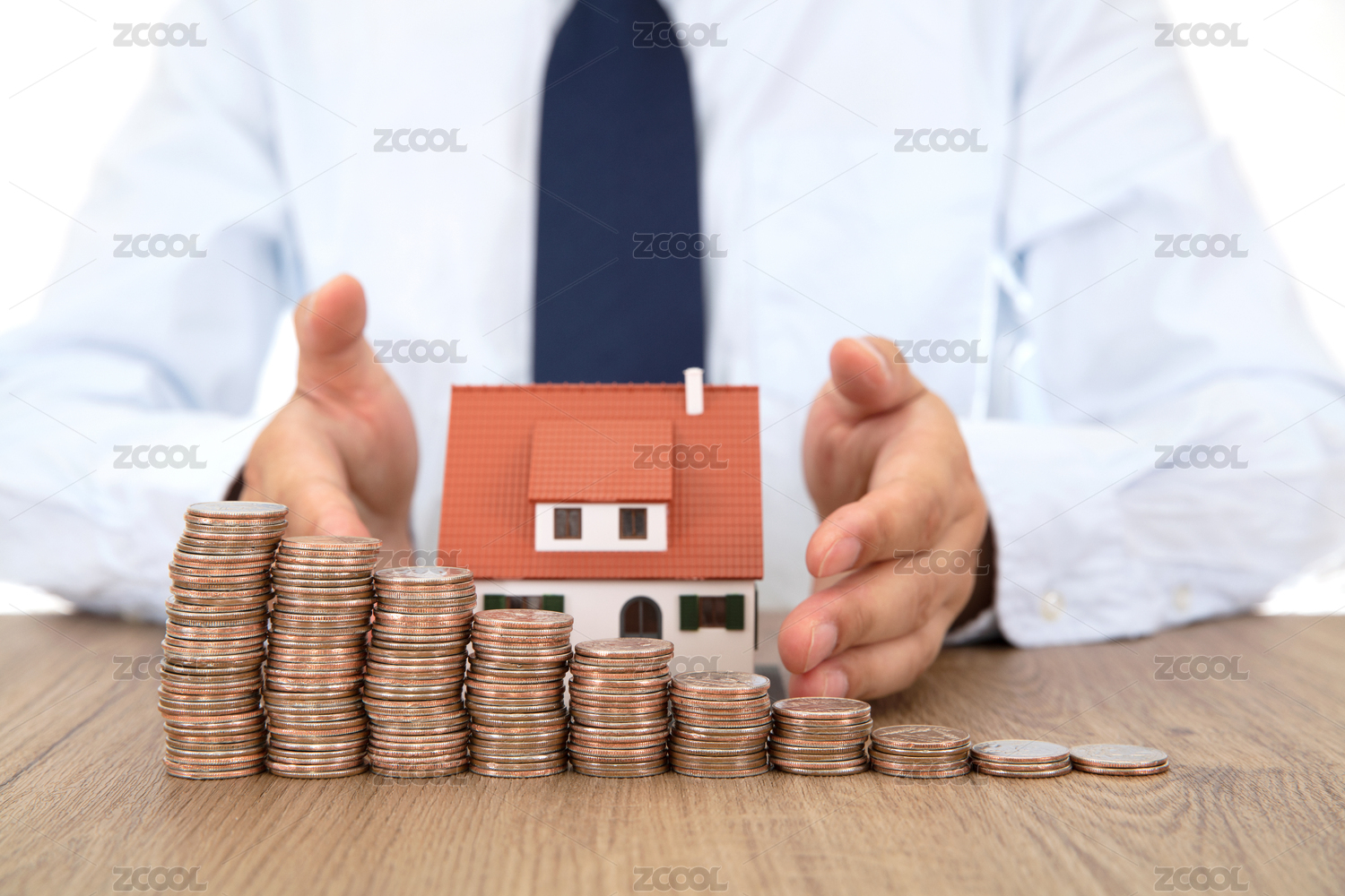 衬衣领带装束的年轻人呵护着小房子模型和一排递减的美元硬币