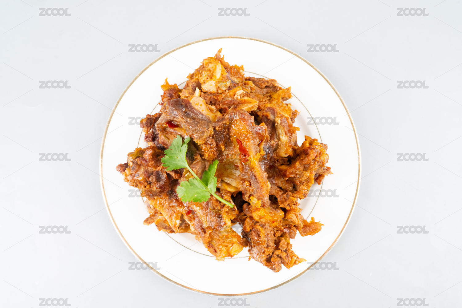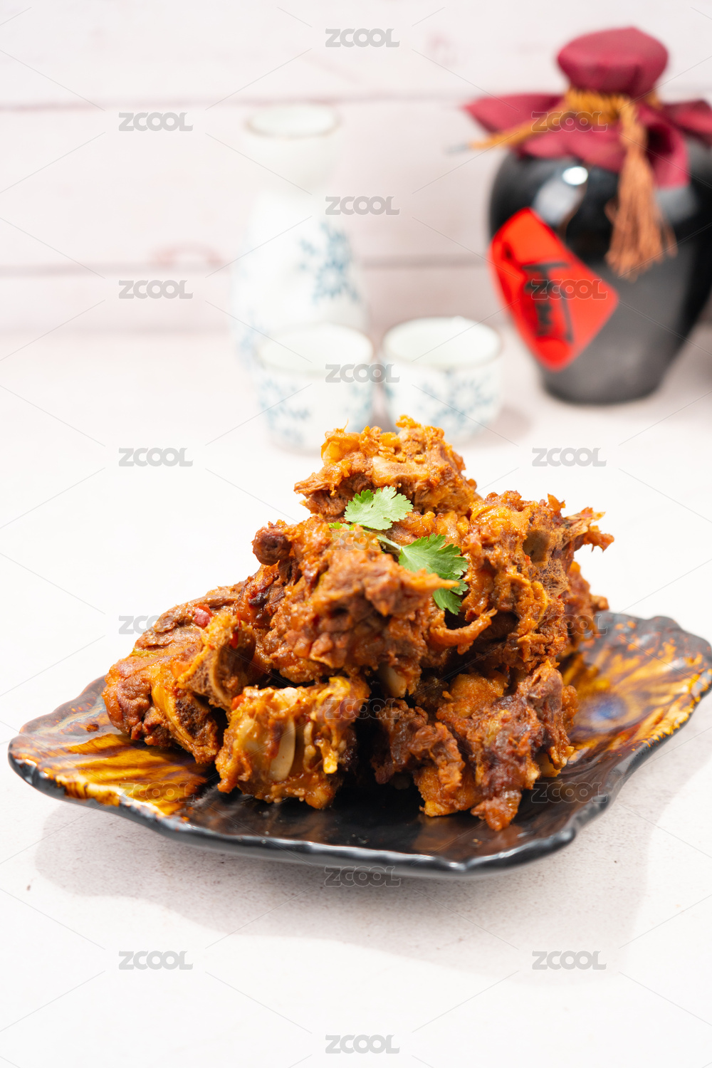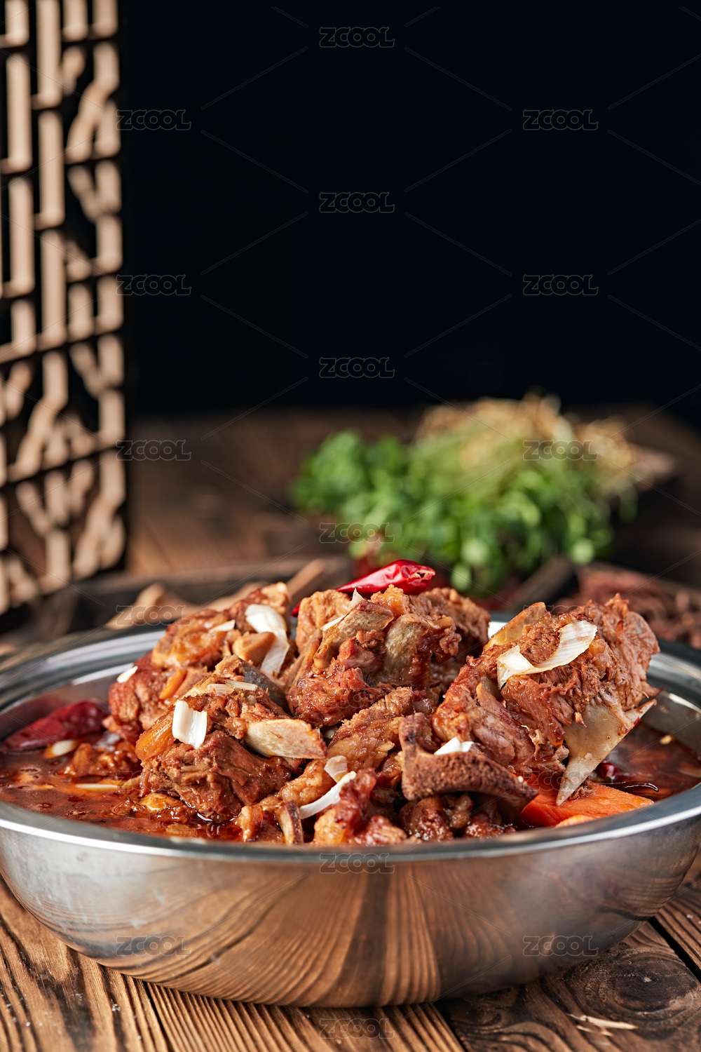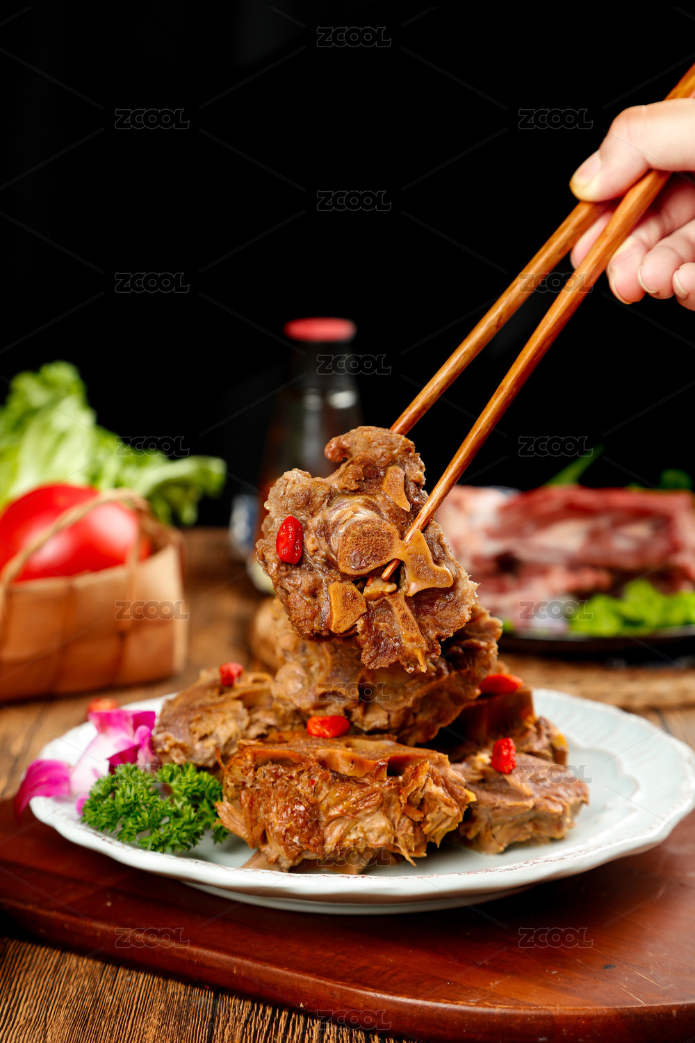 木底上放着一盘红焖羊脊骨和筷子夹着羊骨