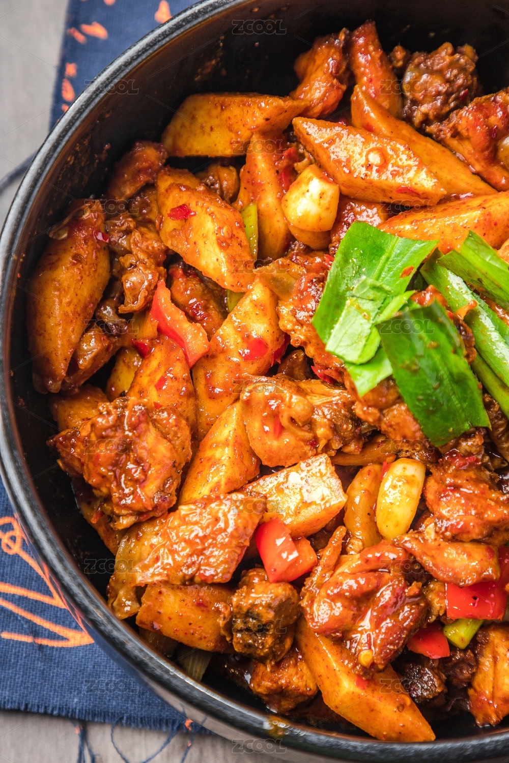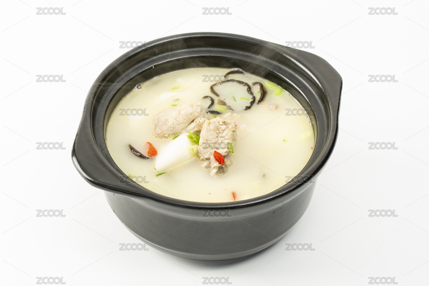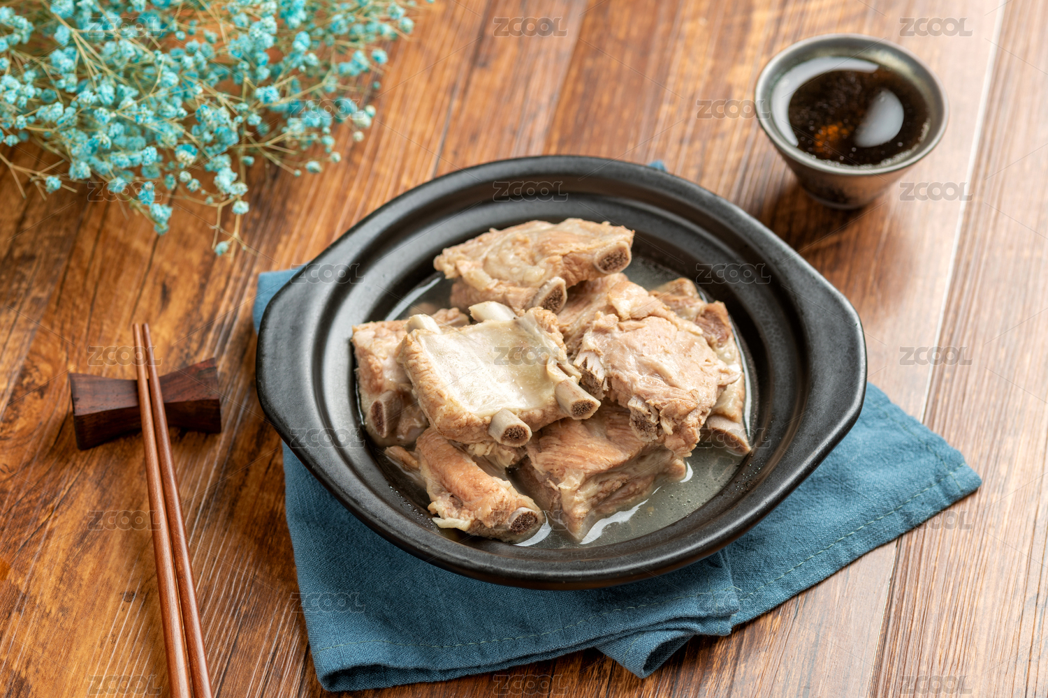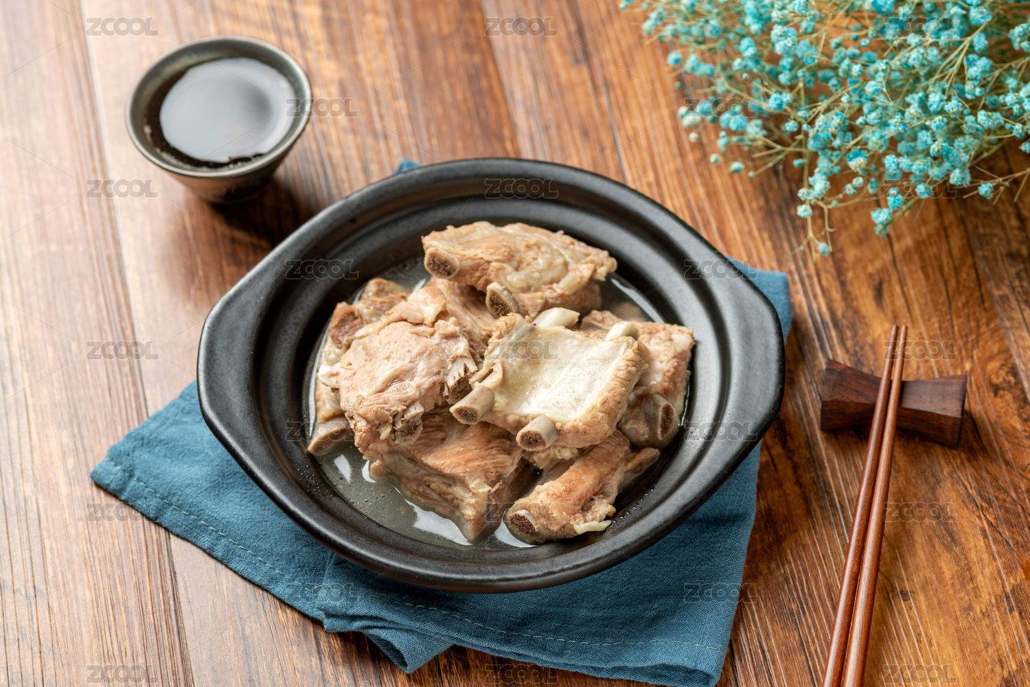 棕色桌面上有一盆土豆山药炖排骨砂锅菜
