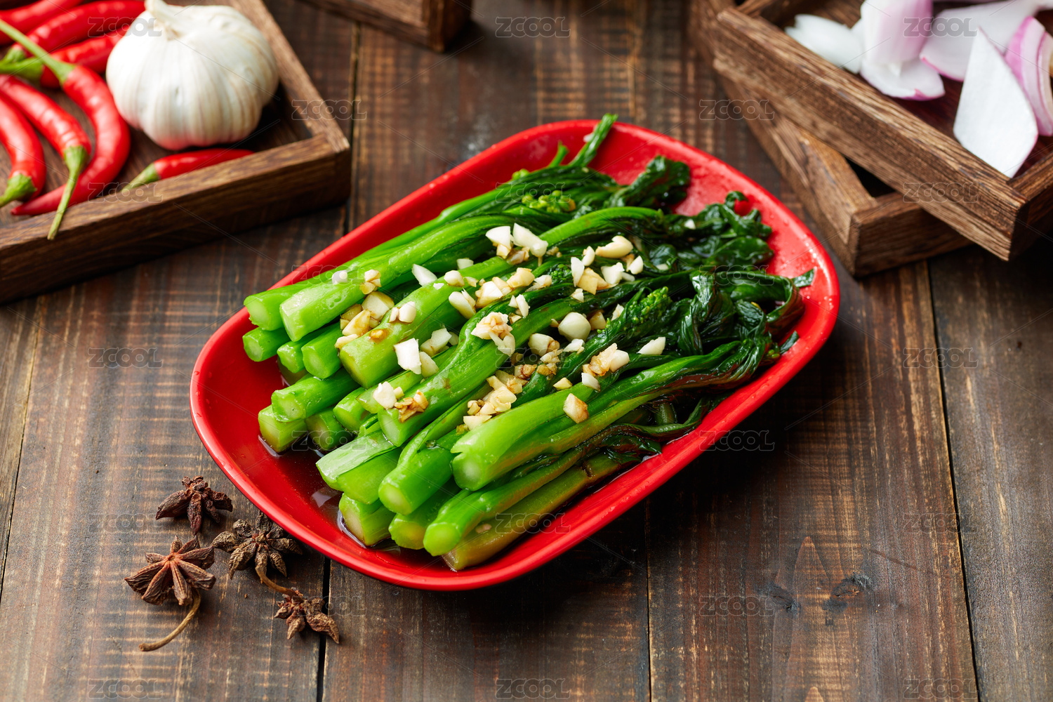 木桌背景的一盘广东白灼菜心