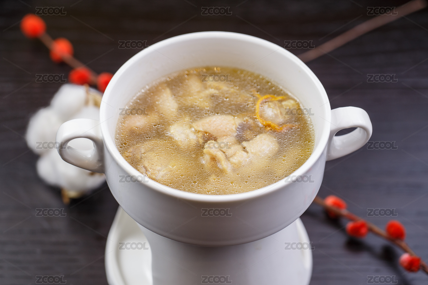 白色瓷汤盅装的木薯党参虫草花炖老鸭汤
