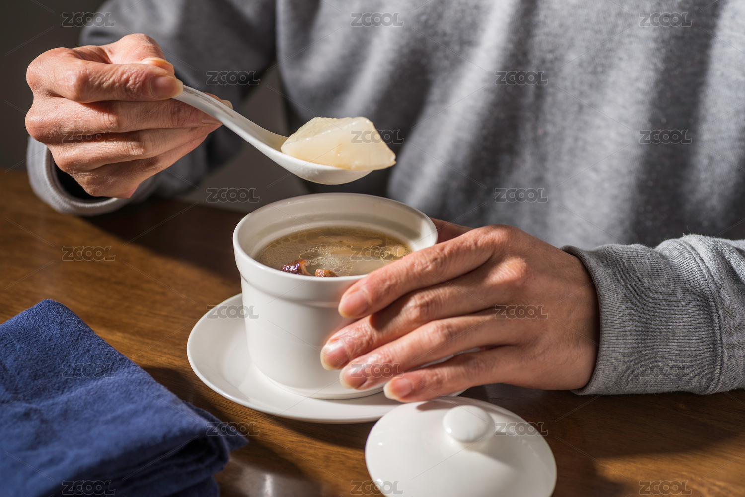 舀起白萝卜配香菇炖老鸭汤准备享用