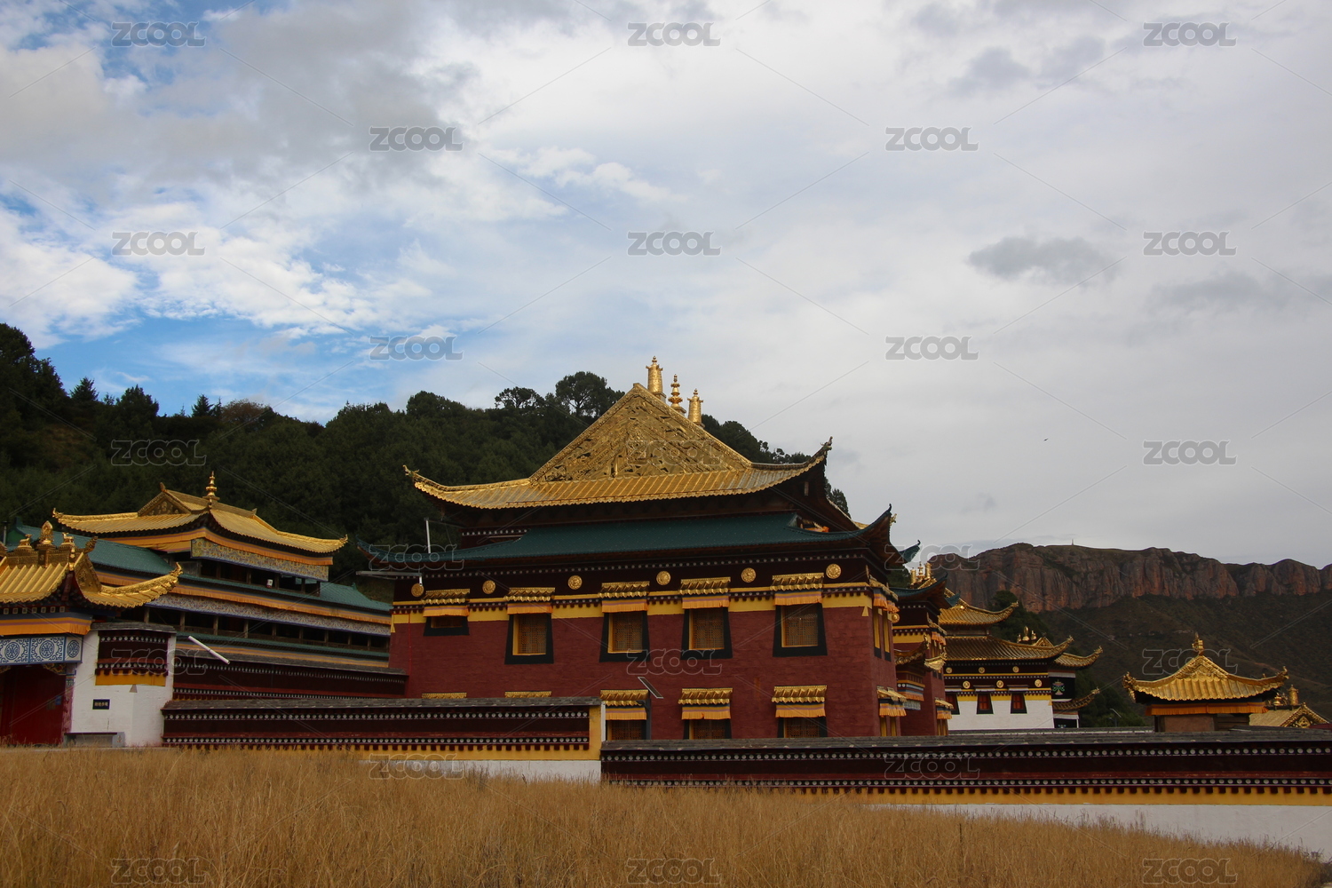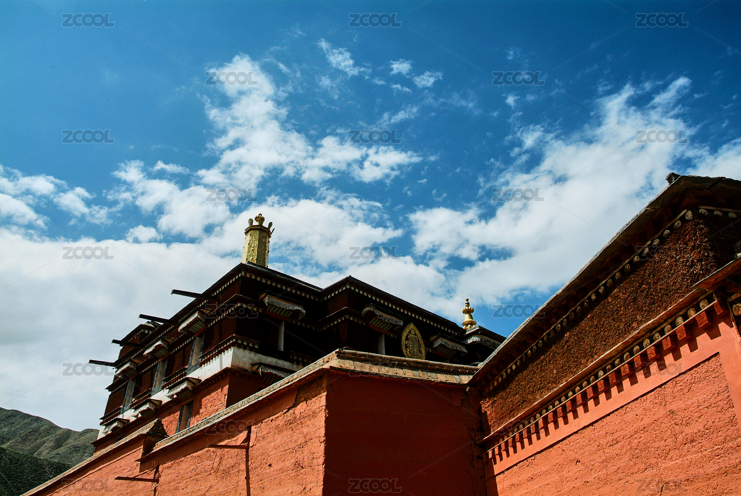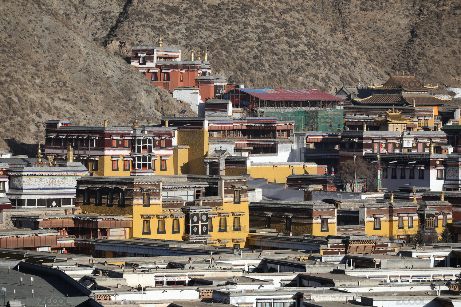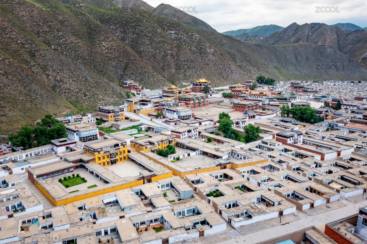 蓝天下山谷内的建筑群落,中国甘肃省甘南藏族自治州夏河县拉不楞寺