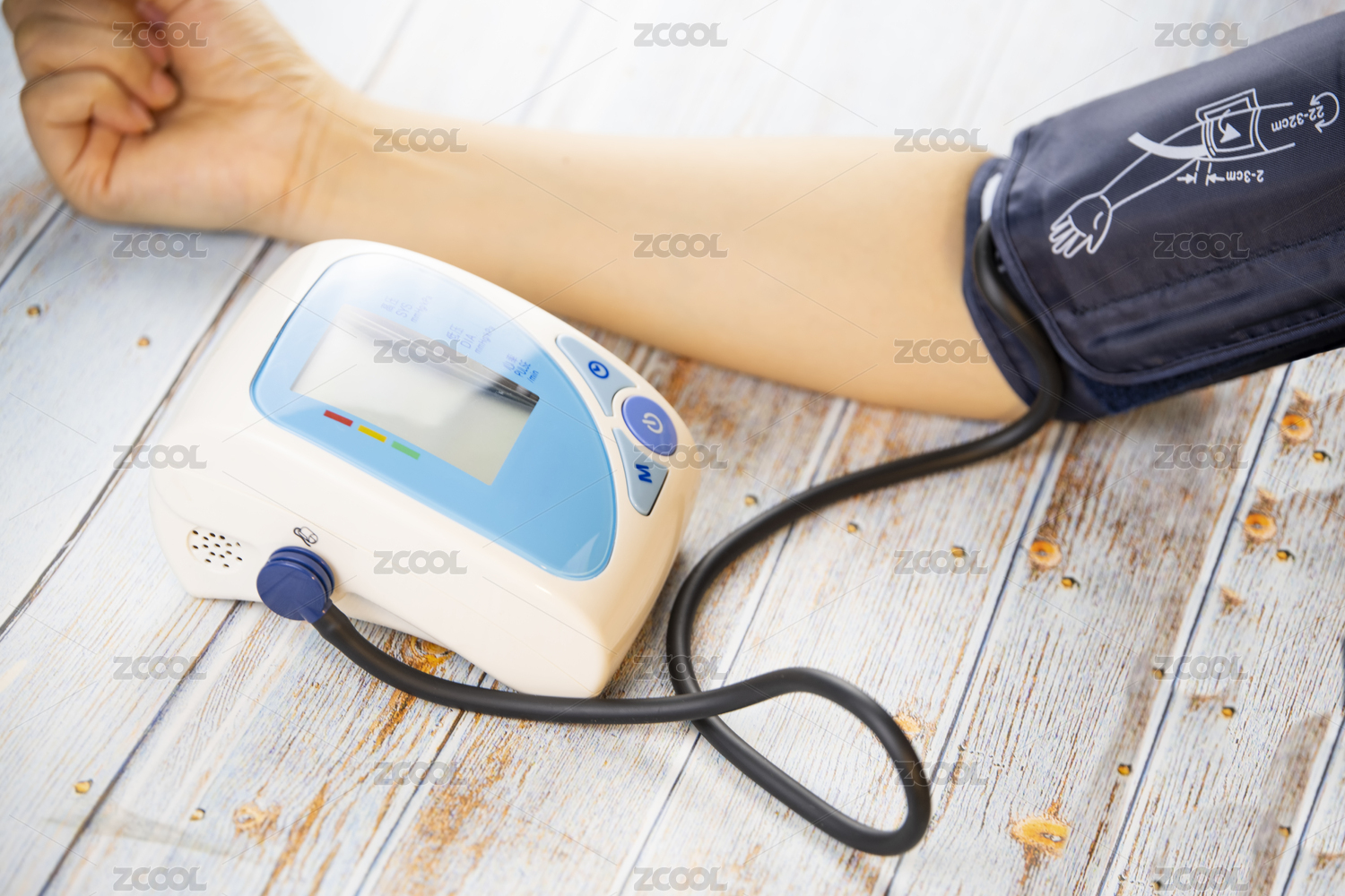 蓝色背景中的一只用胳膊正在测量血压