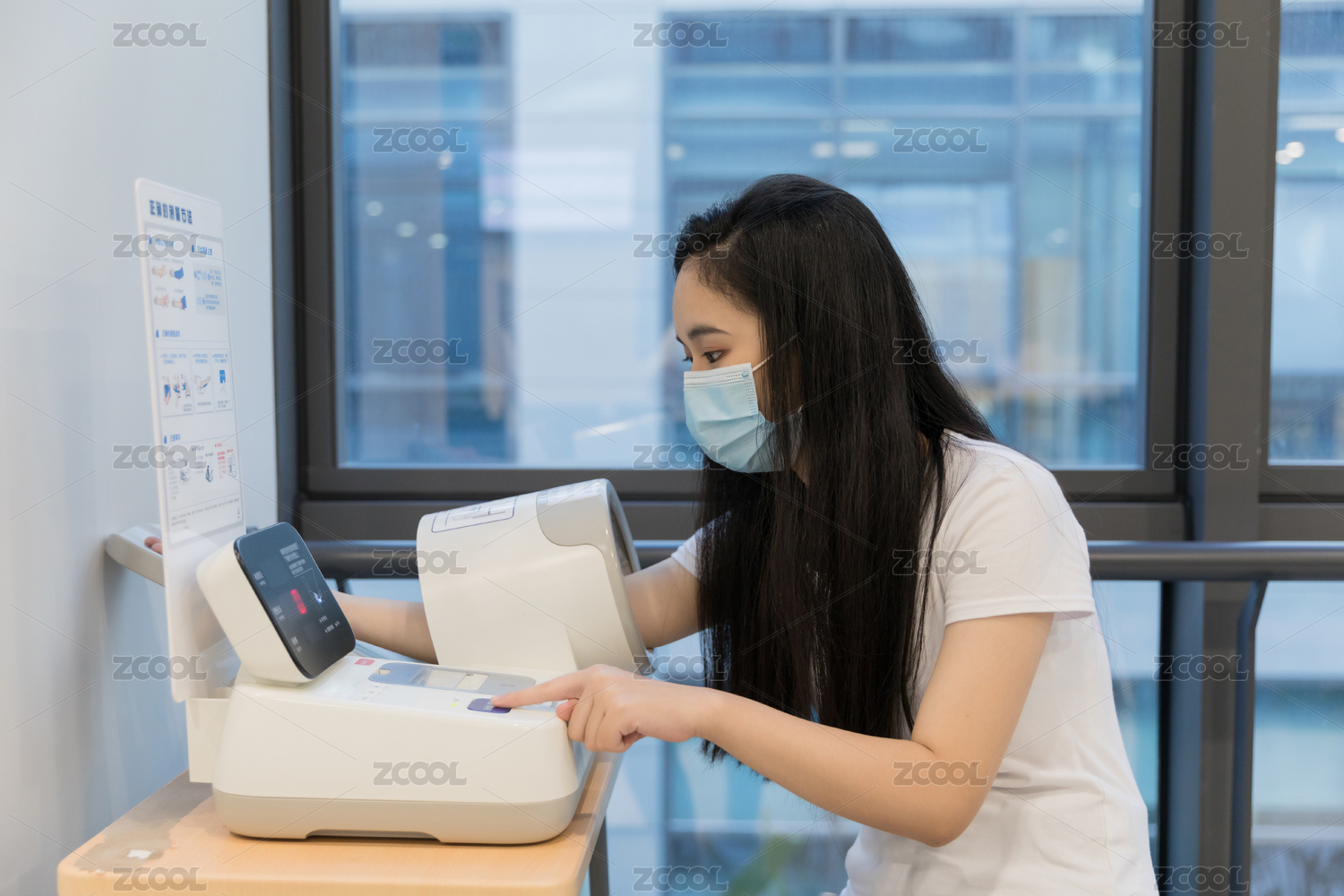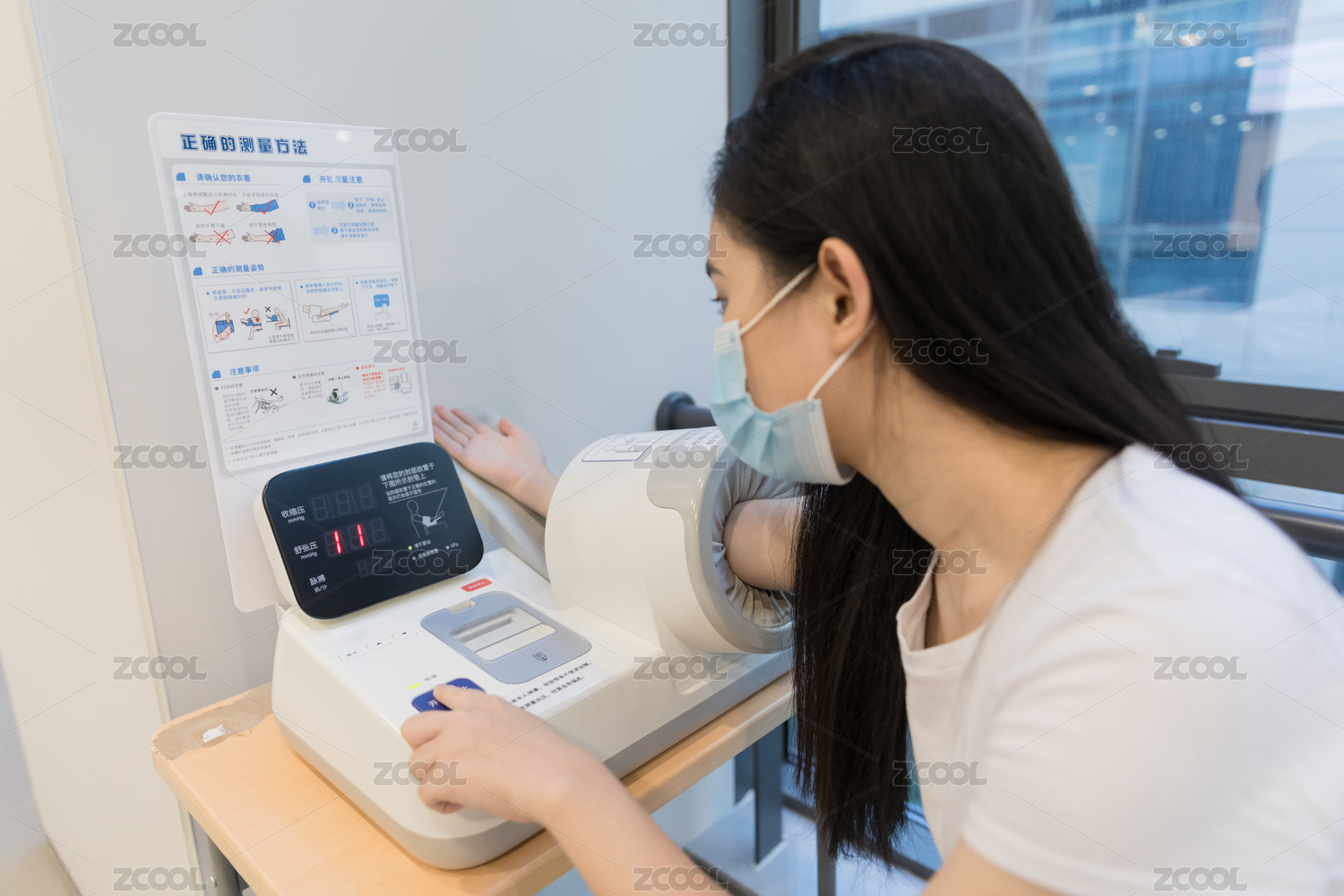 年轻女性医院自助测量血压背影