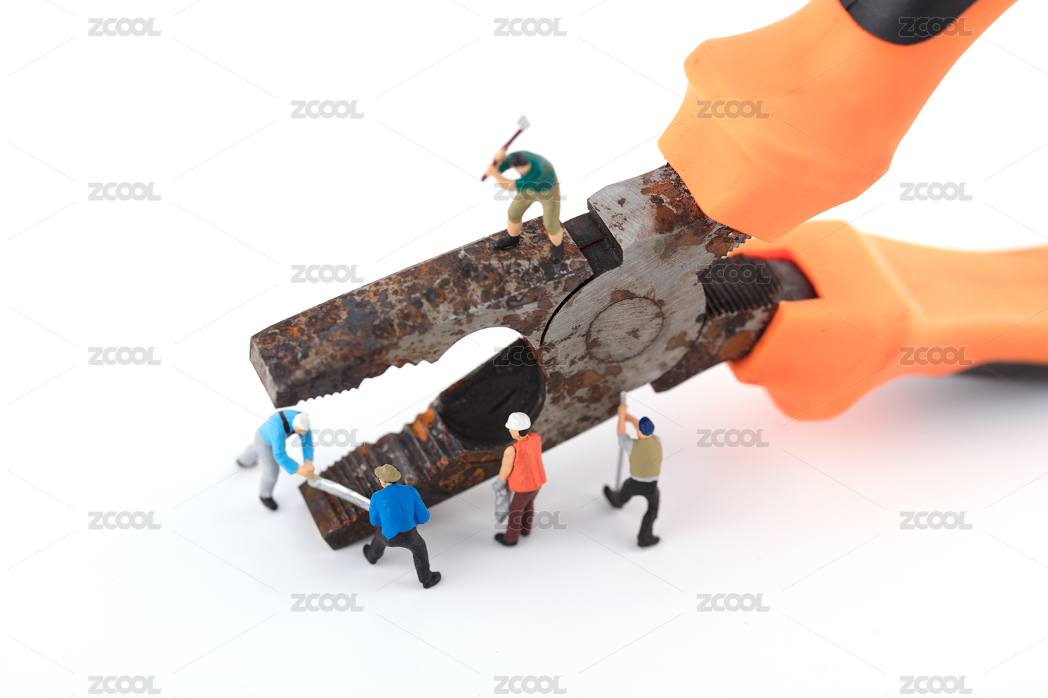 微缩创意工人劳动和生锈的钳子