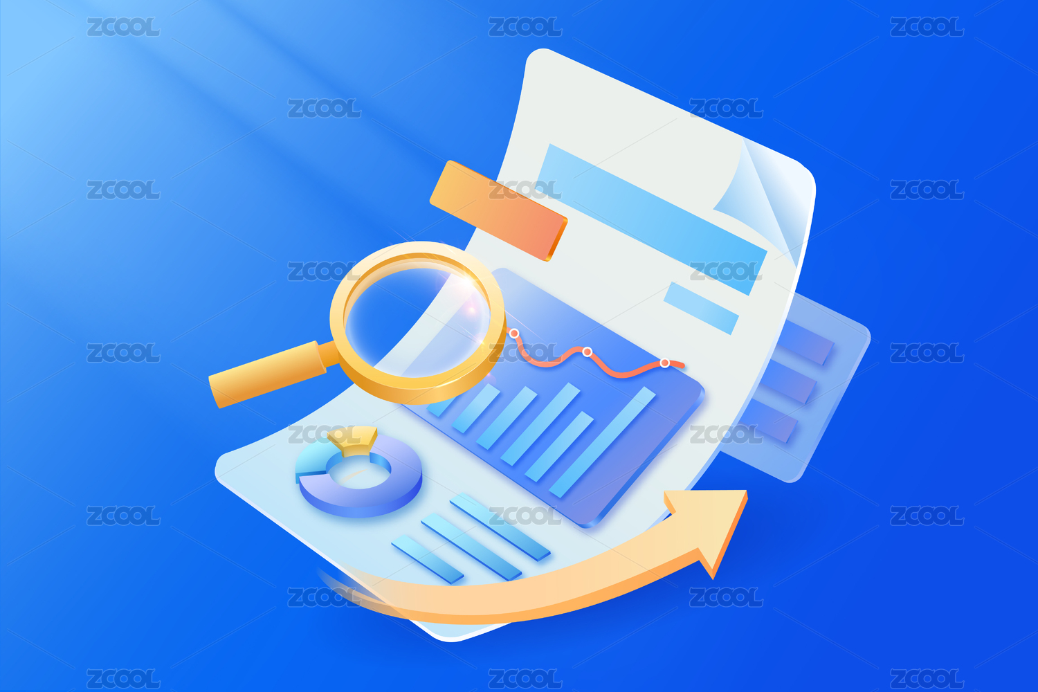 放大镜查看业绩账单柱状图和饼图上升走势图