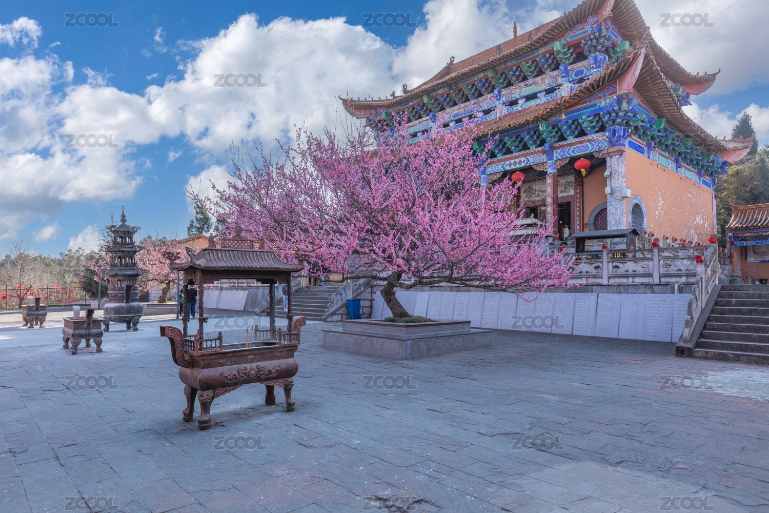昆明棋盘山棋盘宫蓝天白云衬托古树梅花盛开