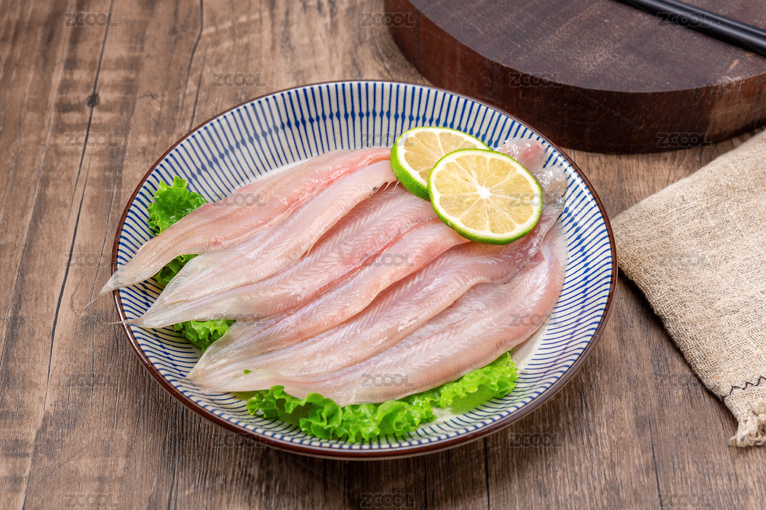 木纹桌面上盘子里的鳎目鱼生肉食材