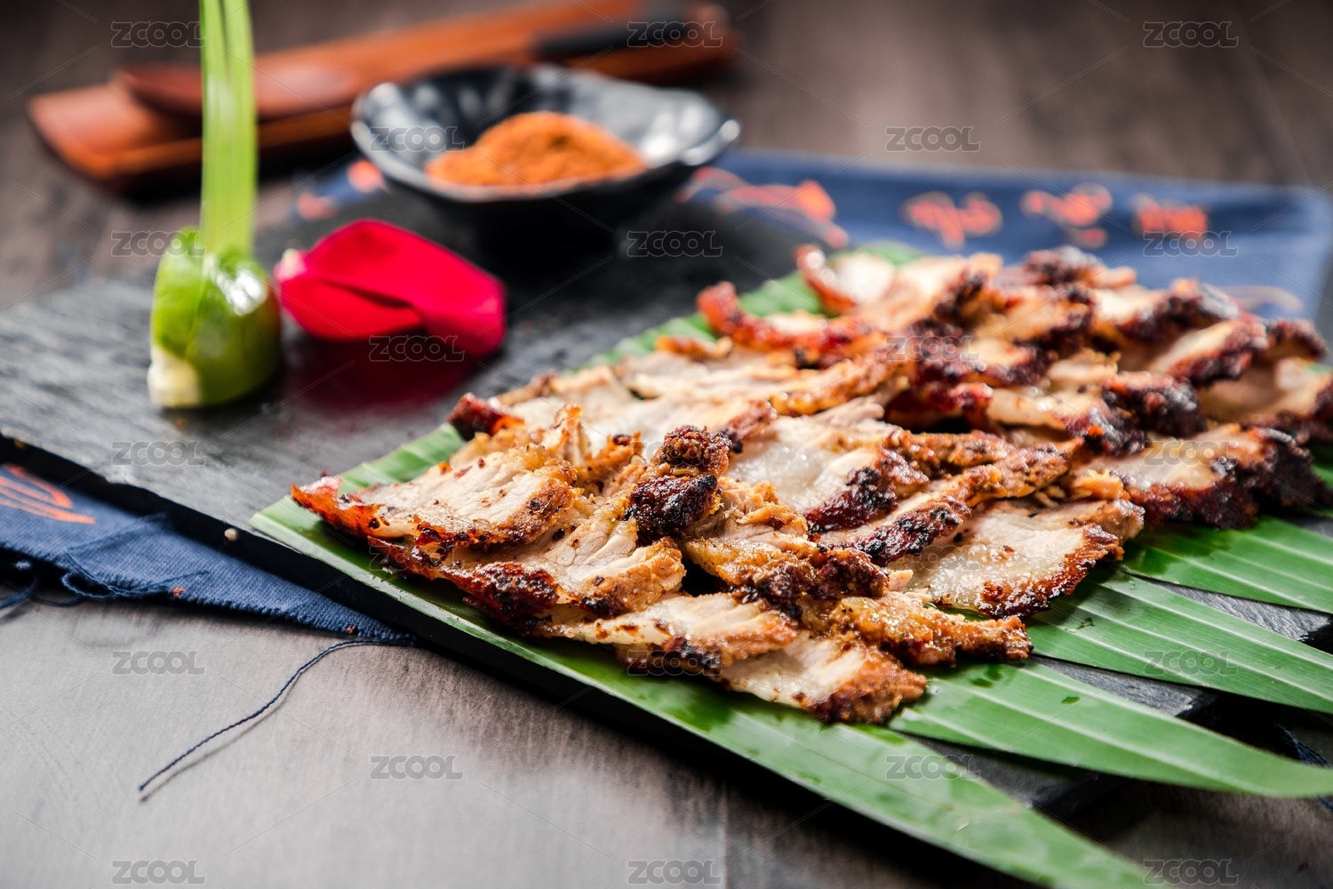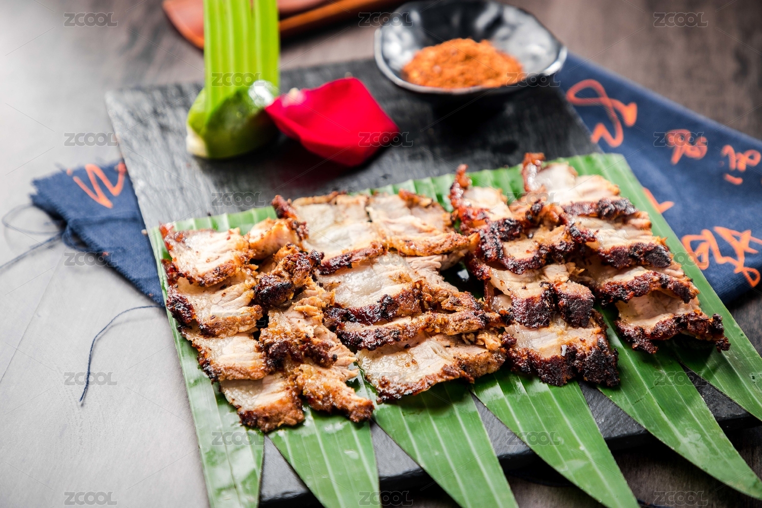 芭蕉叶子上的碳烤五花肉沾辣椒面儿