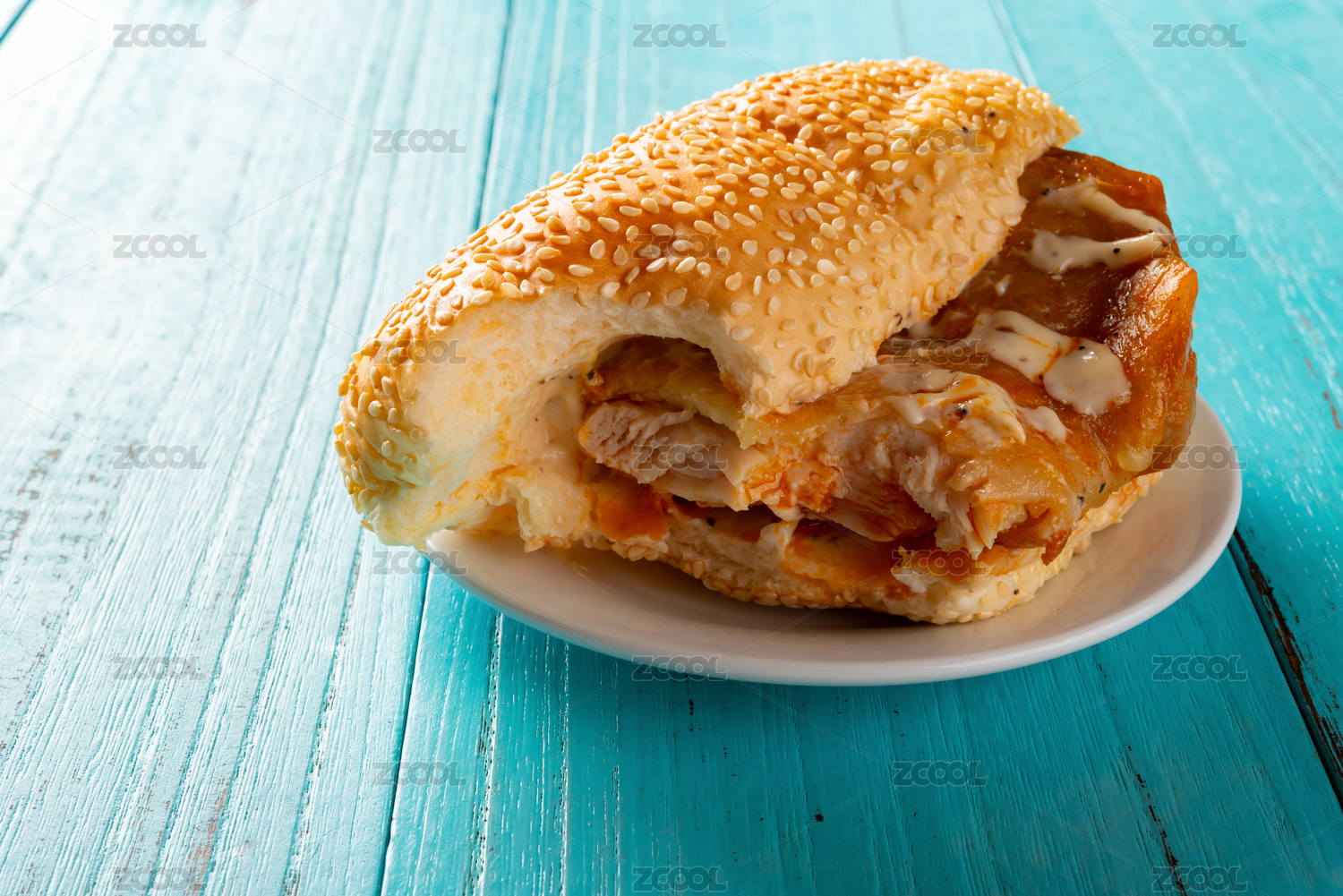 白盘里的现烤面包鸡腿面包
