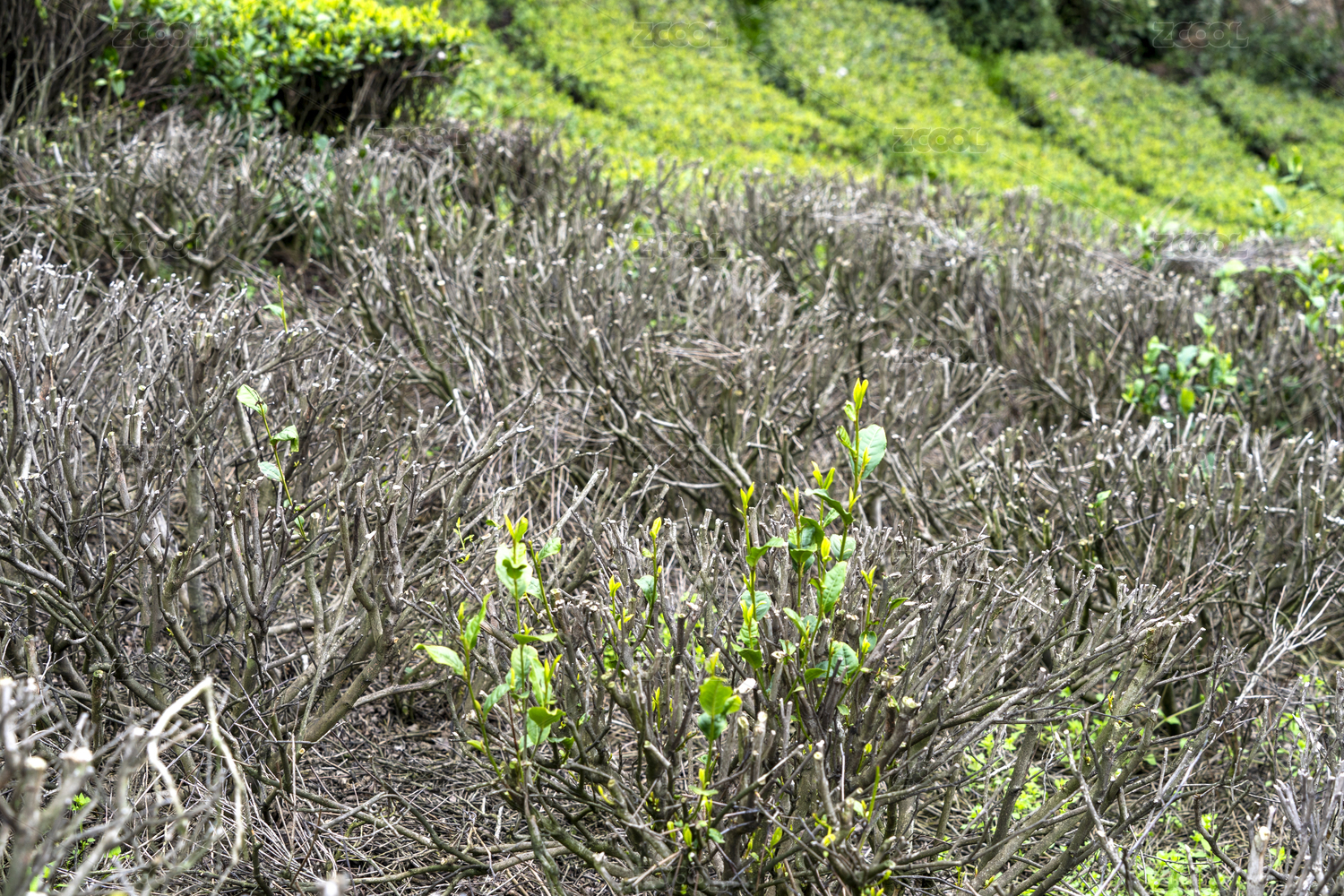 茶园基地旱灾之后的茶树枯枝
