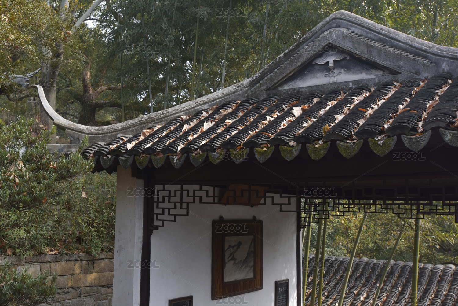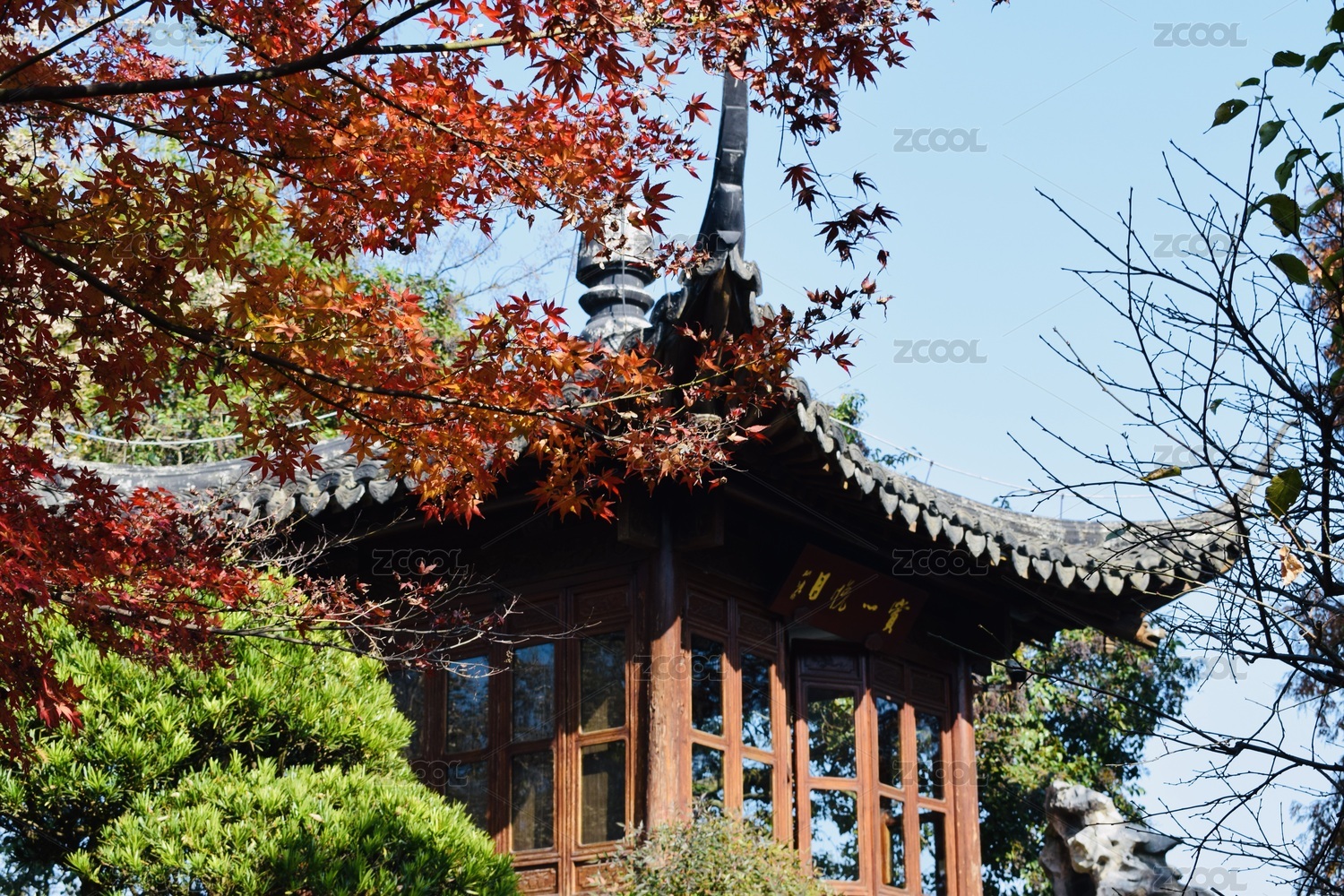 古典建筑凉亭的飞檐翘角,红枫立于旁边