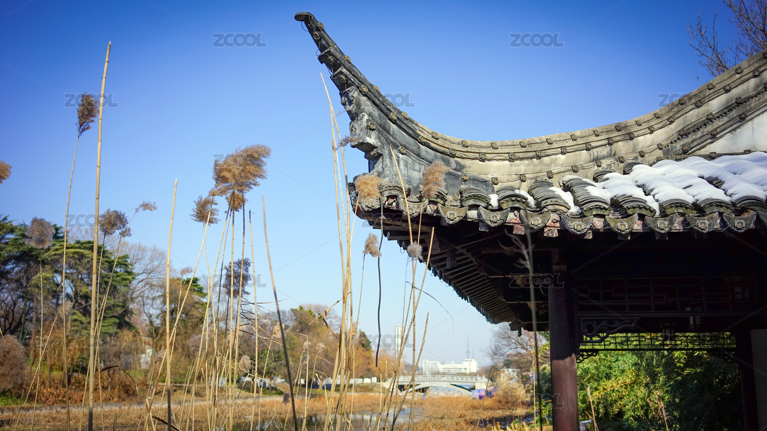 飞檐翘角的屋顶上残雪和公园里的枯黄芦苇