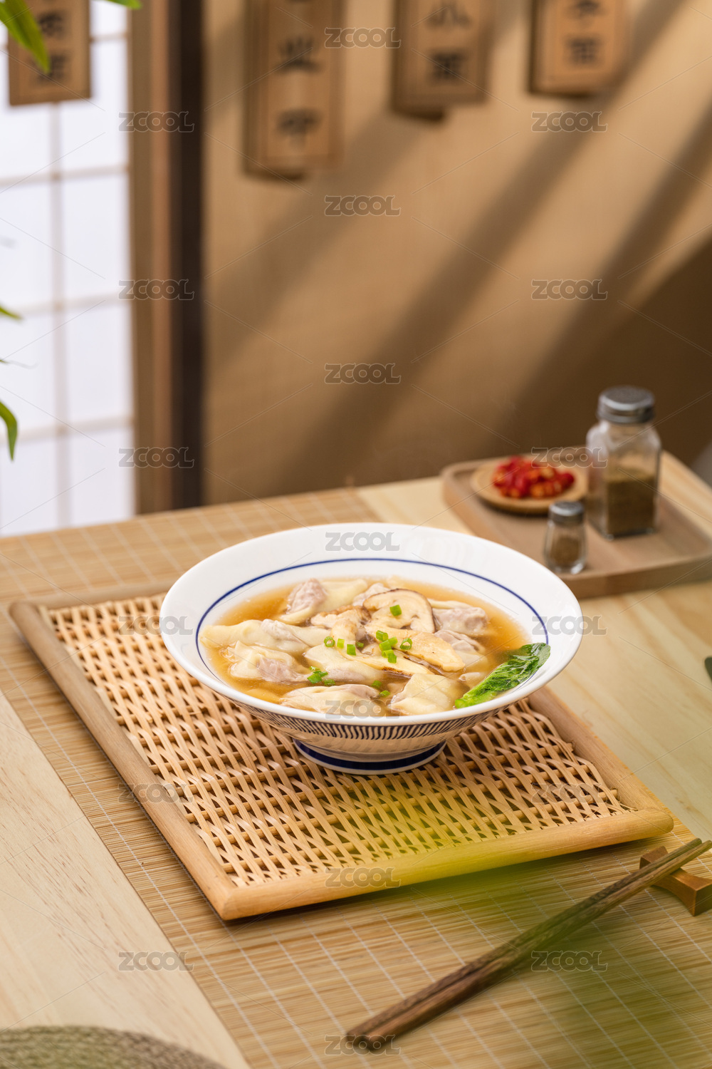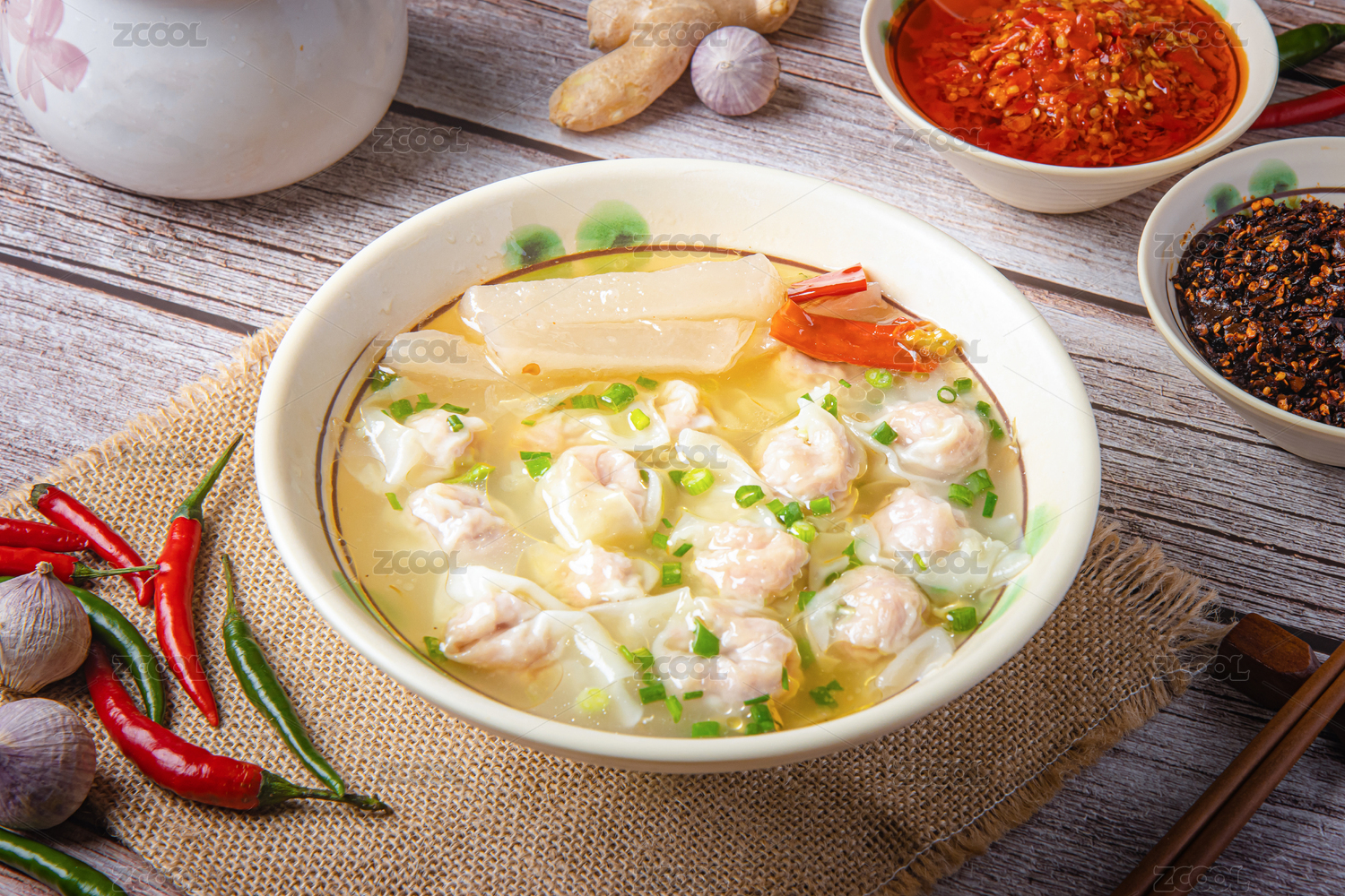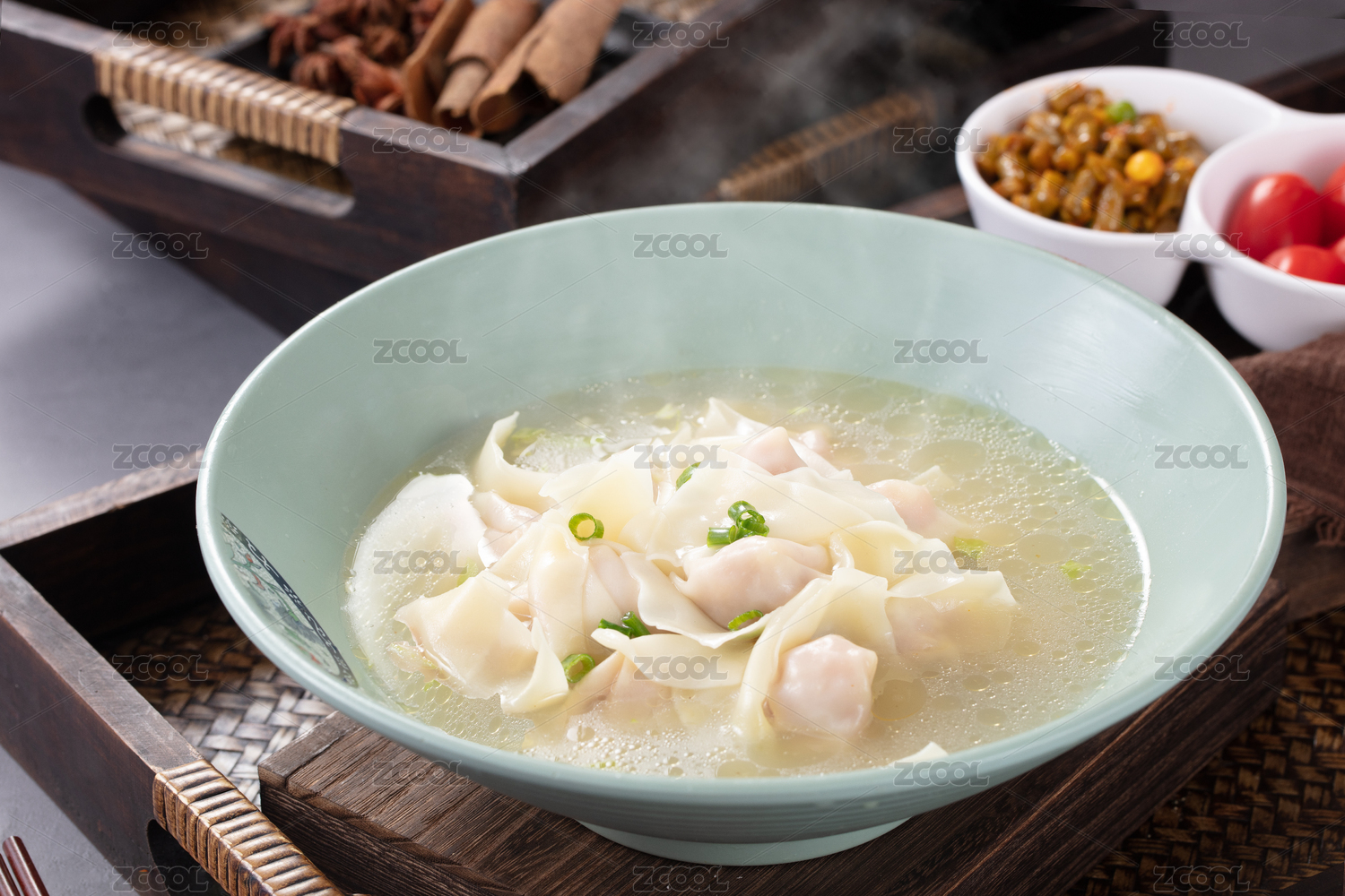 大碗里的勺子盛着的清汤抄手清汤混沌
