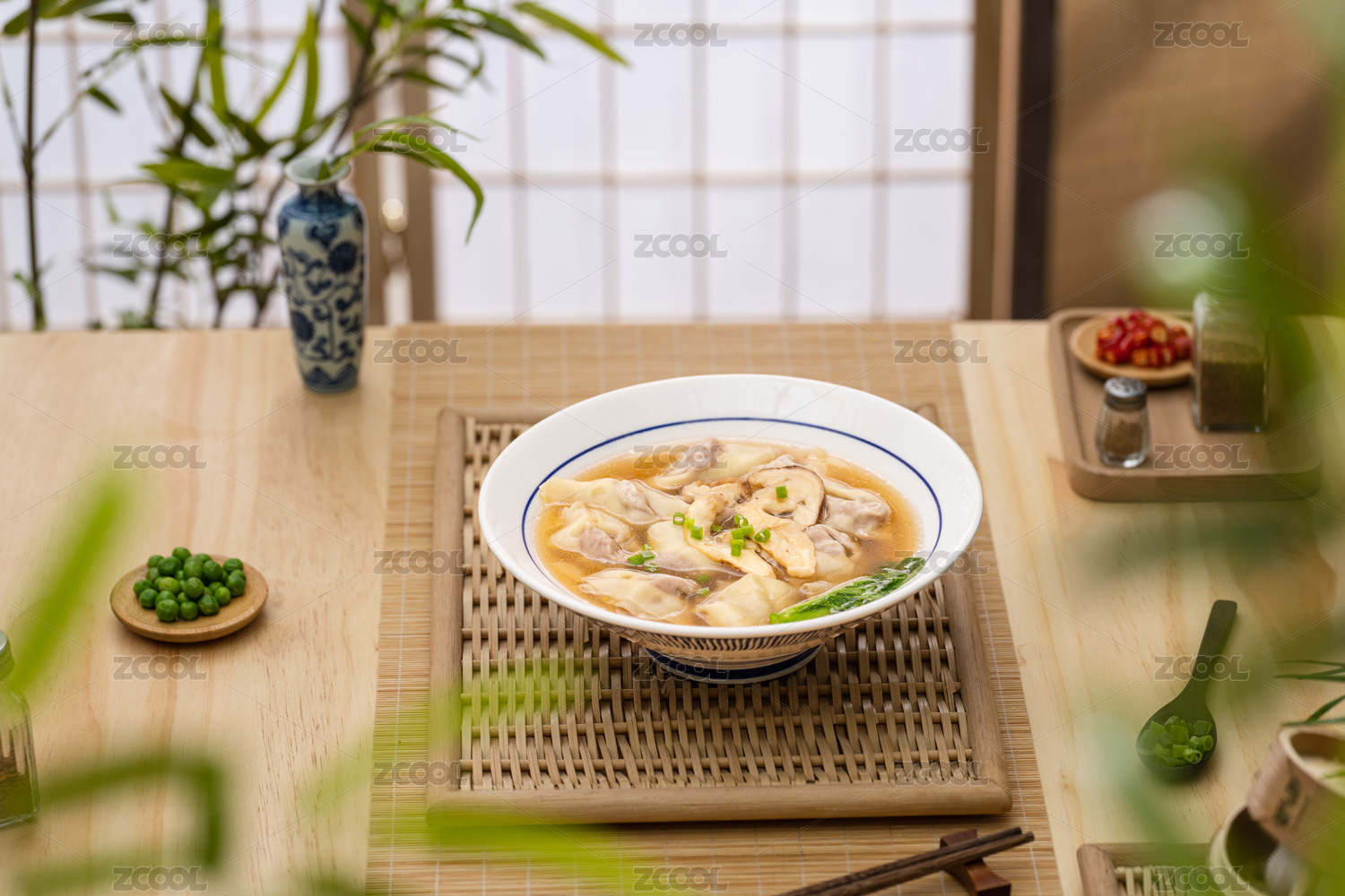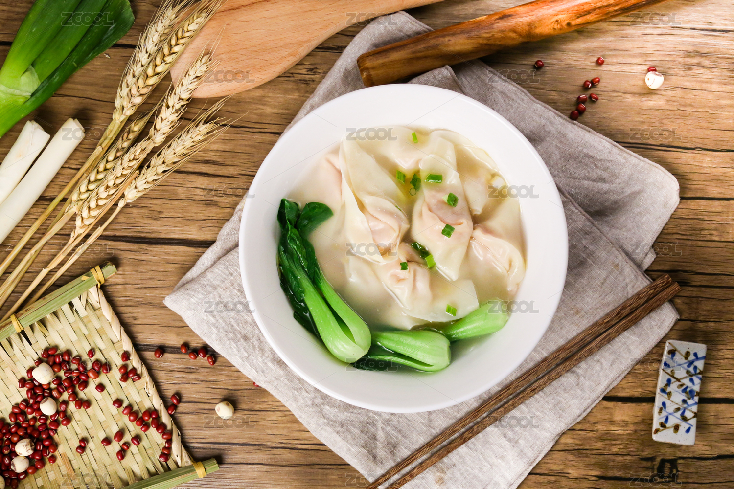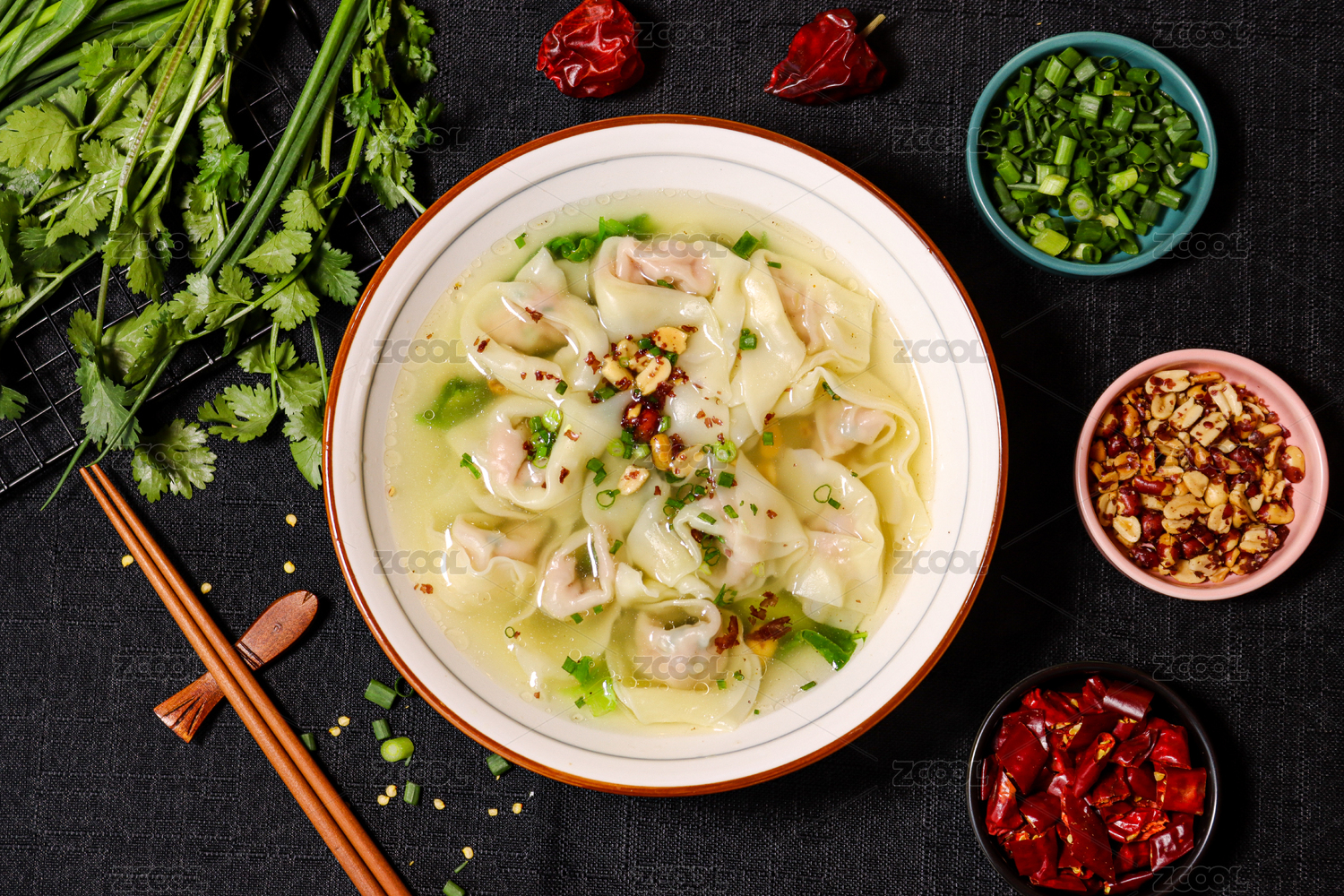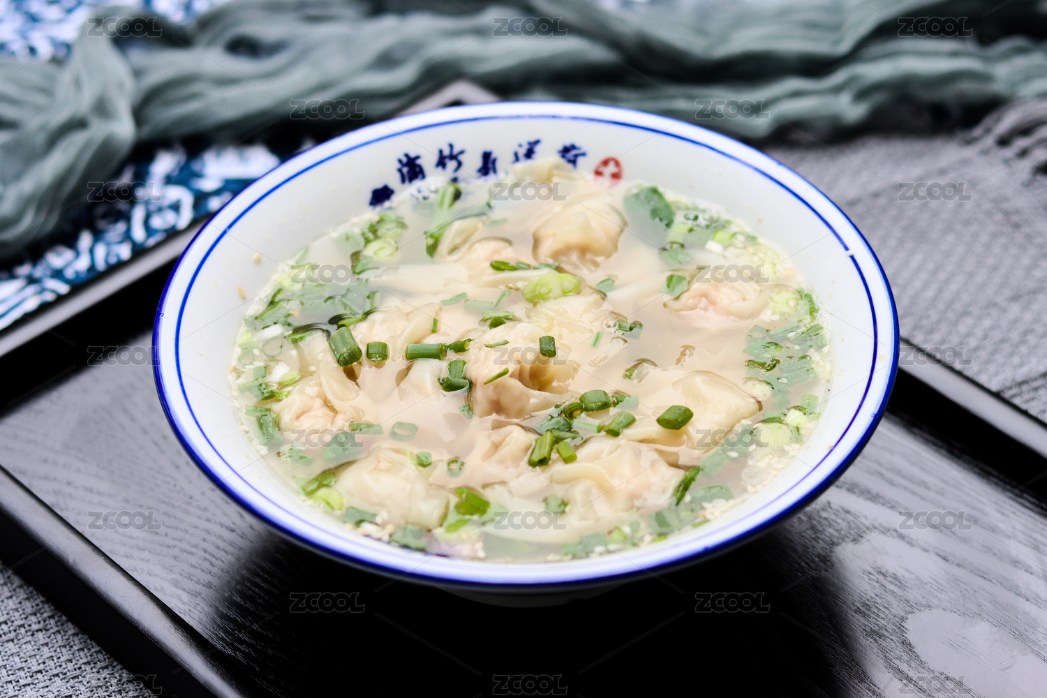 大碗里的勺子盛着的清汤抄手清汤混沌