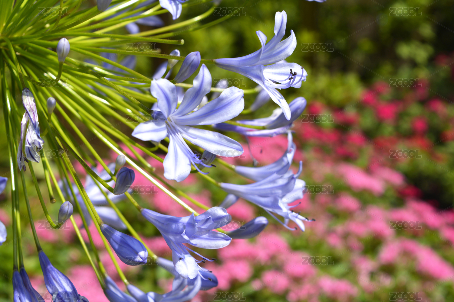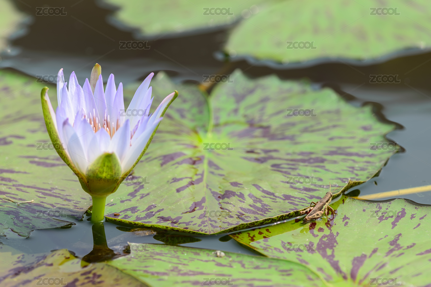 池塘里阳光下的两朵浅紫色睡莲,有倒影