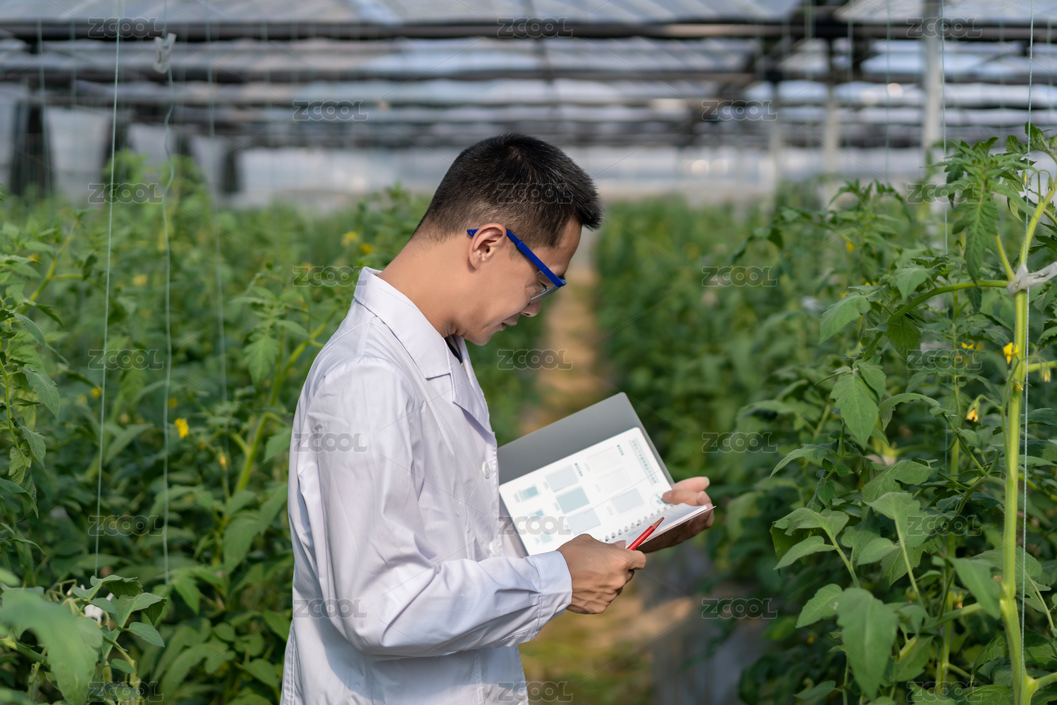 钢架大棚内一名东方男性研究人员在对西红柿的生长情况进行观察记载,中国福建省龙岩