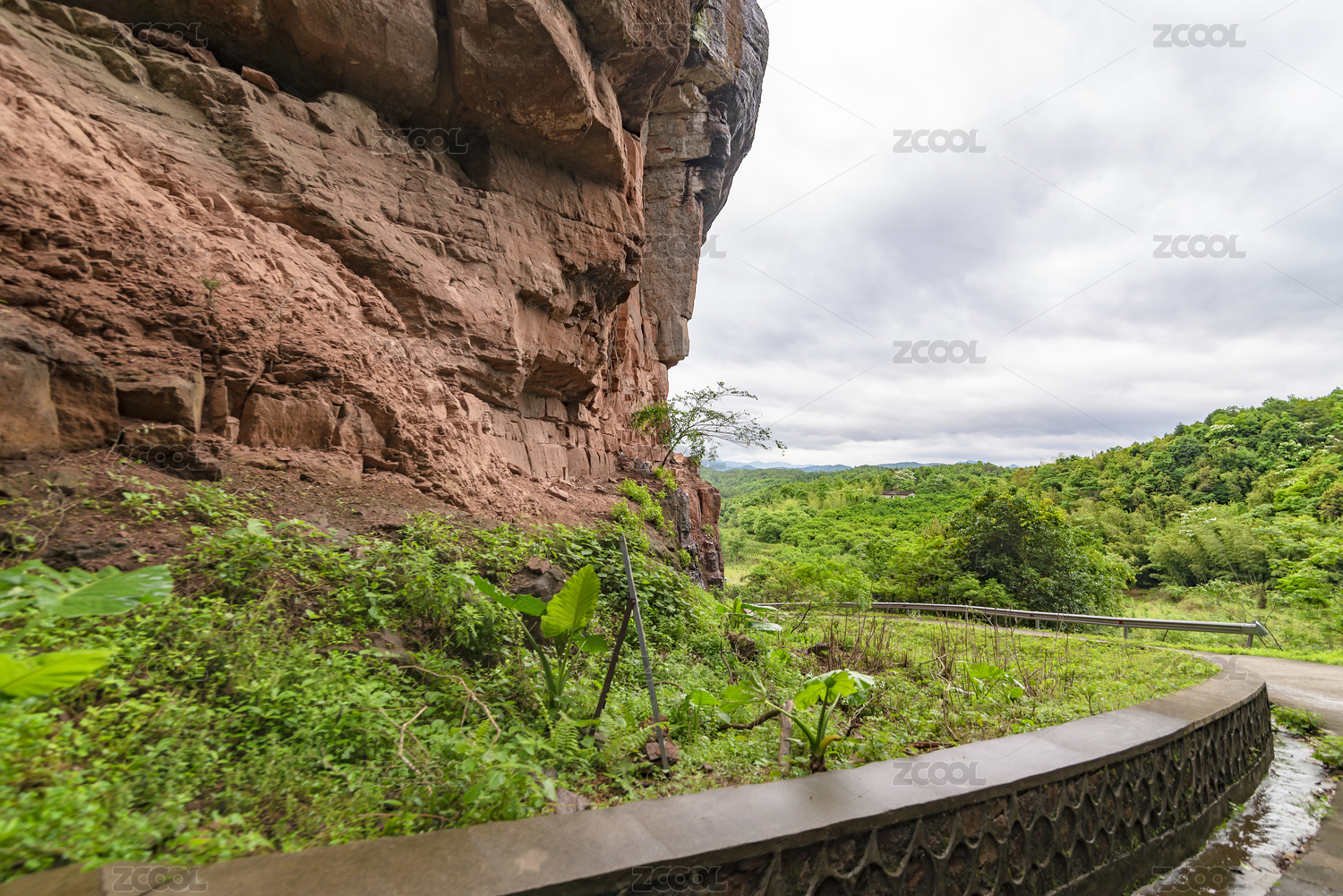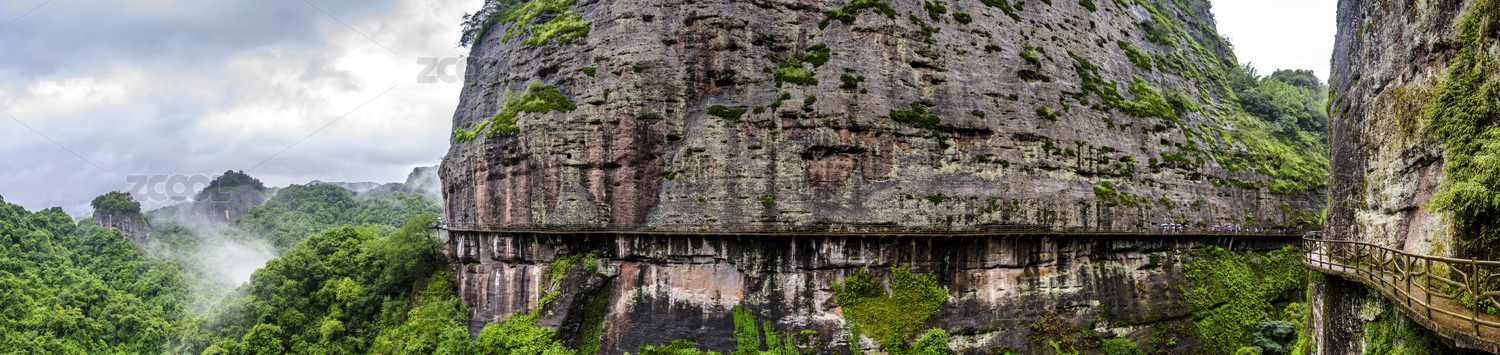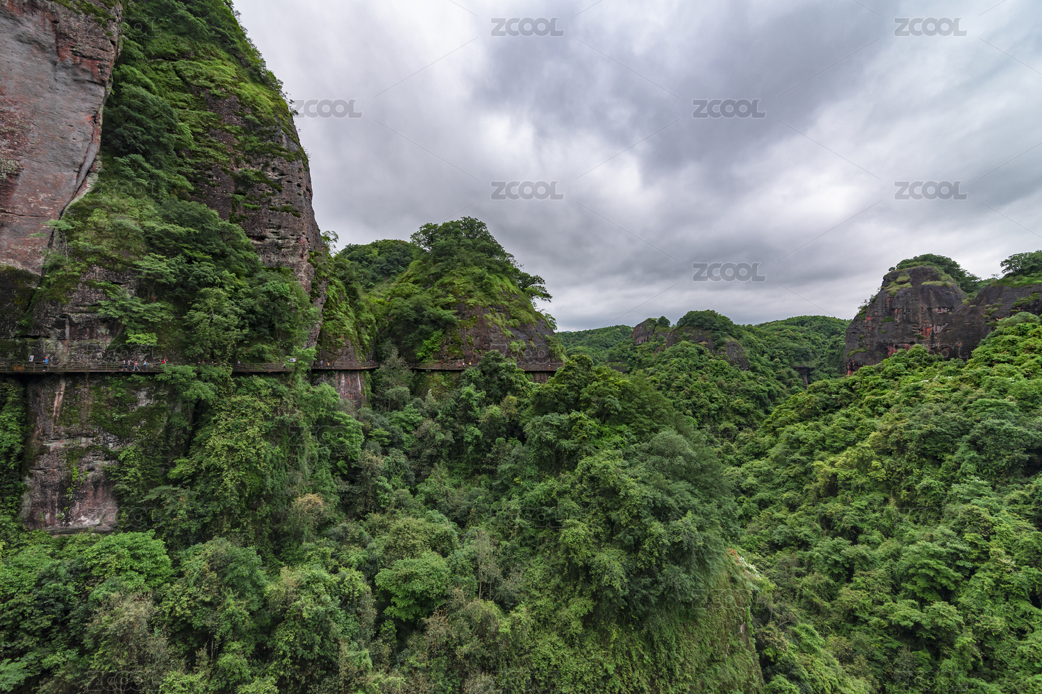 平远五指石景区中壮观的丹霞山及山谷中茂盛的植被,中国广东平远