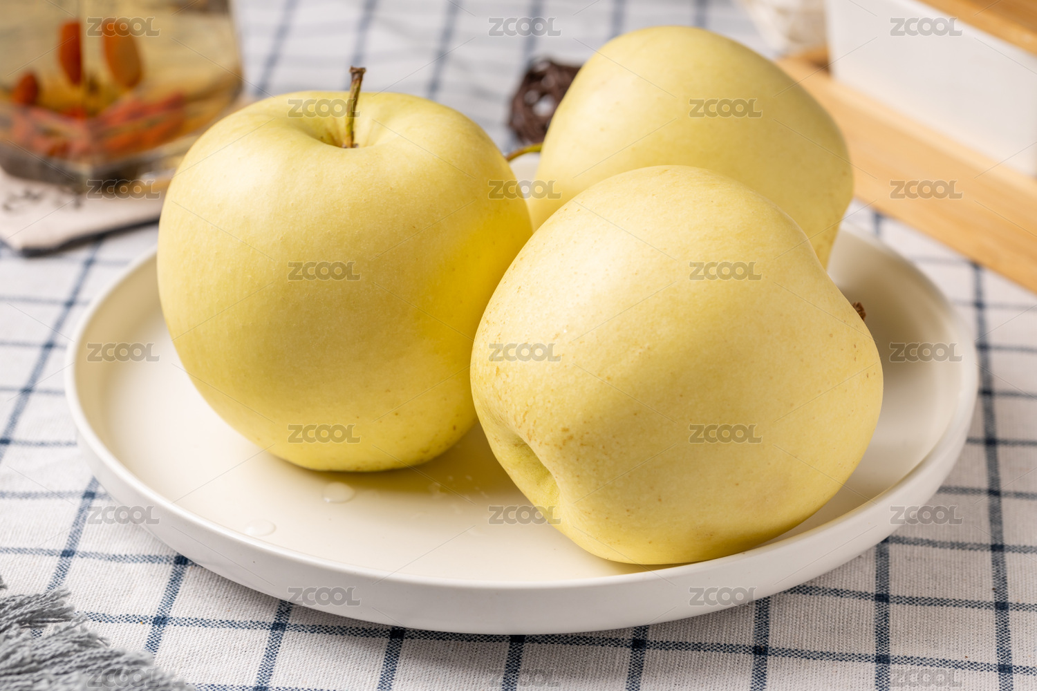 黑底上放着三个完整的烟台黄金奶油富士苹果
