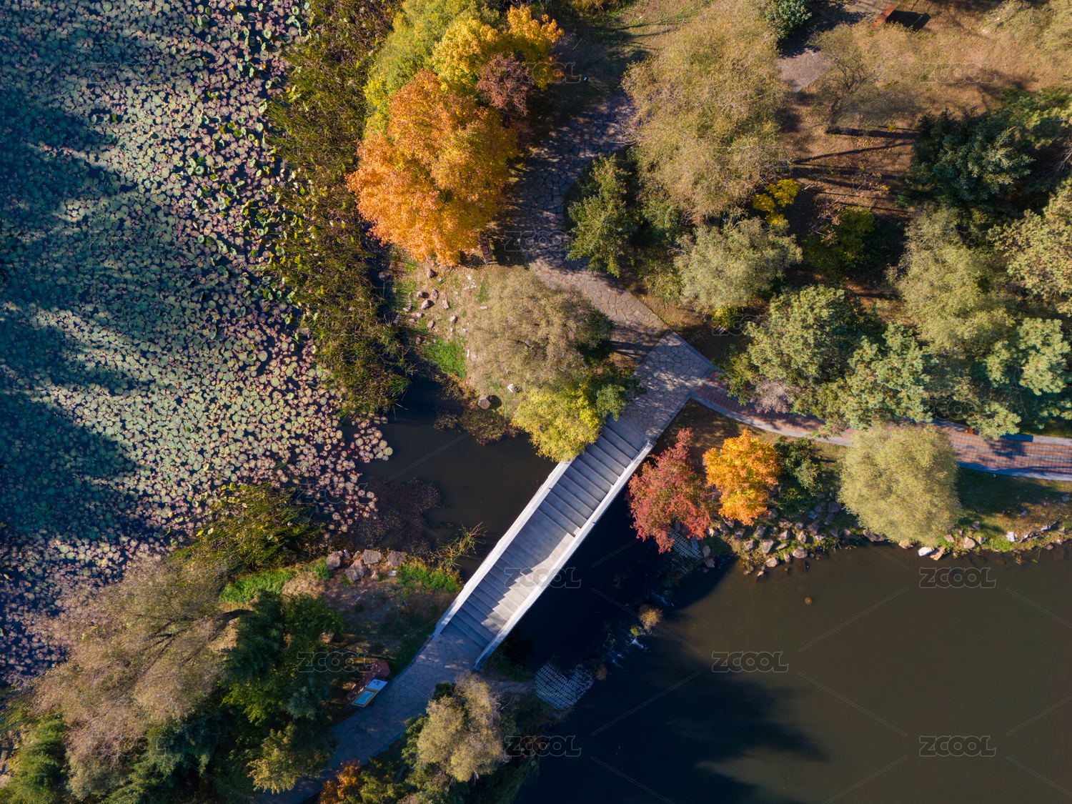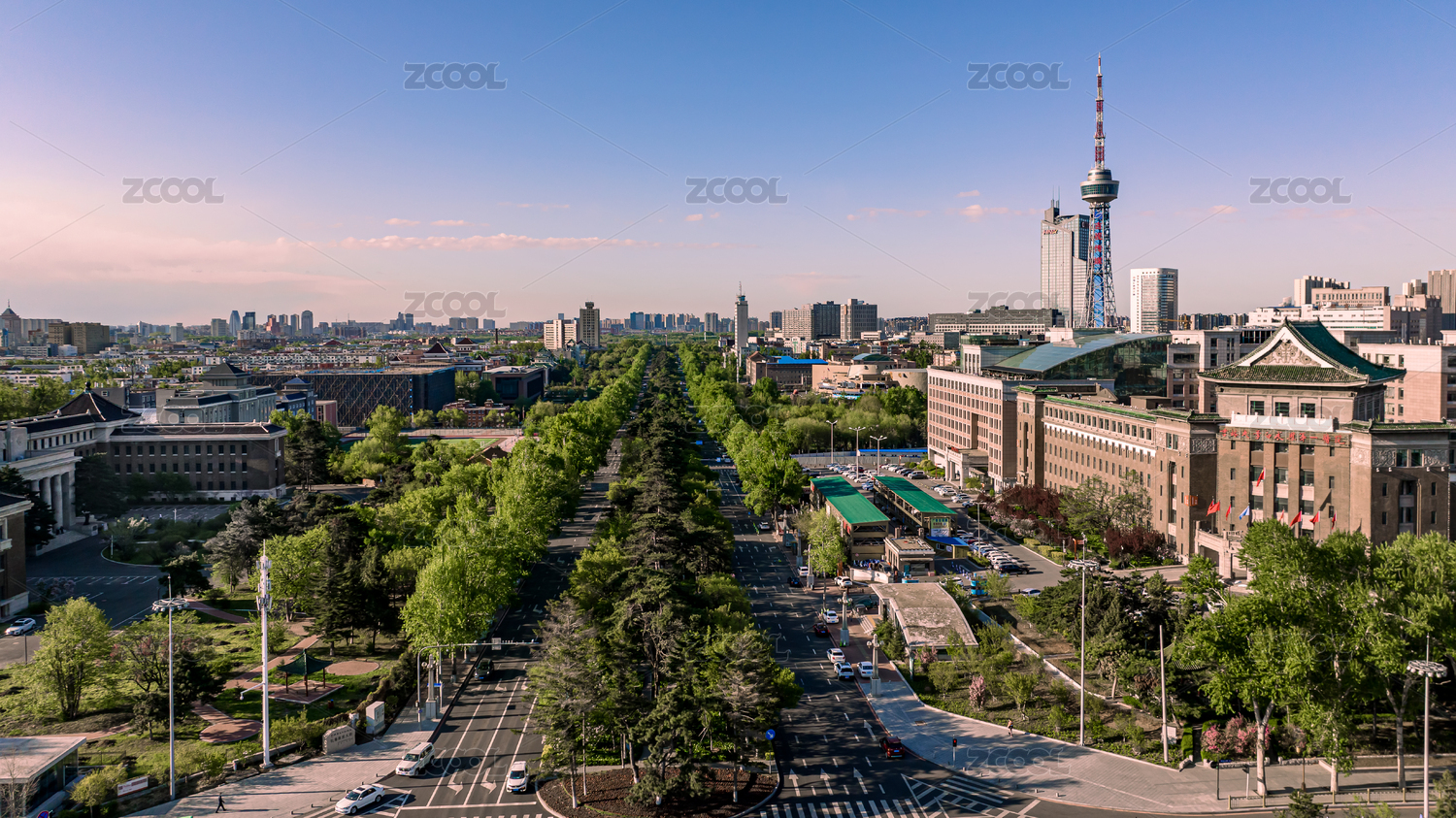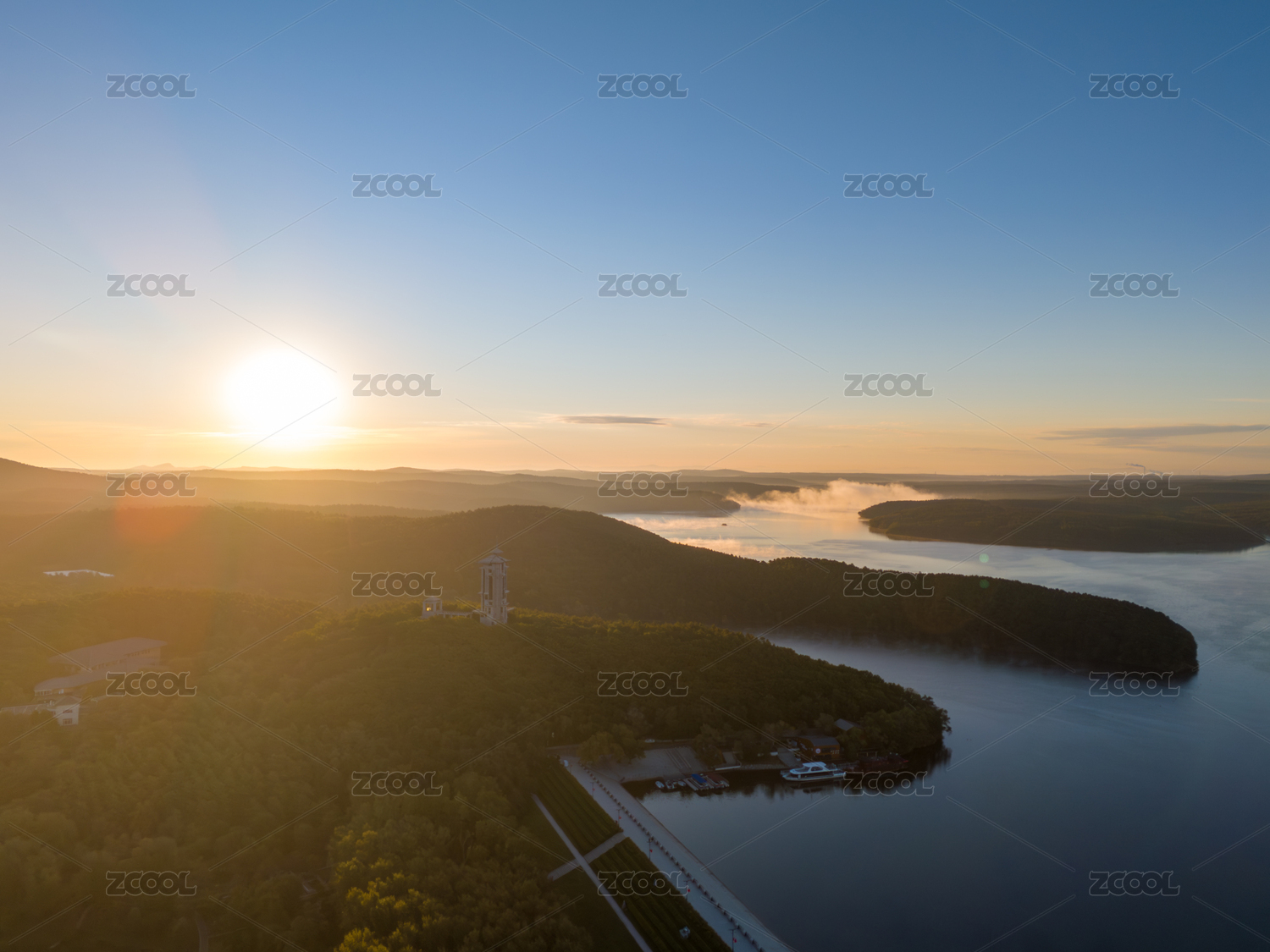 吉林省长春市净月潭日出时分的小镇航拍美景