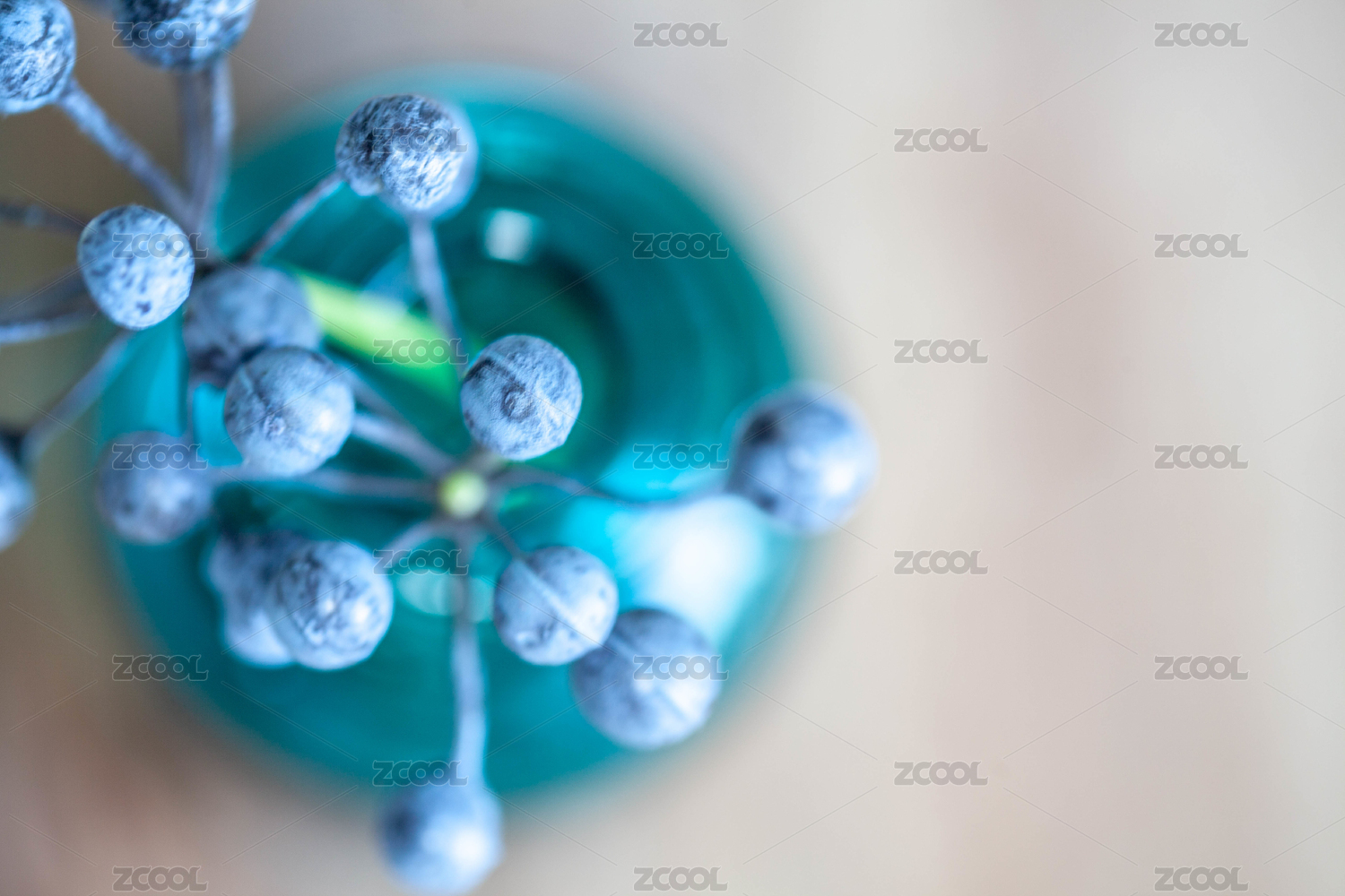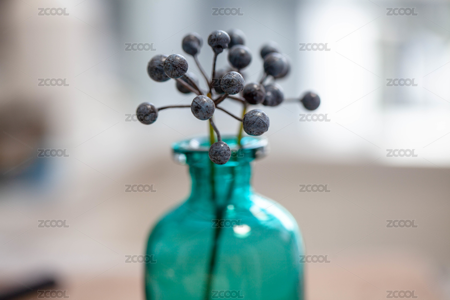 紫色的豆豆装饰花卉插在翡翠绿的小花瓶里
