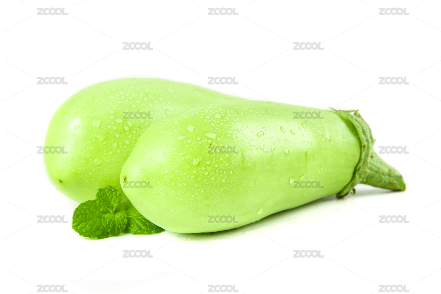 白底上放着两个完整的翡翠绿茄子