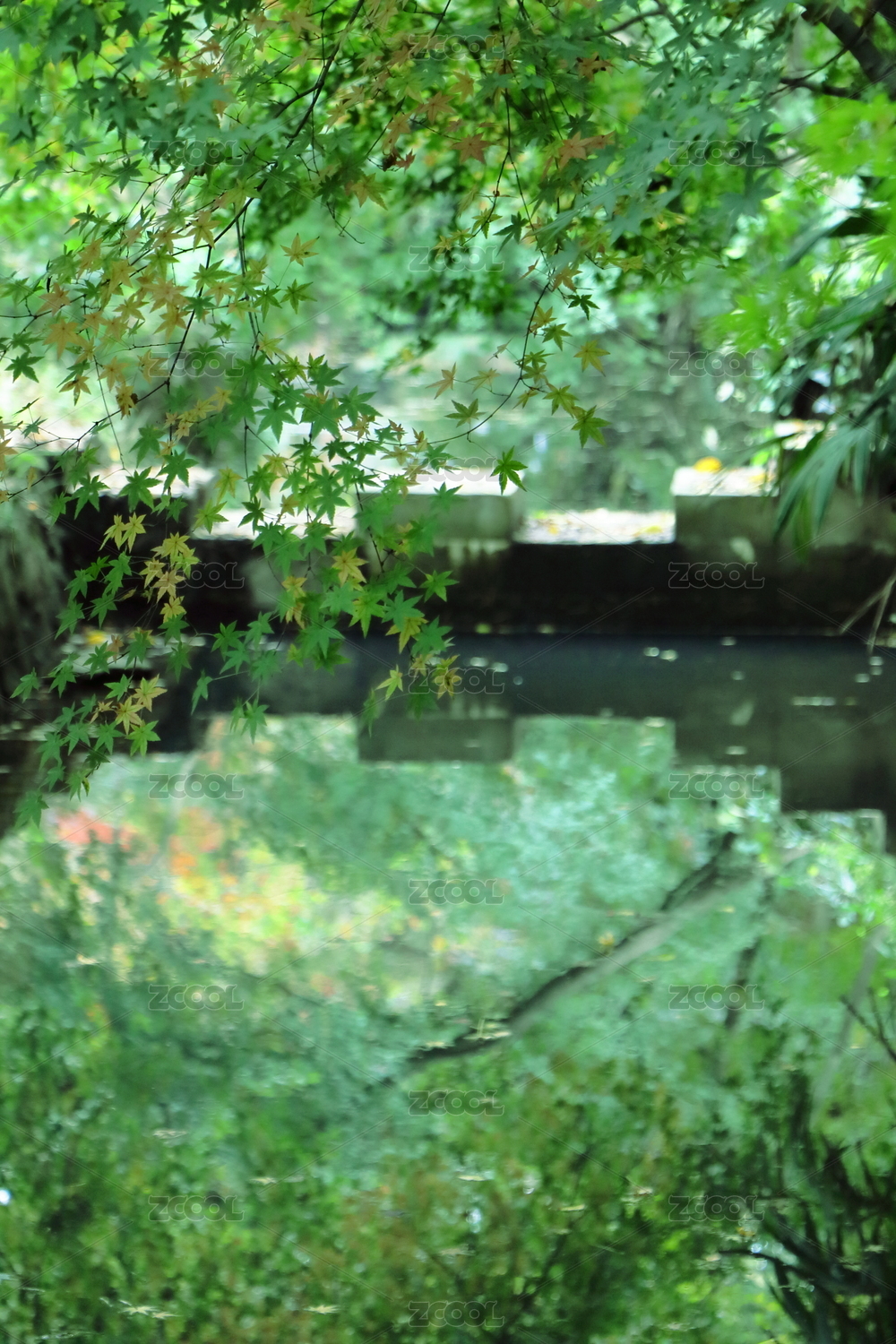 翡翠绿色枫林下湖水倒映着桥的影子