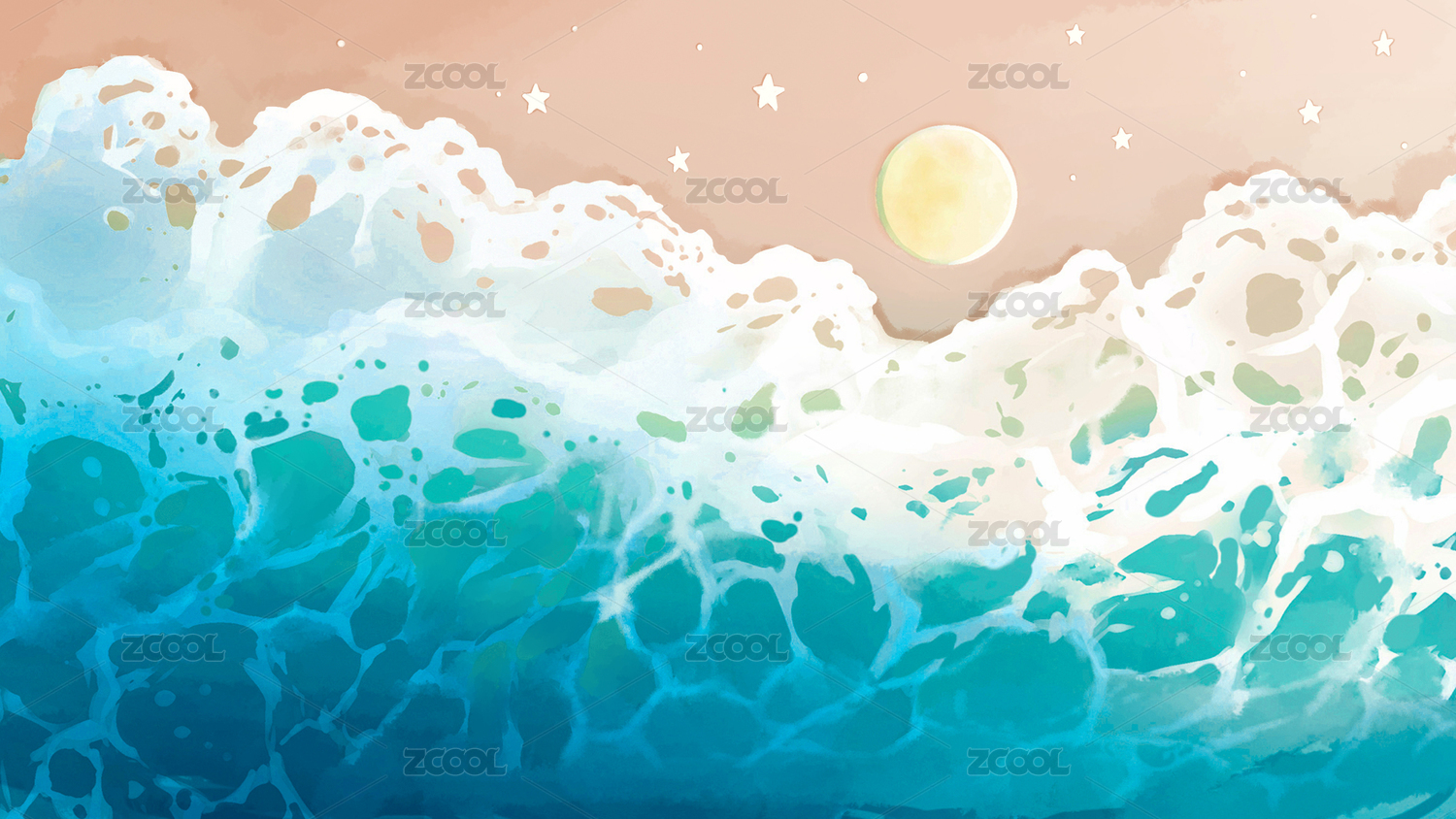 侧面拍摄金色沙滩以及蓝色的海水、白色的波浪
