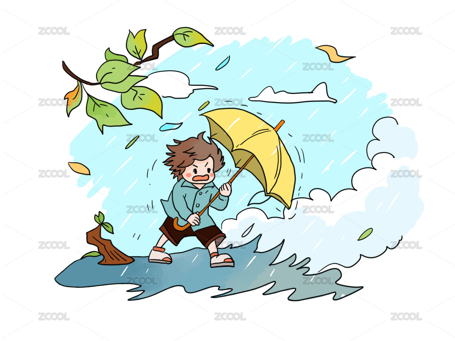 下雨天穿黄色雨衣男孩在台风下打伞行走漫