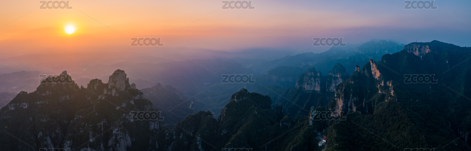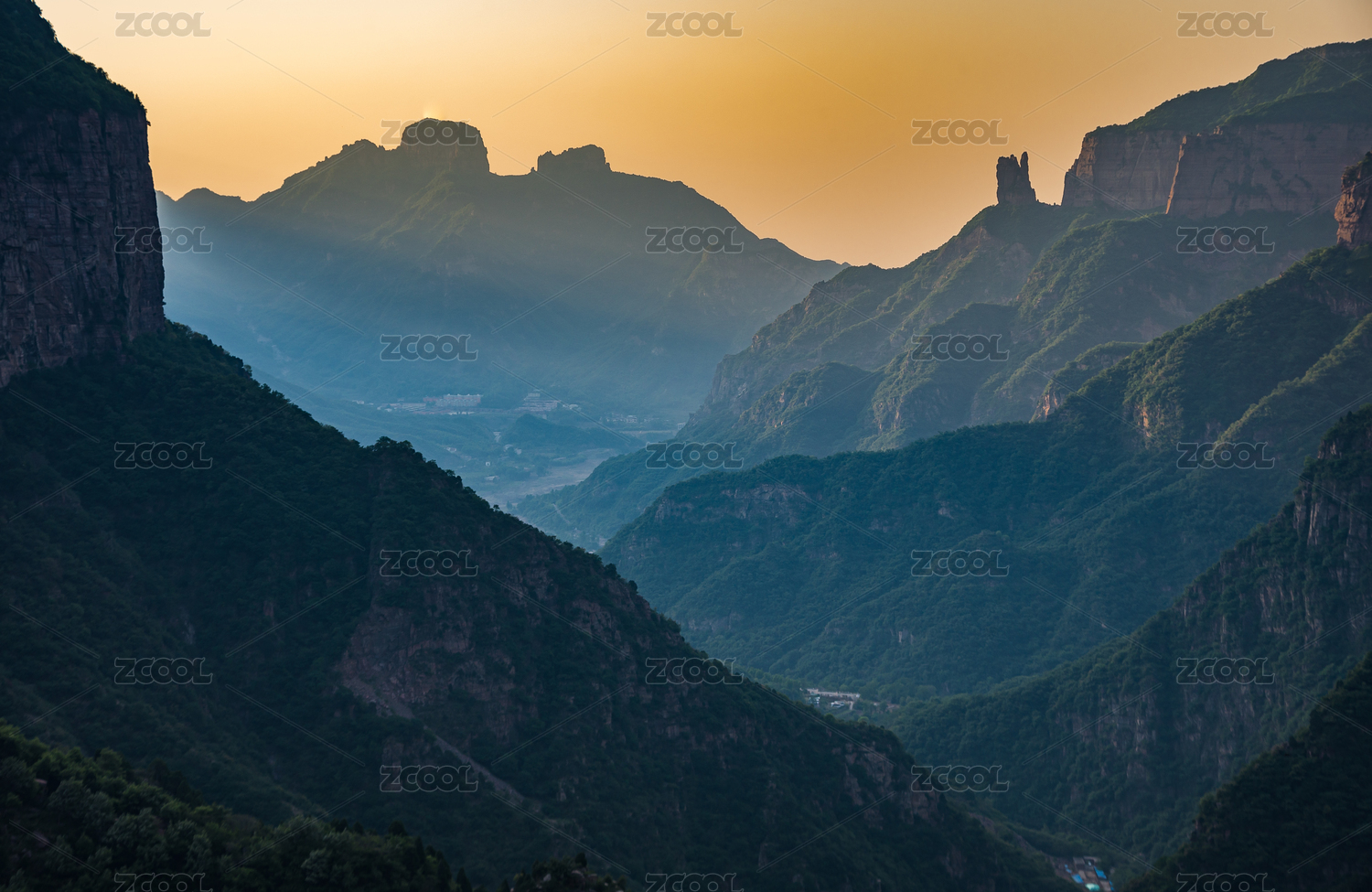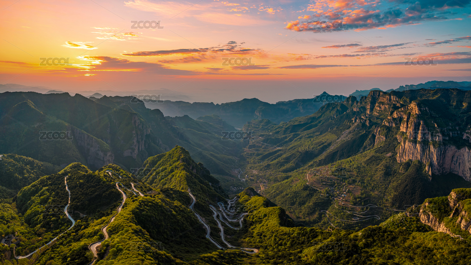 航拍中国山西太行山晨辉中的王莽岭景区入口