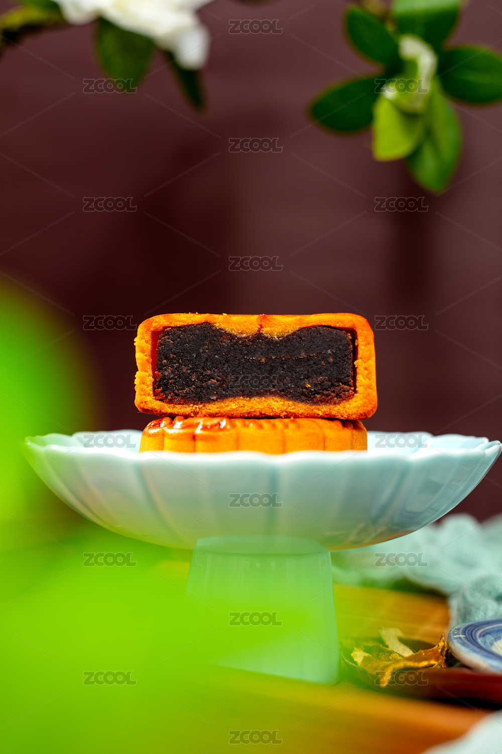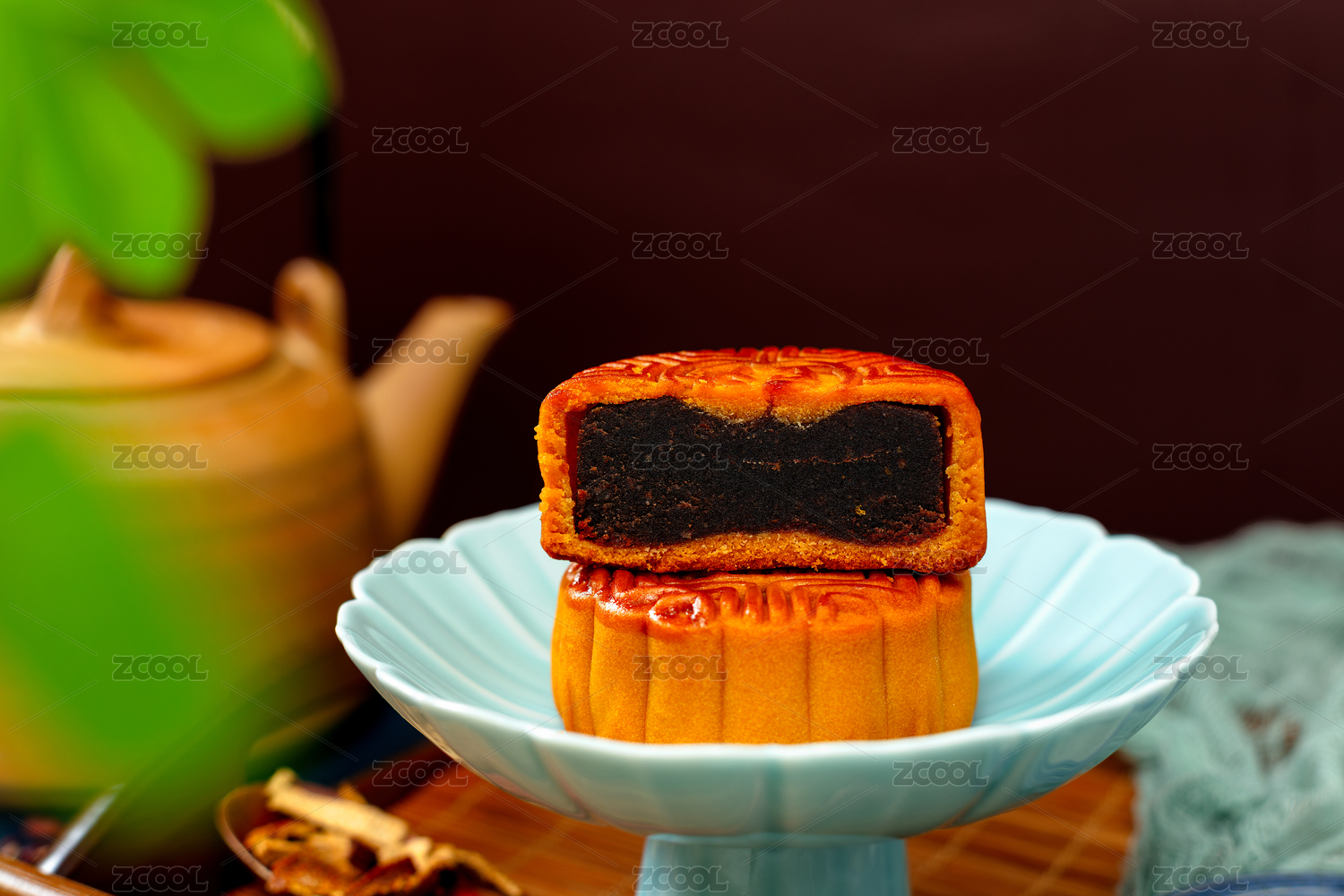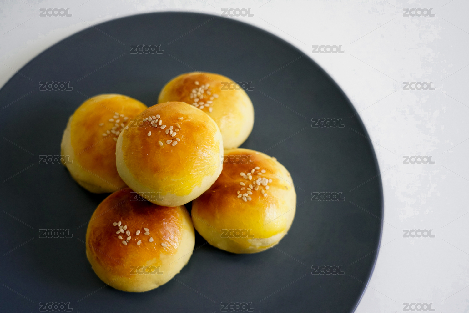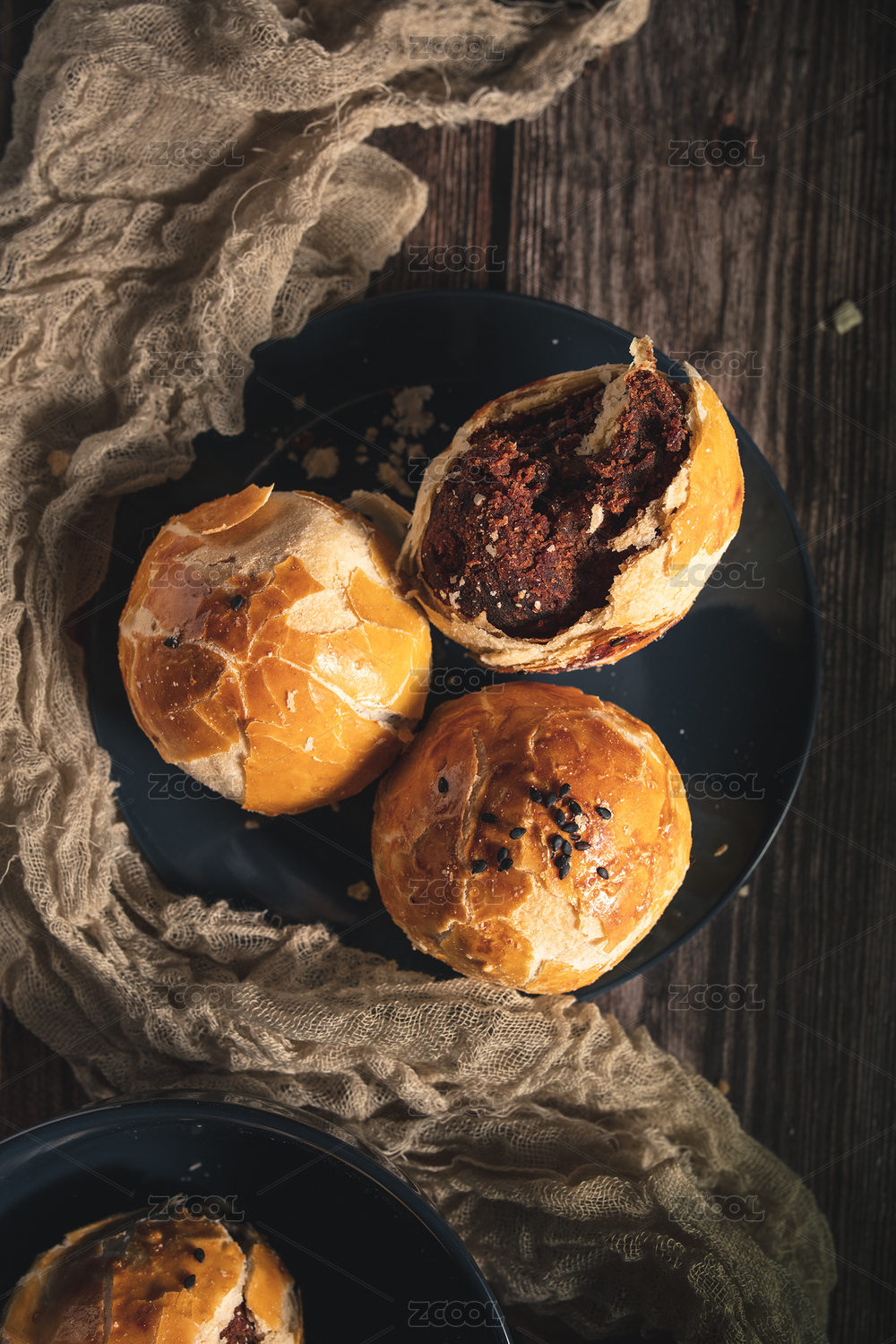 木质桌面上米色餐巾旁黄色蛋黄酥漏出红色豆沙馅