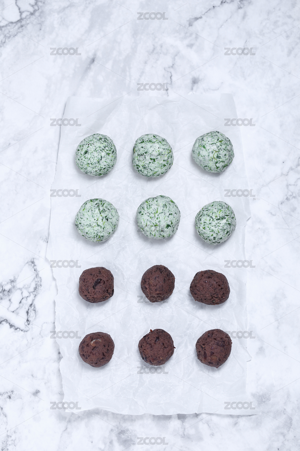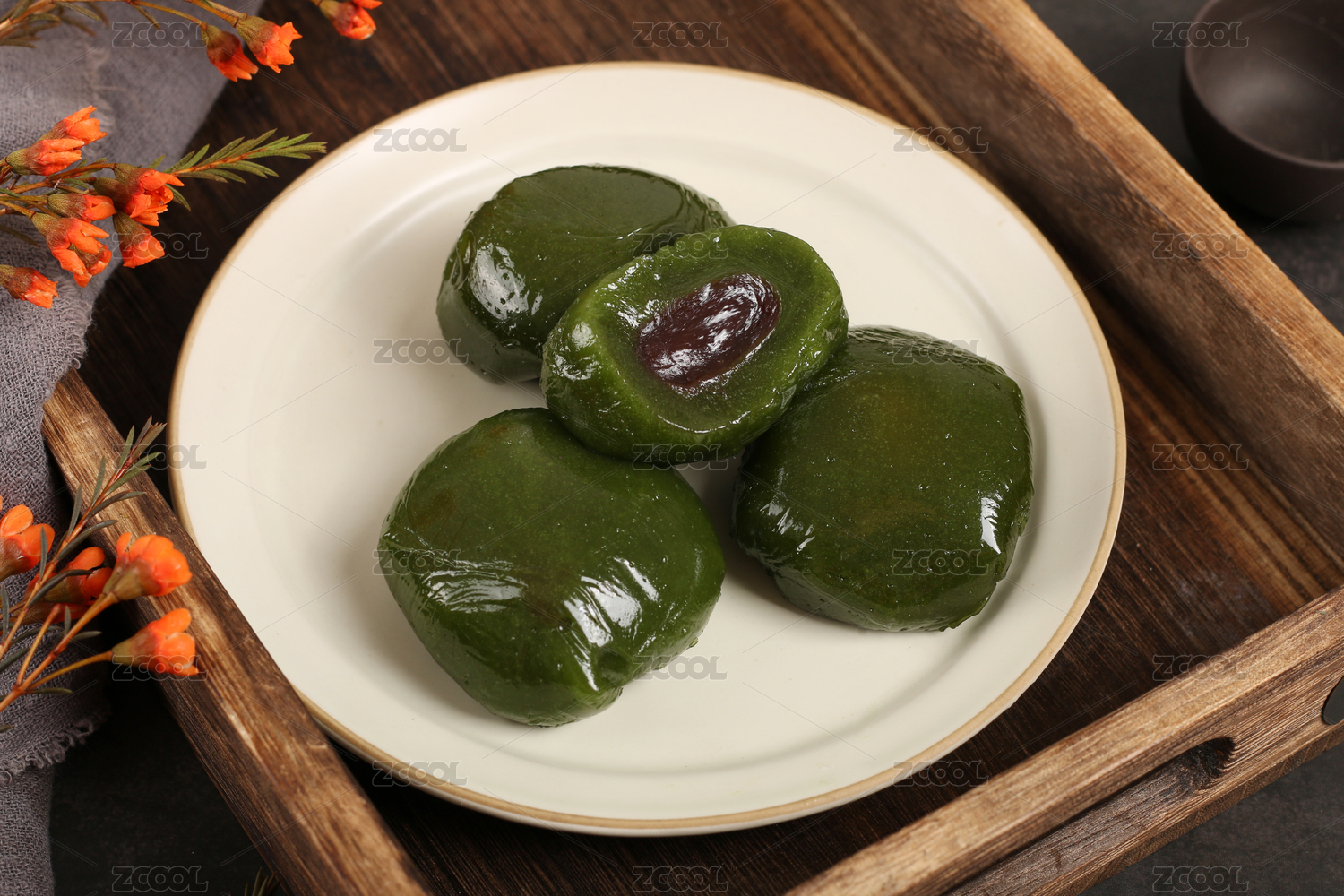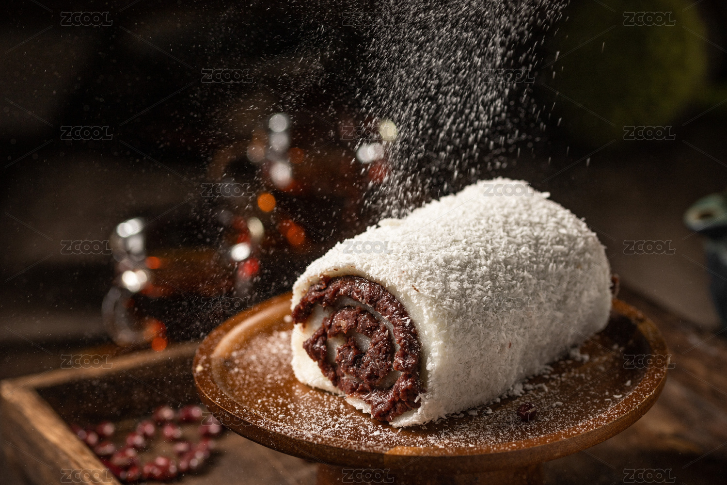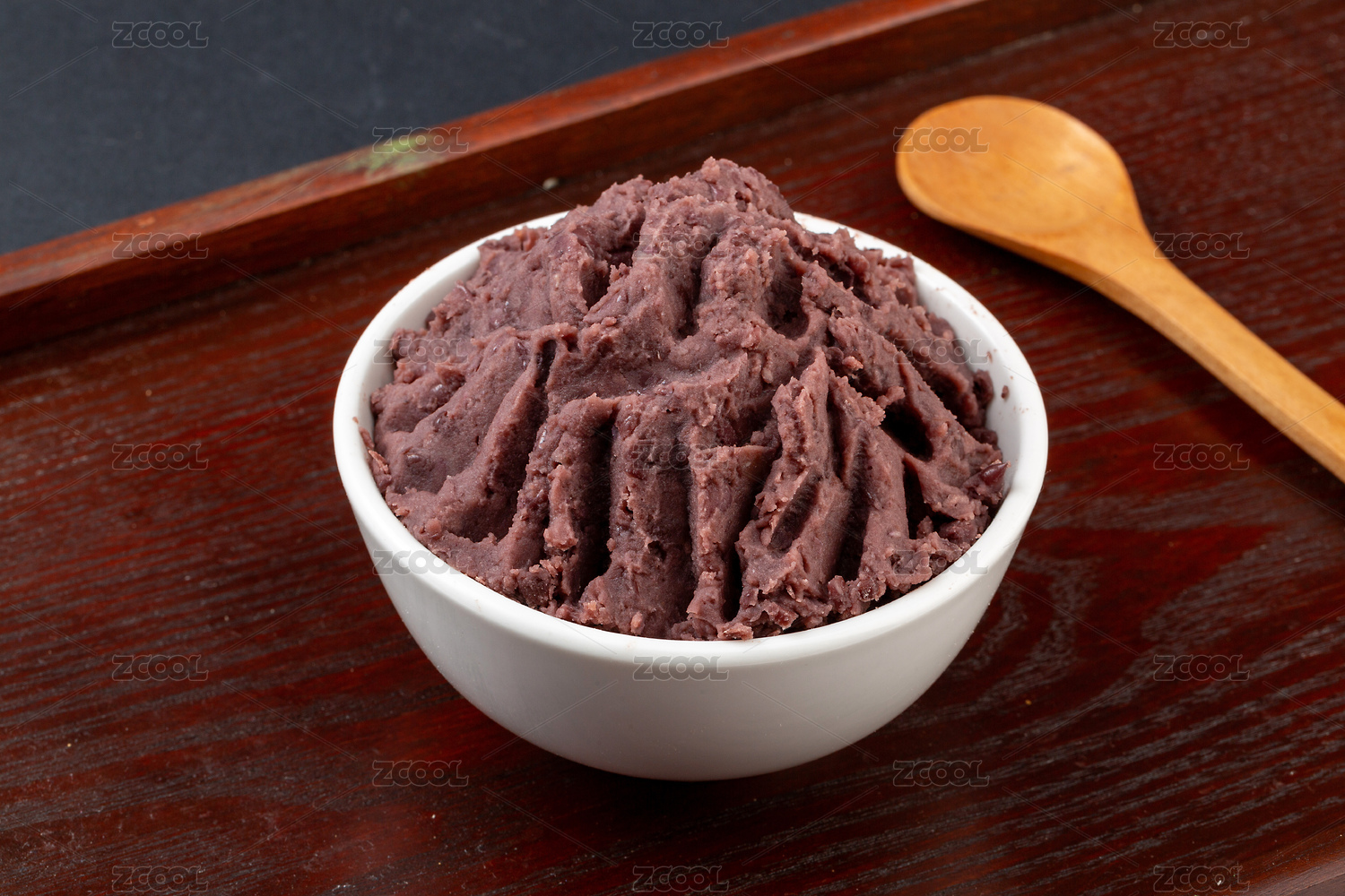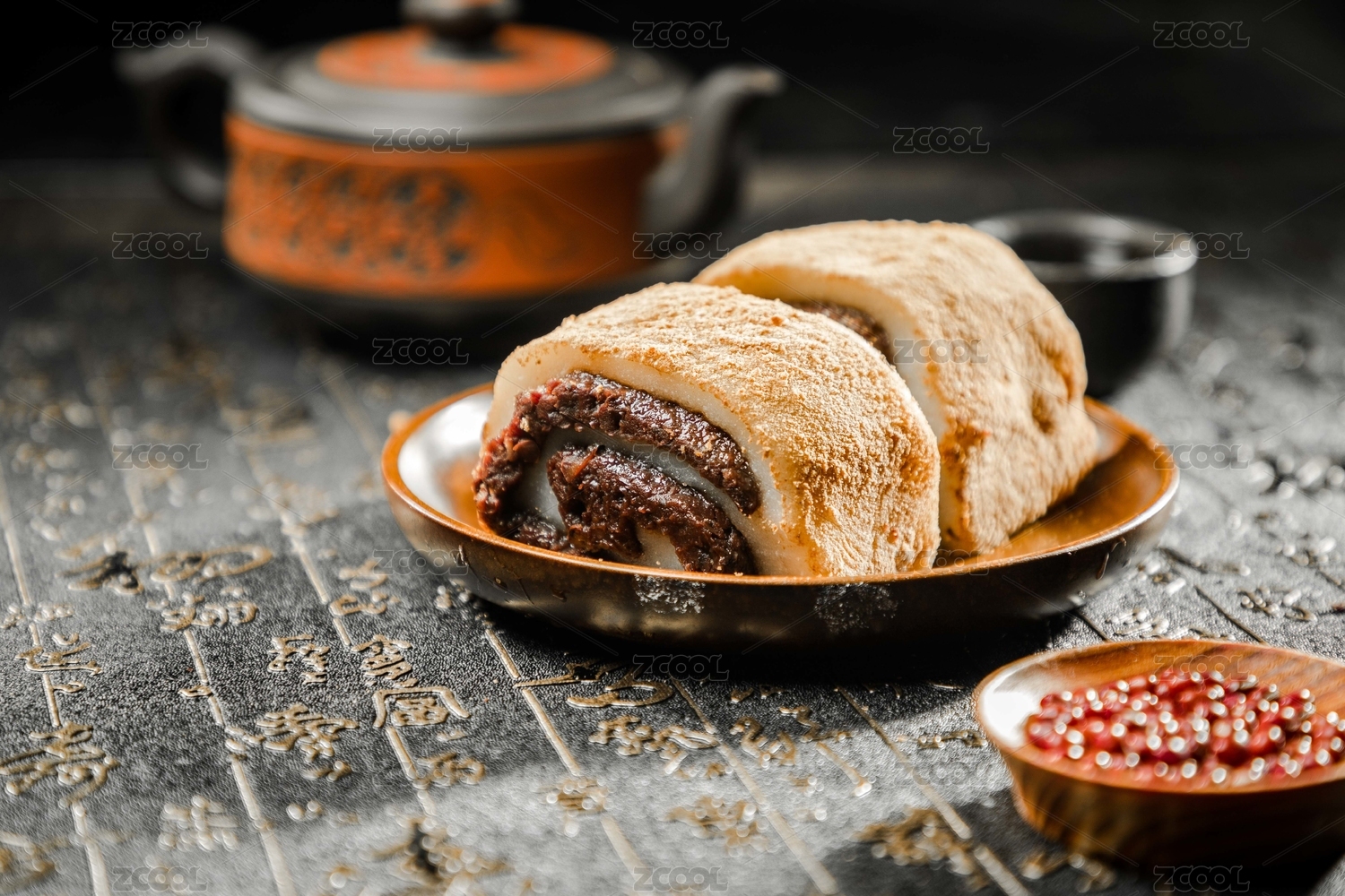 木质桌面上米色餐巾旁黄色蛋黄酥漏出红色豆沙馅