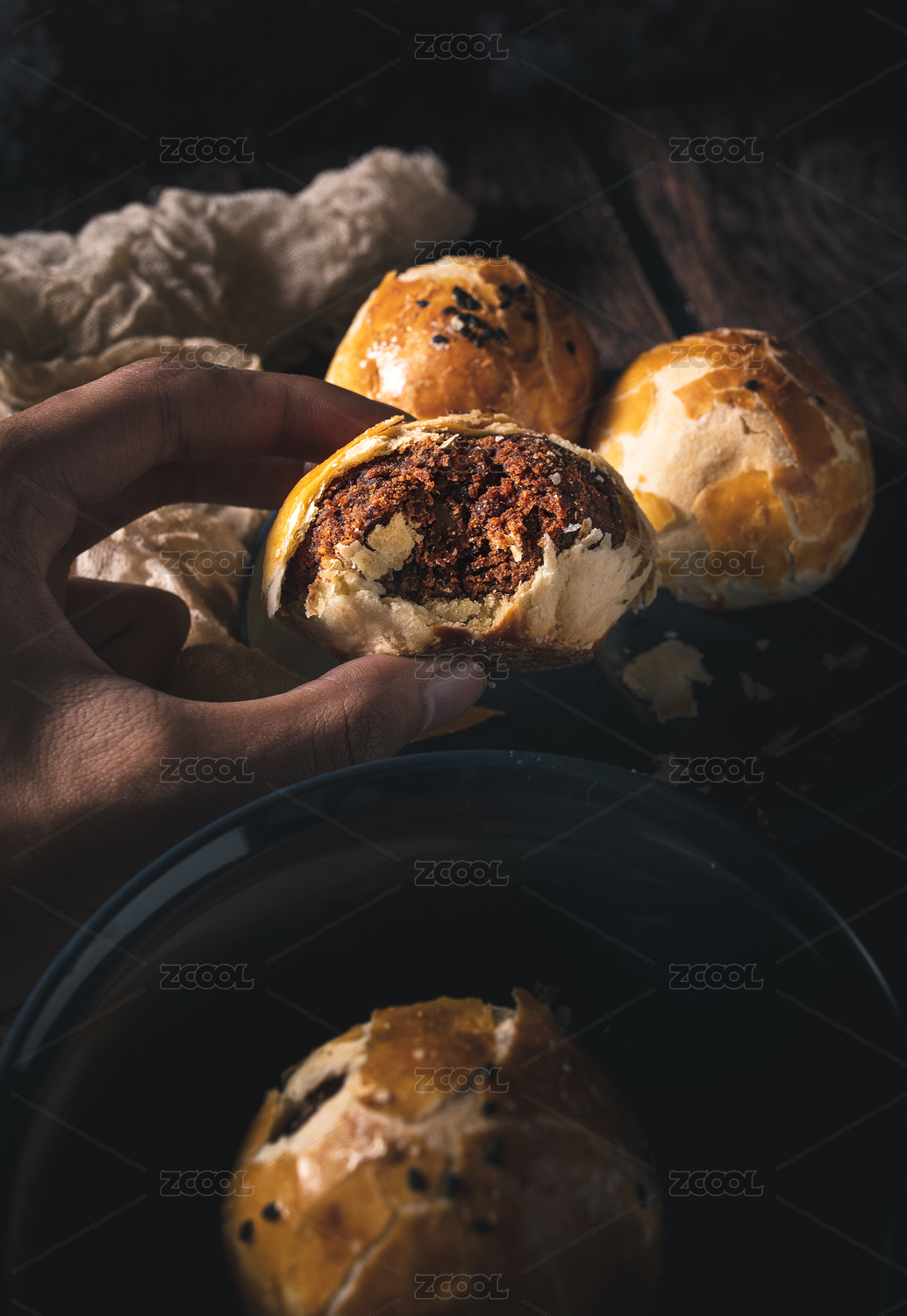 手拿一块木质桌面上黄色蛋黄酥漏出红色豆沙馅