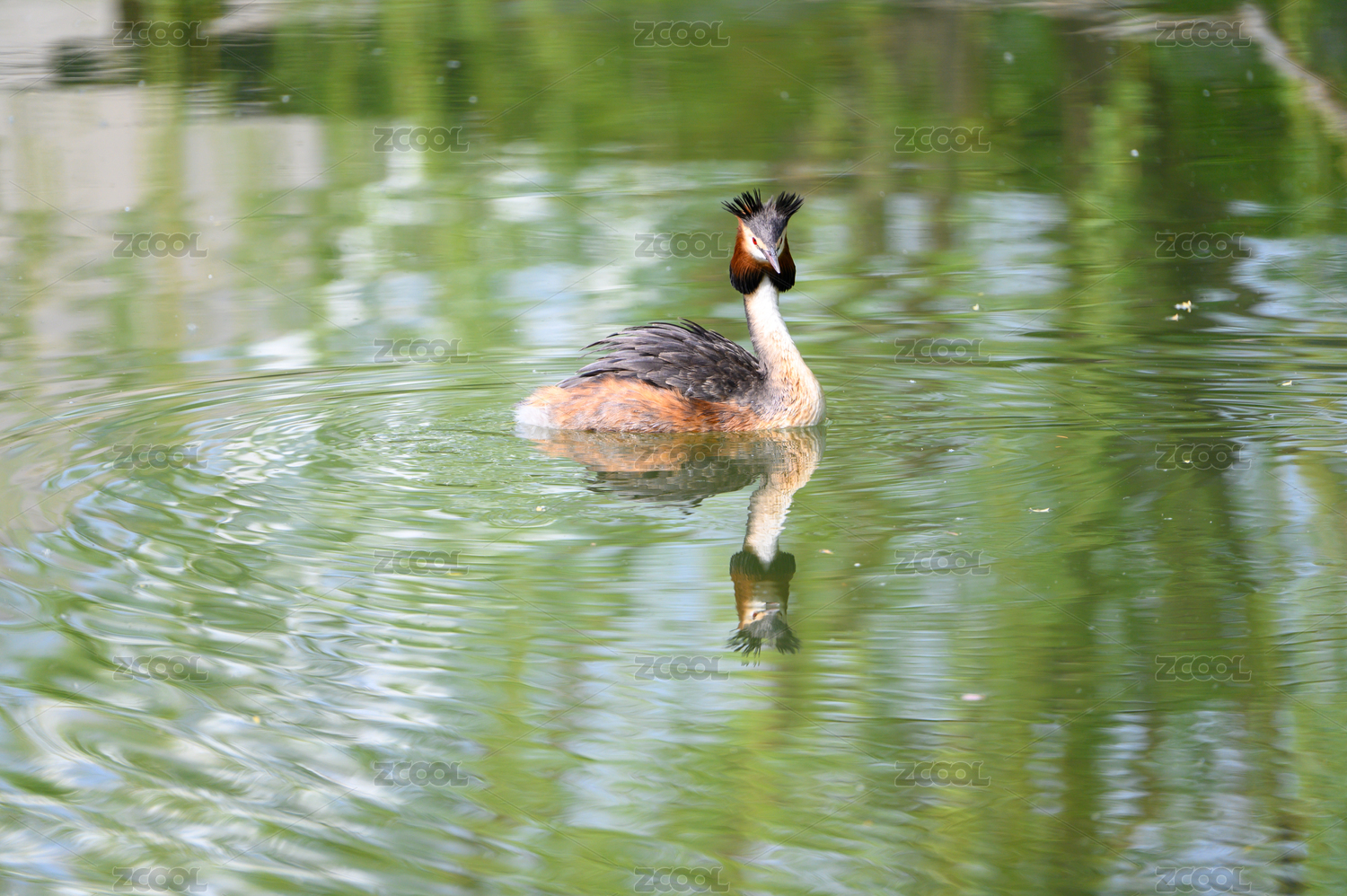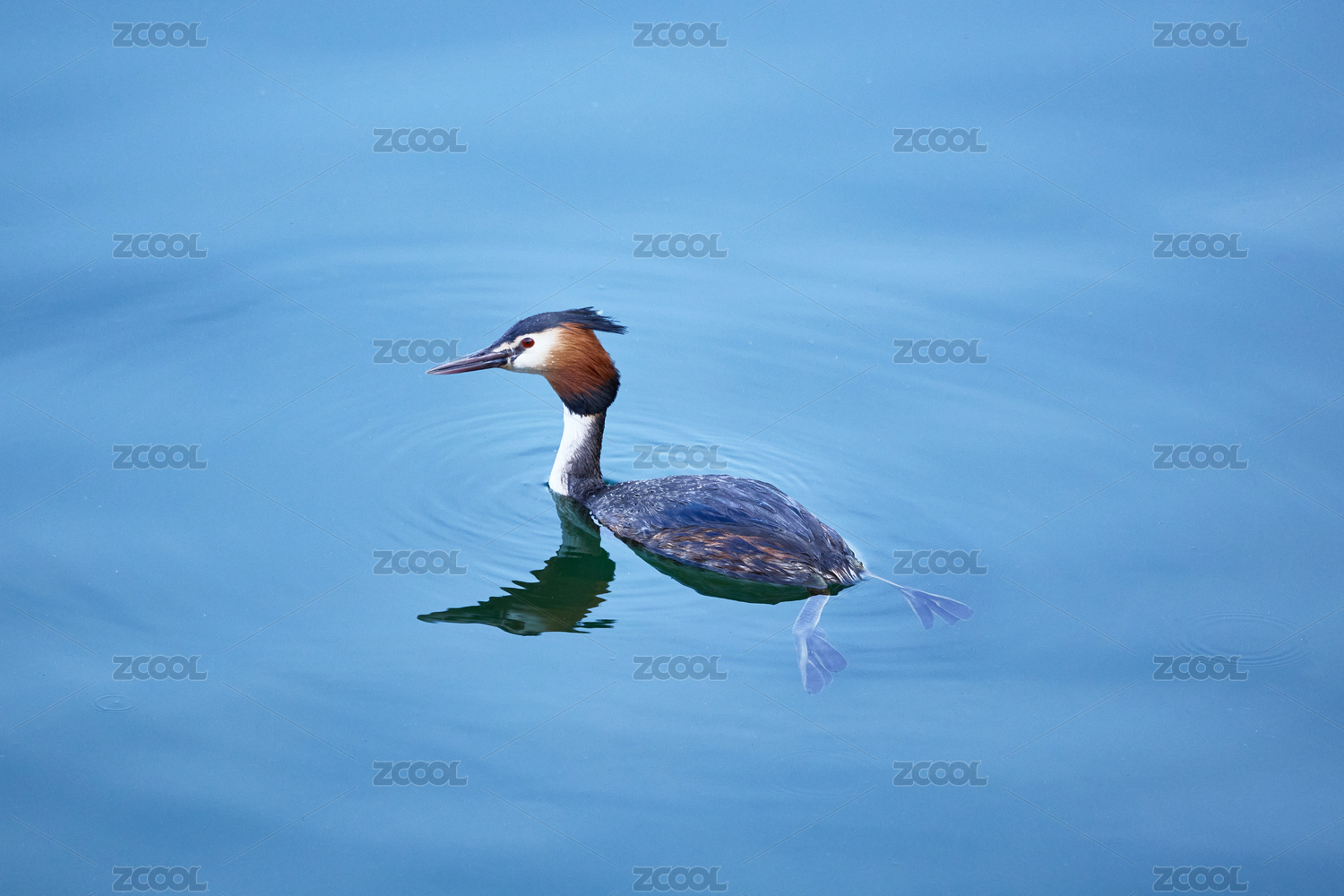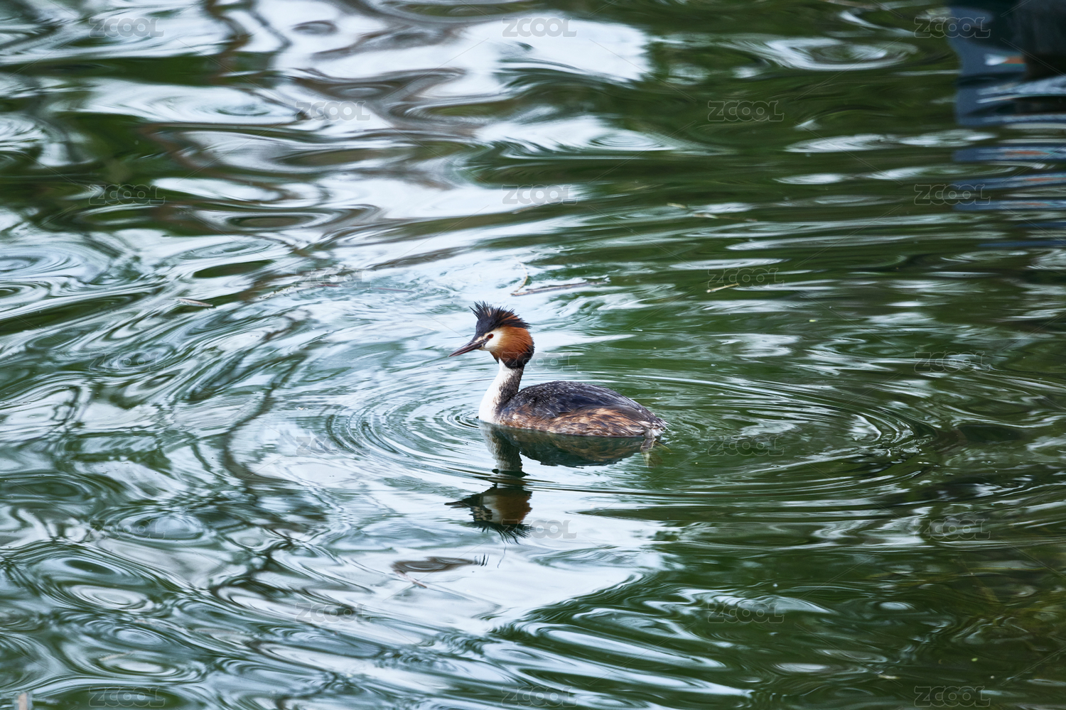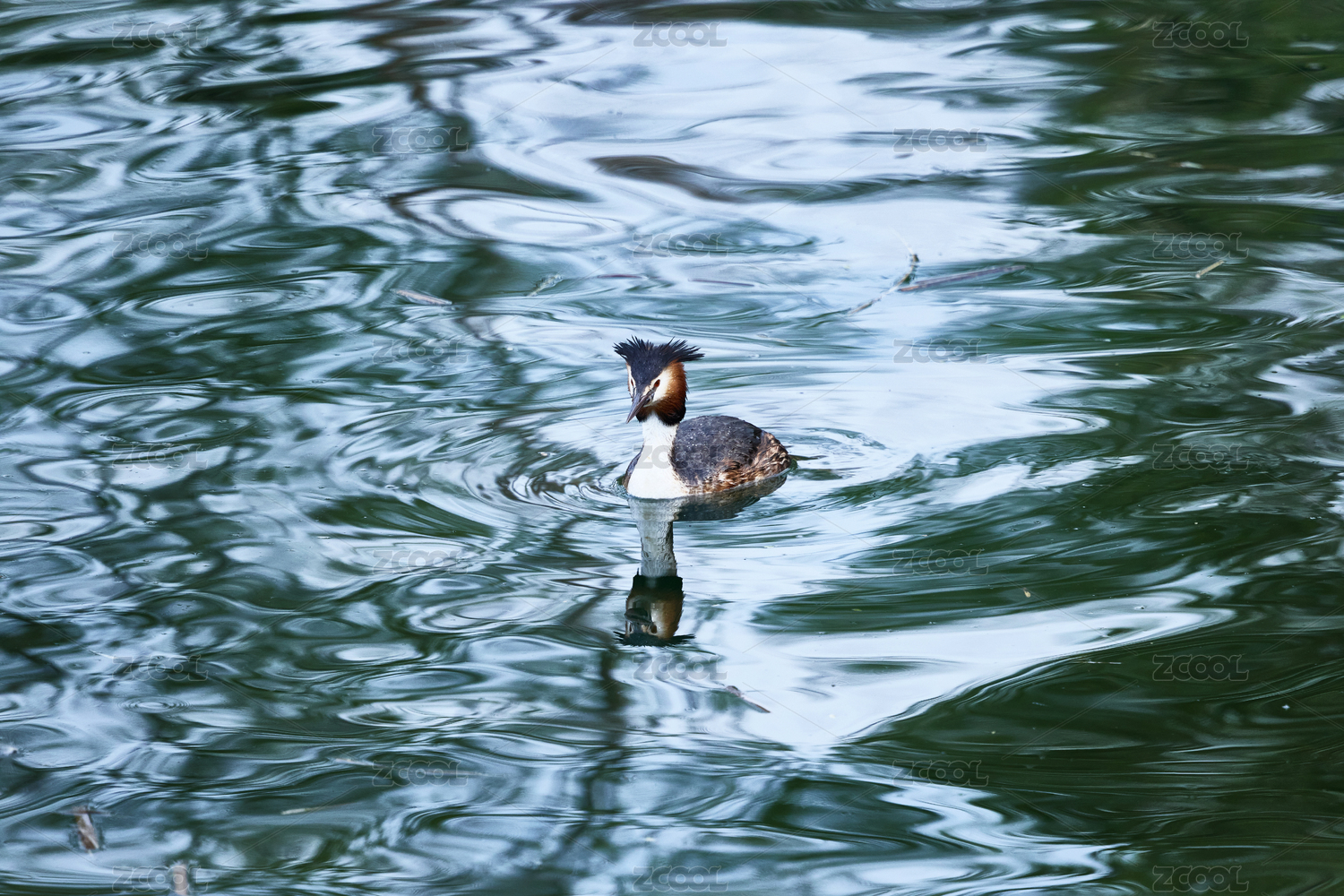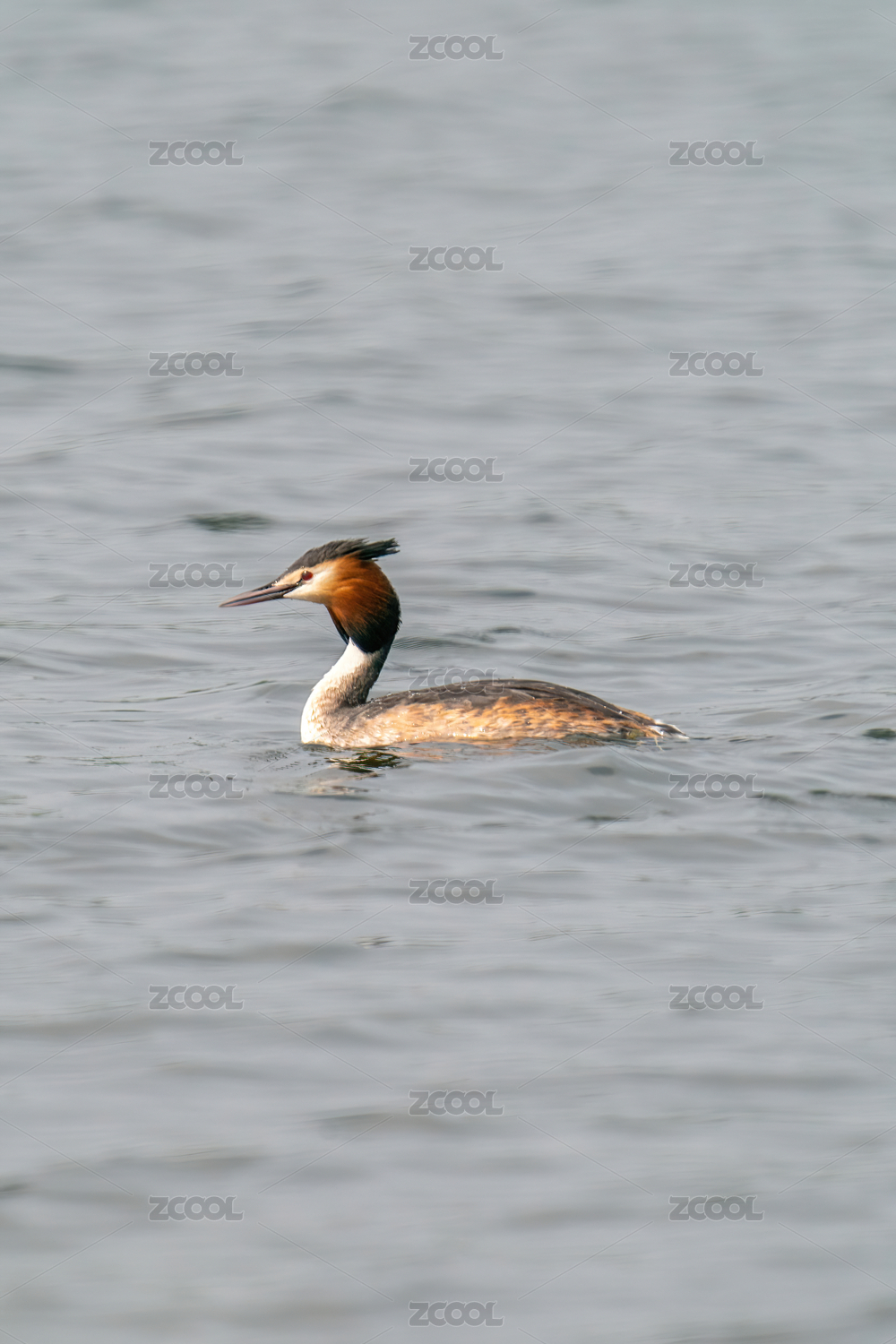水面上游动的水鸟凤头鸊鷉特写 凤头䴙䴘